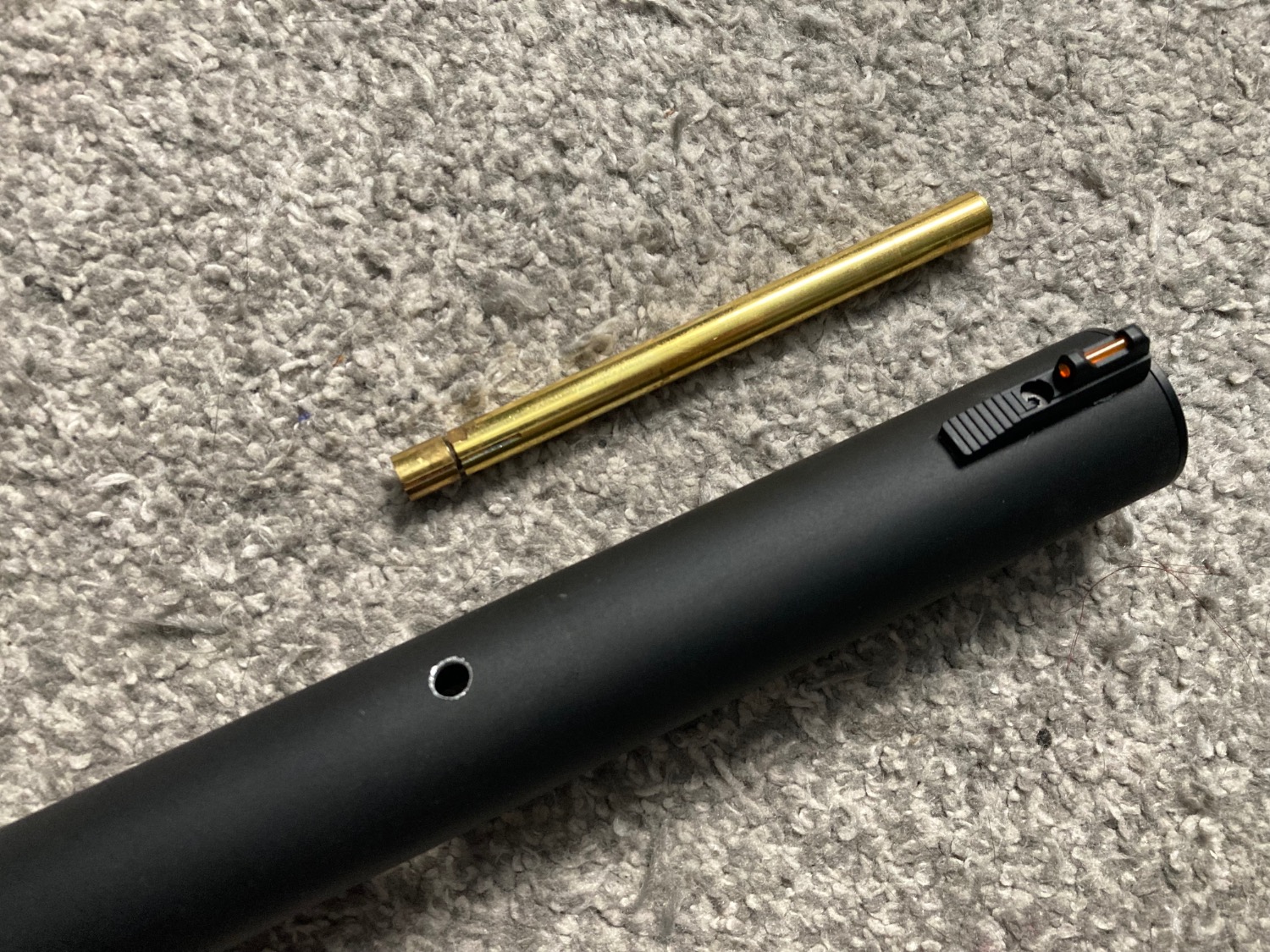 includes: laylax short PSS outer barrel with cut down inner barrel (barrel has had hole drilled for tridos TDC hop mod, fibre optic front sight mounted and end has female 14mm negative threads)