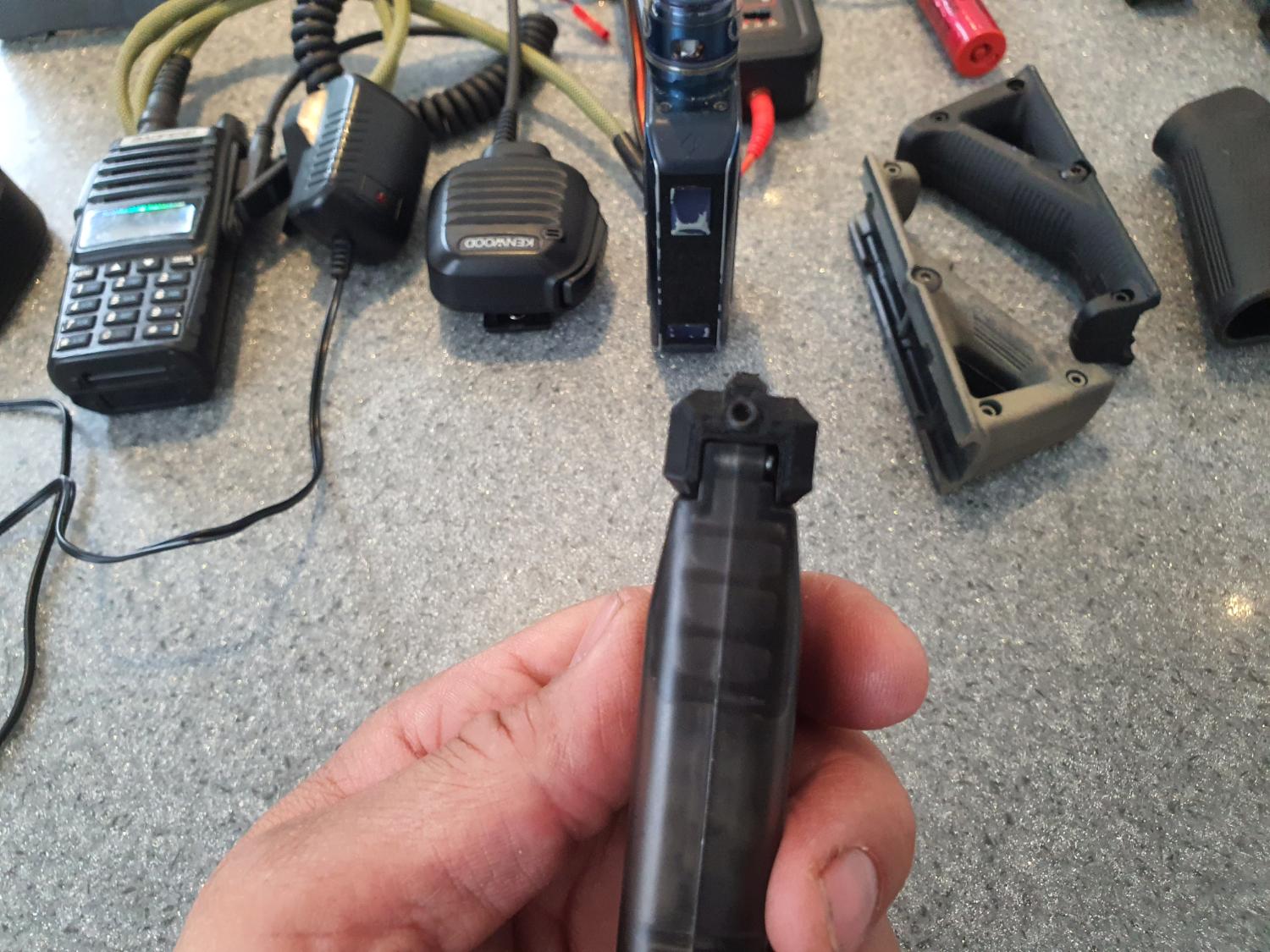 The regulator needs a rebuild kit which is hard to find, the radio work good and has an extended aerial, chronograph is untested, the pistol grip is from an mtw and so is the stock, the tourch works .......... so all you see is what you get, please don't as to split really don't have the time to £70 all in