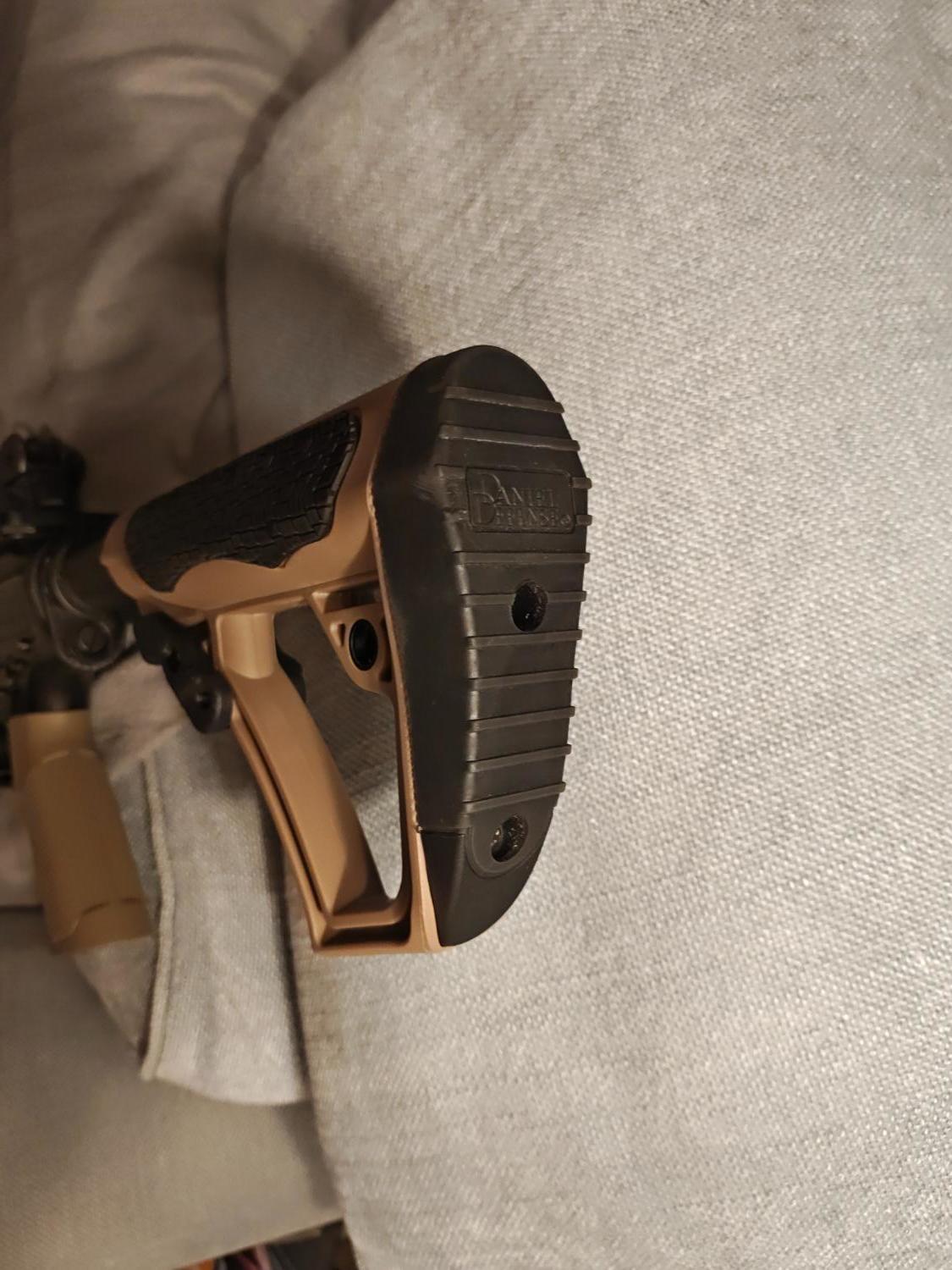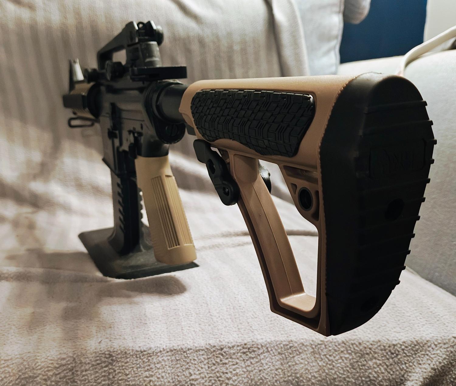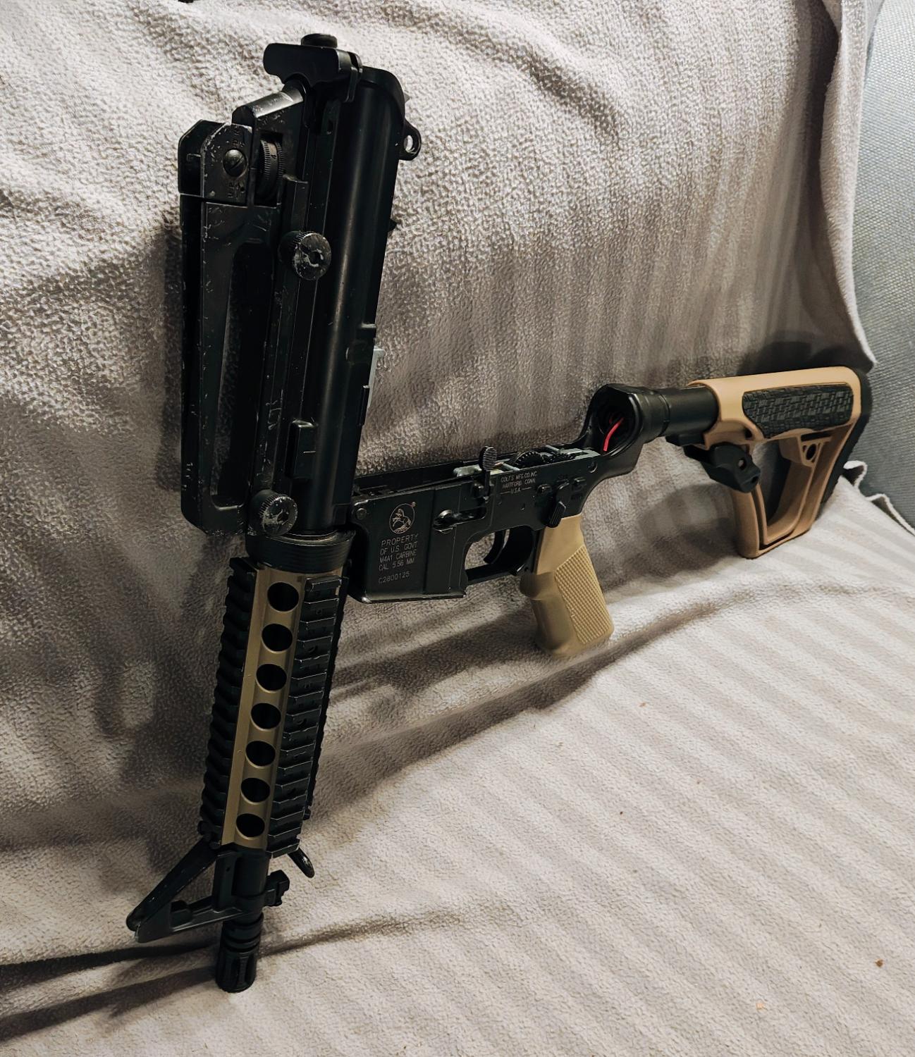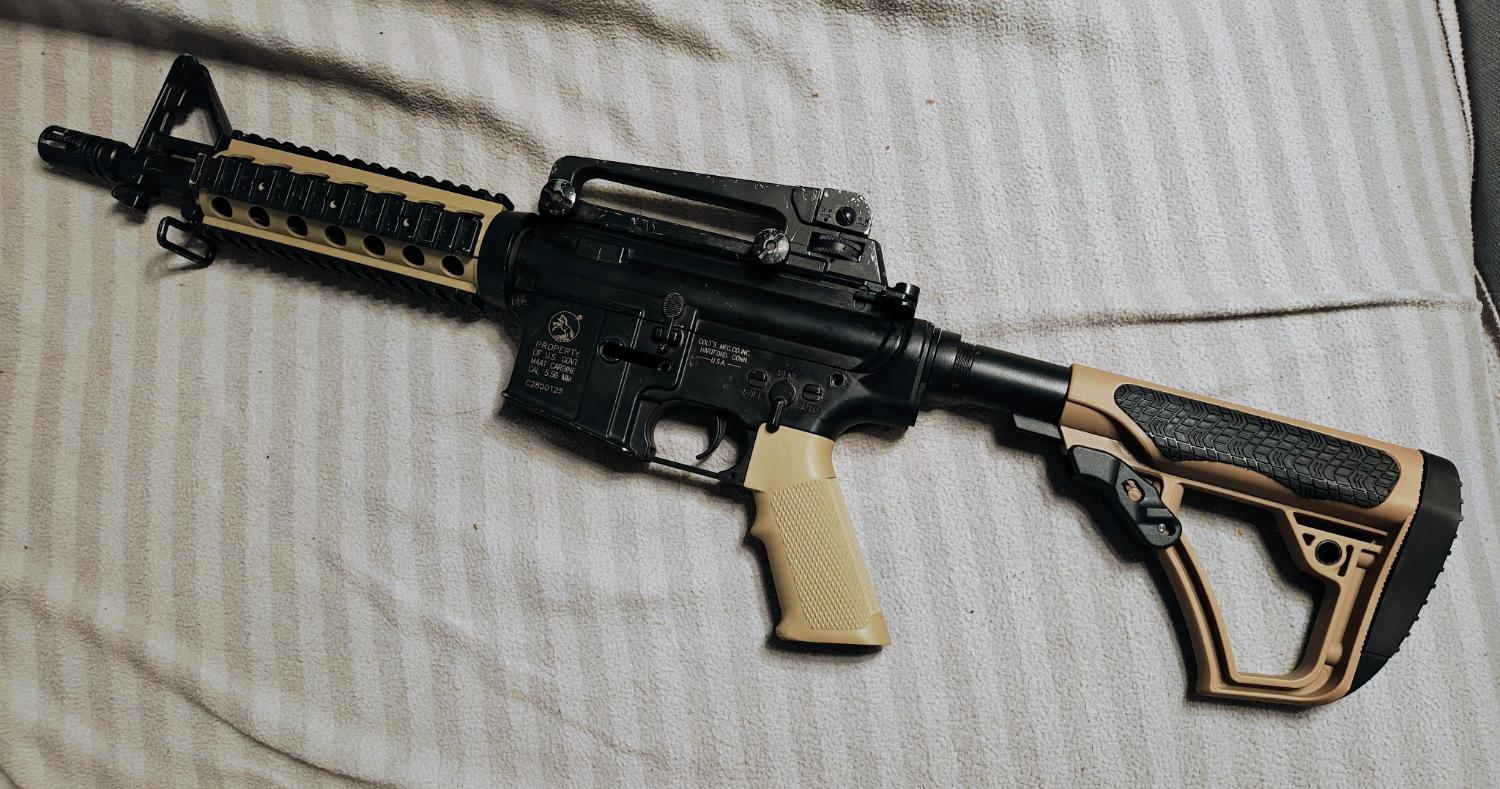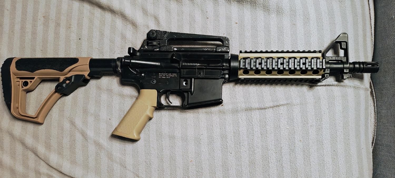 This is a recently serviced ICS split gearbox, metal replica with a black and tan Daniel Defence stock.