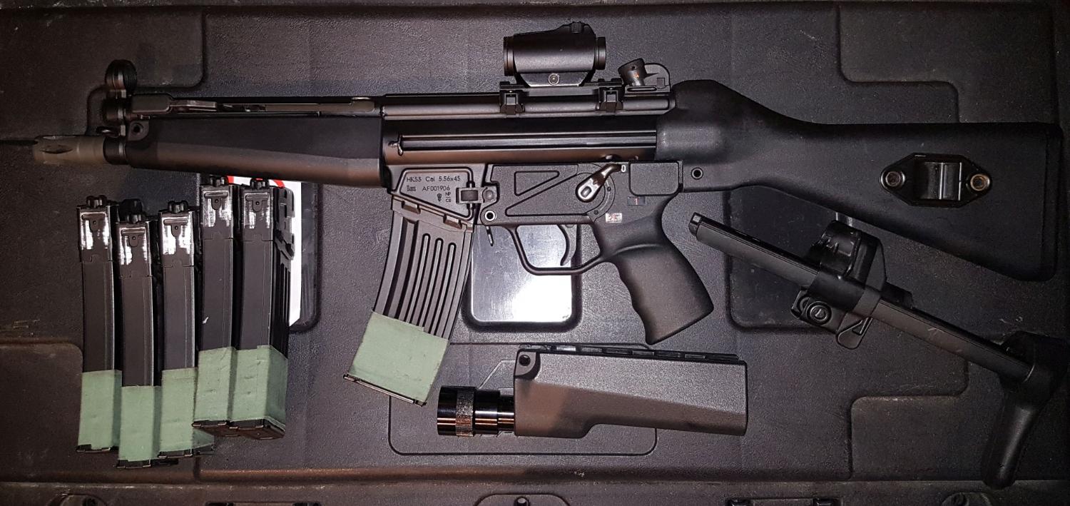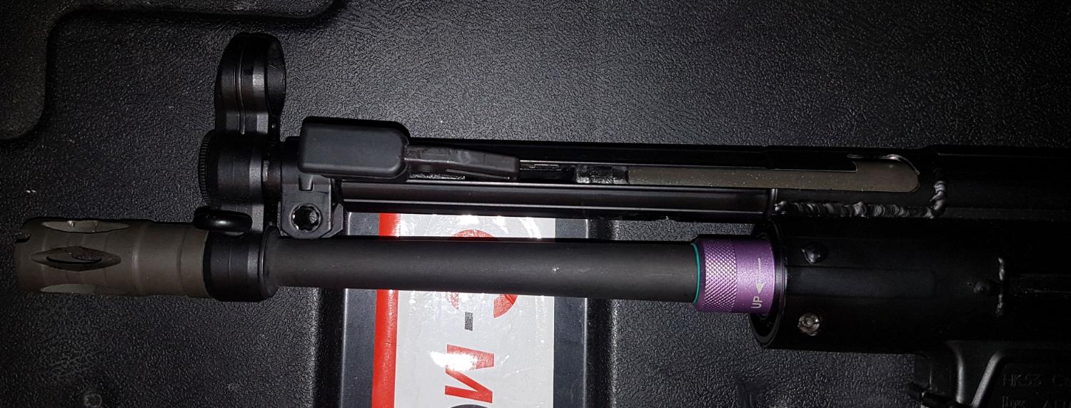 Includes 6x gas tight magazines, scope mount, Delta Point clone optic, telescopic stock, fixed stock, regular handguard and G&P flashlight handguard. Upgraded with Bowman steel barrel and CNC hop dial.