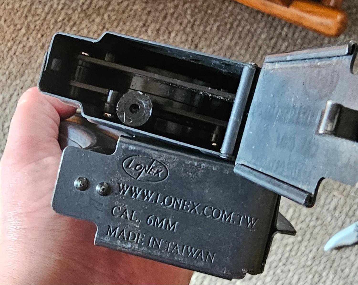 Comes with 8 high caps (2 of which are the lonex flash mags) and 5 mid caps. One drum mag that needs some tlc but sound wind does work. You can see in pic the paddle has snapped but is there sure someone could glue it back.