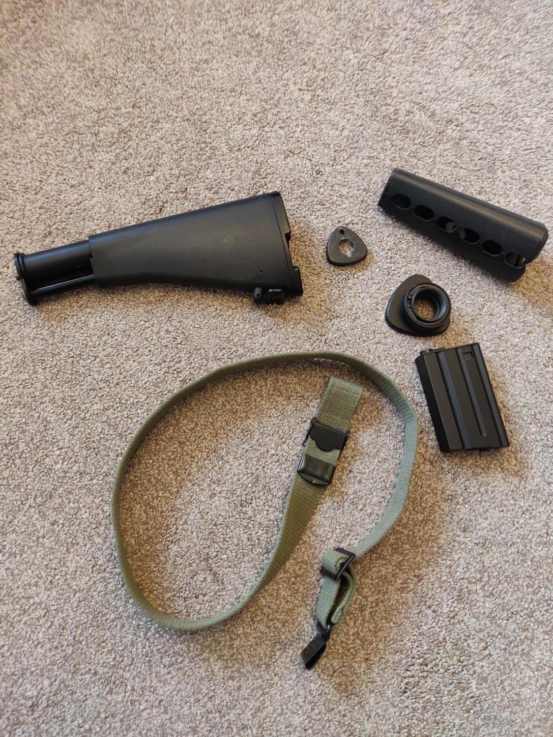 Old school G&P car 15 furniture, stock, handguard, small hi cap mag and sling, good for a vietnam style rifle.