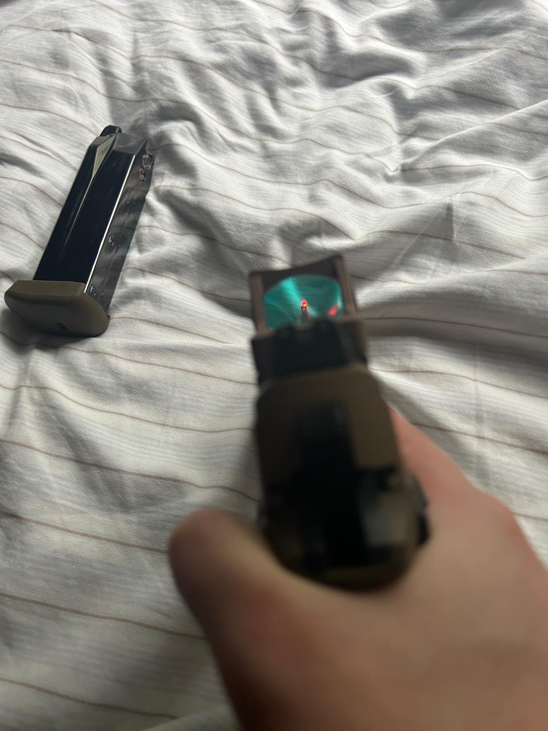 runs great, included repro trijicon AIMPOINT and 2x gas tight green gas mags, as well as the cover for the RMR cut, and a slimmer back strap for the grip, as well as a Kydex holster. (Last picture)