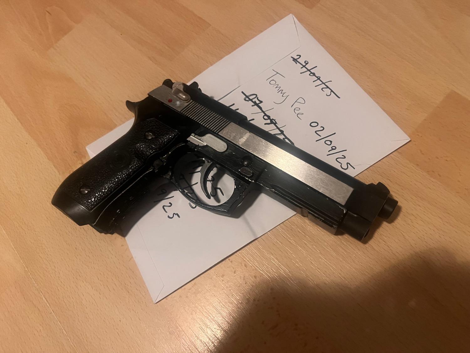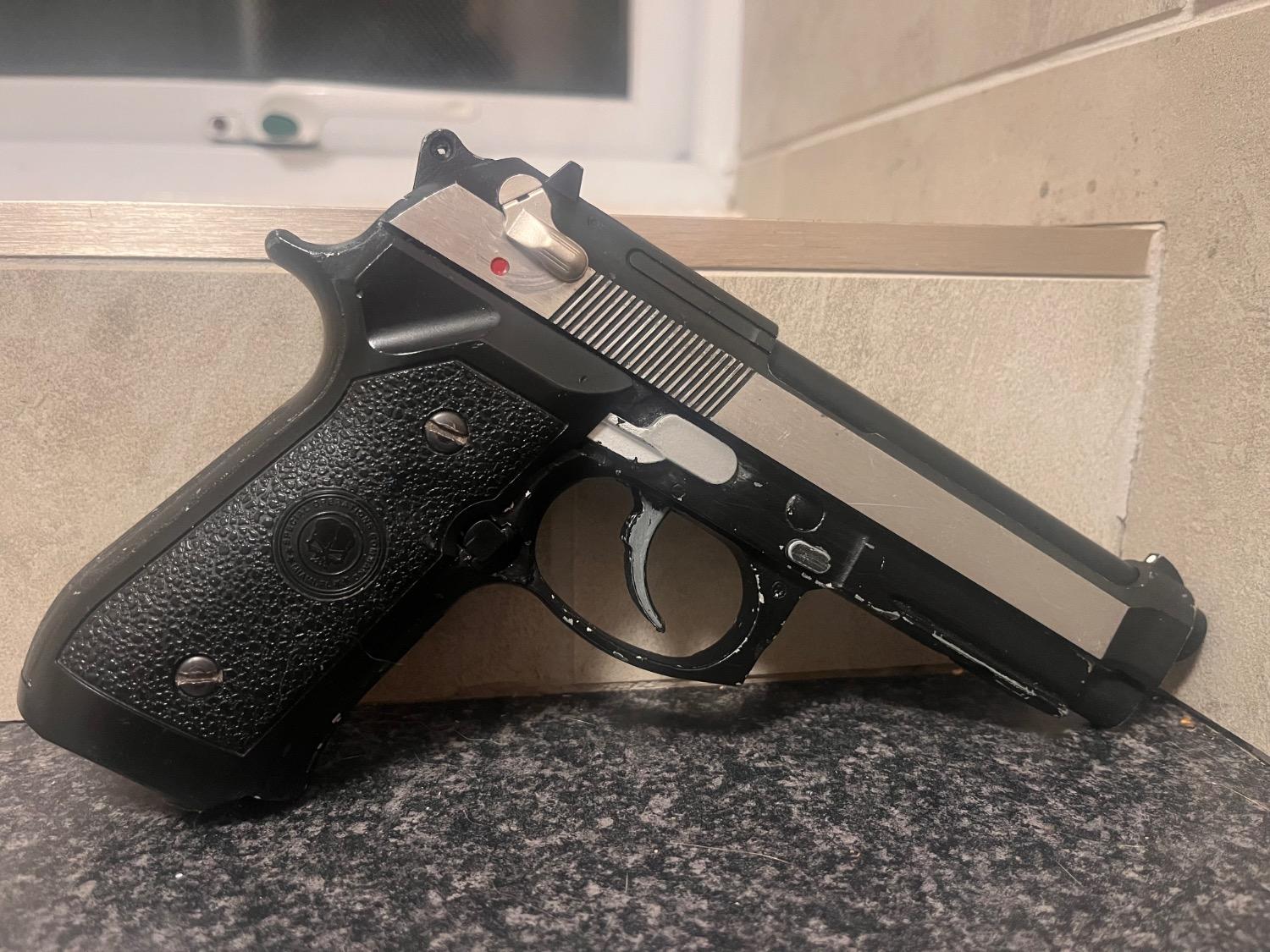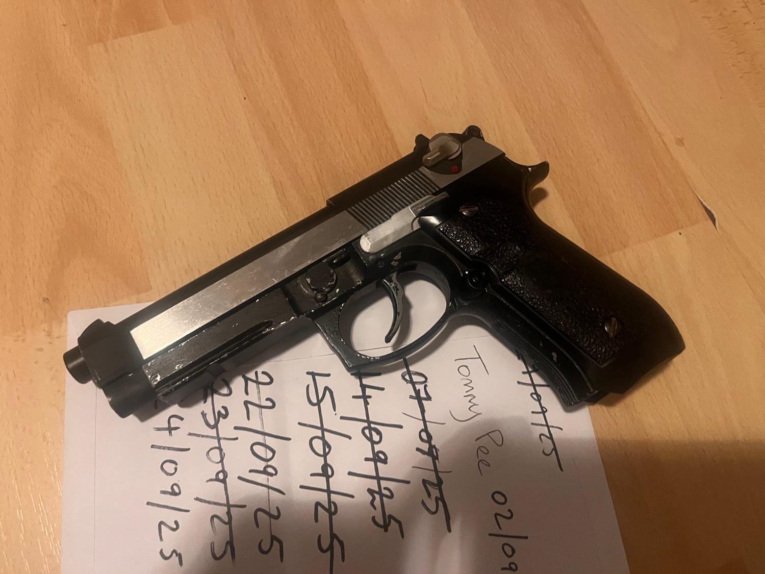 Unknown brand slide set with HFC frame. Incompatible at first but with time and sanding have started to bed in, does run a mag albeit jittery and sticky. More Sanding and time required. Will include a stainless metal outer barrel. All metal parts other than the grips. Good as a project or parts. Frame has men painted a couple times. Silver then black. No mag.