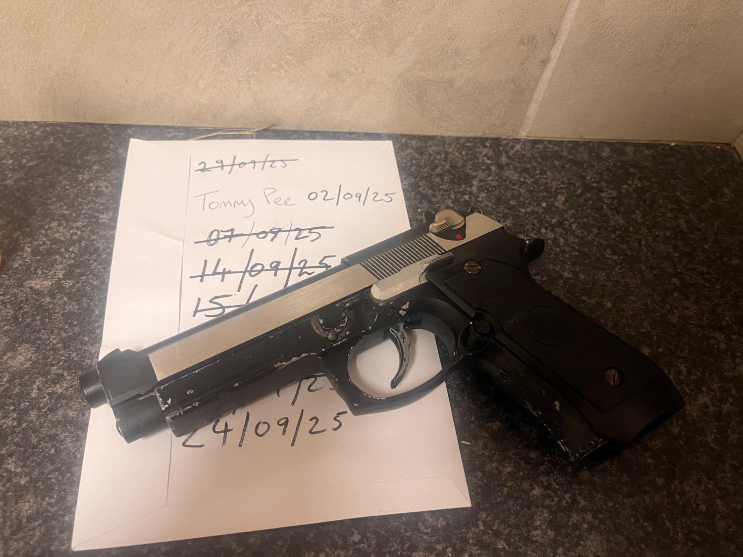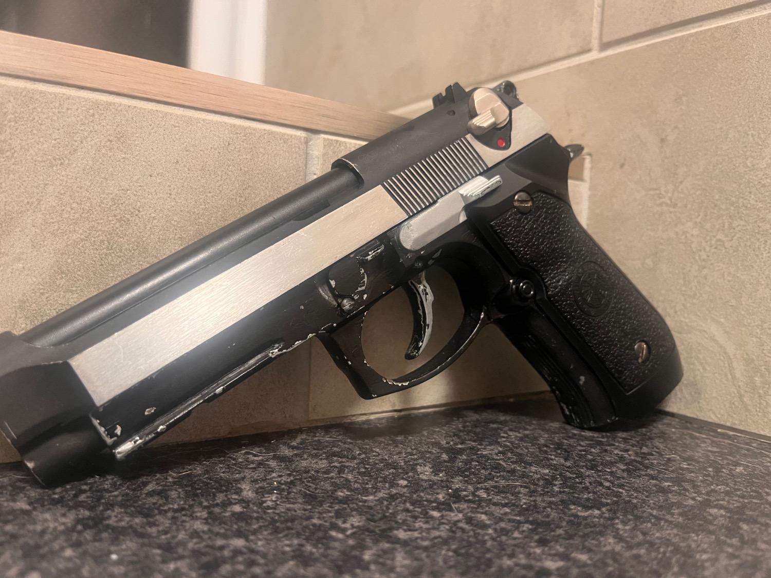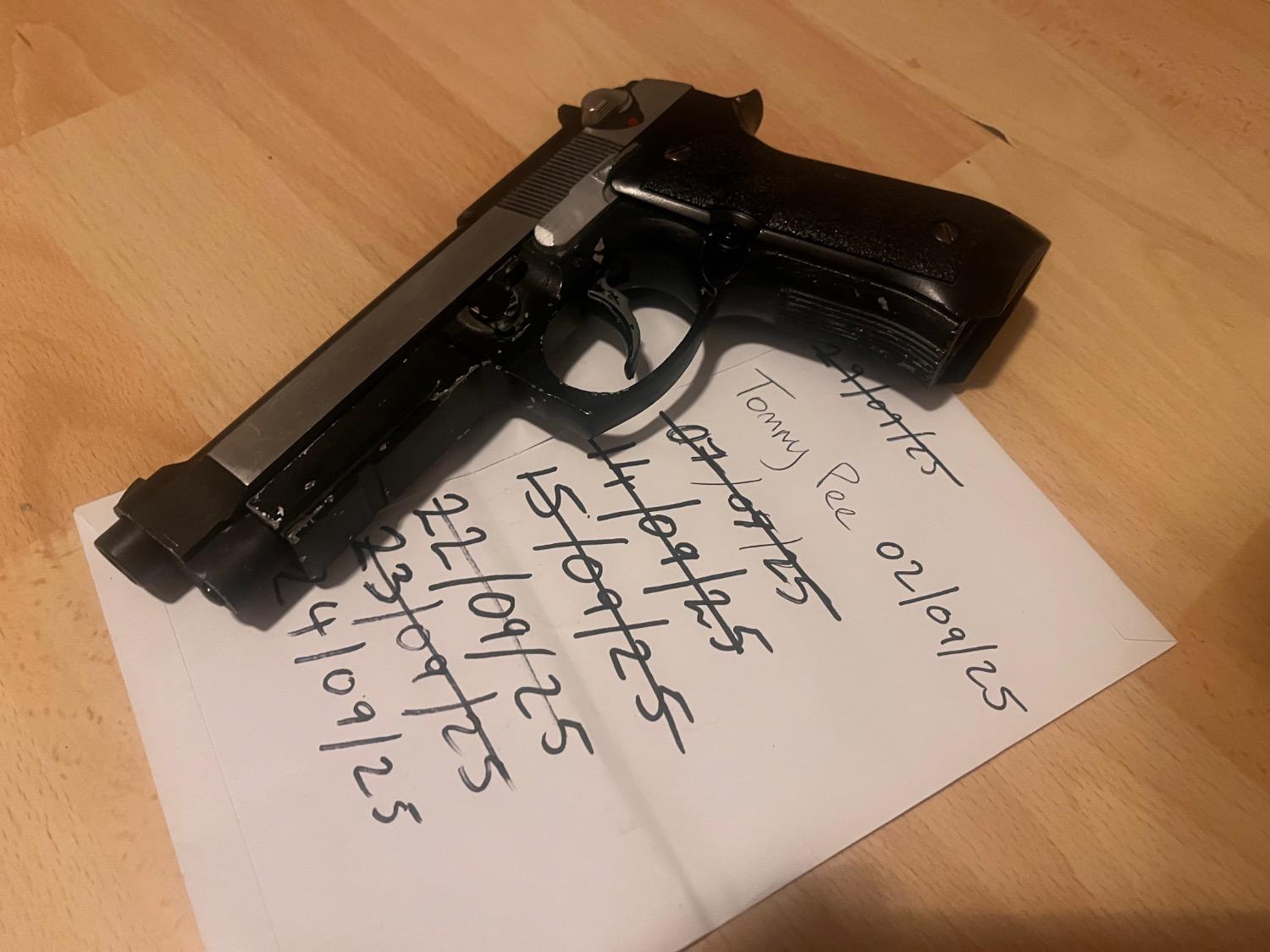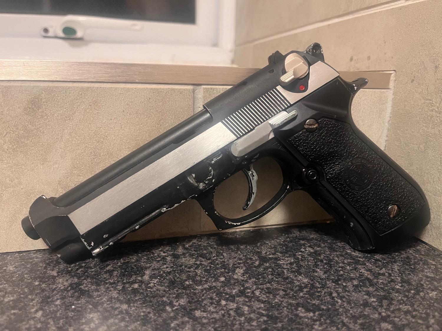 Unknown brand slide set with HFC frame. Incompatible at first but with time and sanding have started to bed in, does run a mag albeit jittery and sticky. More Sanding and time required. Will include a stainless metal outer barrel. All metal parts other than the grips. Good as a project or parts. Frame has men painted a couple times. Silver then black. No mag.