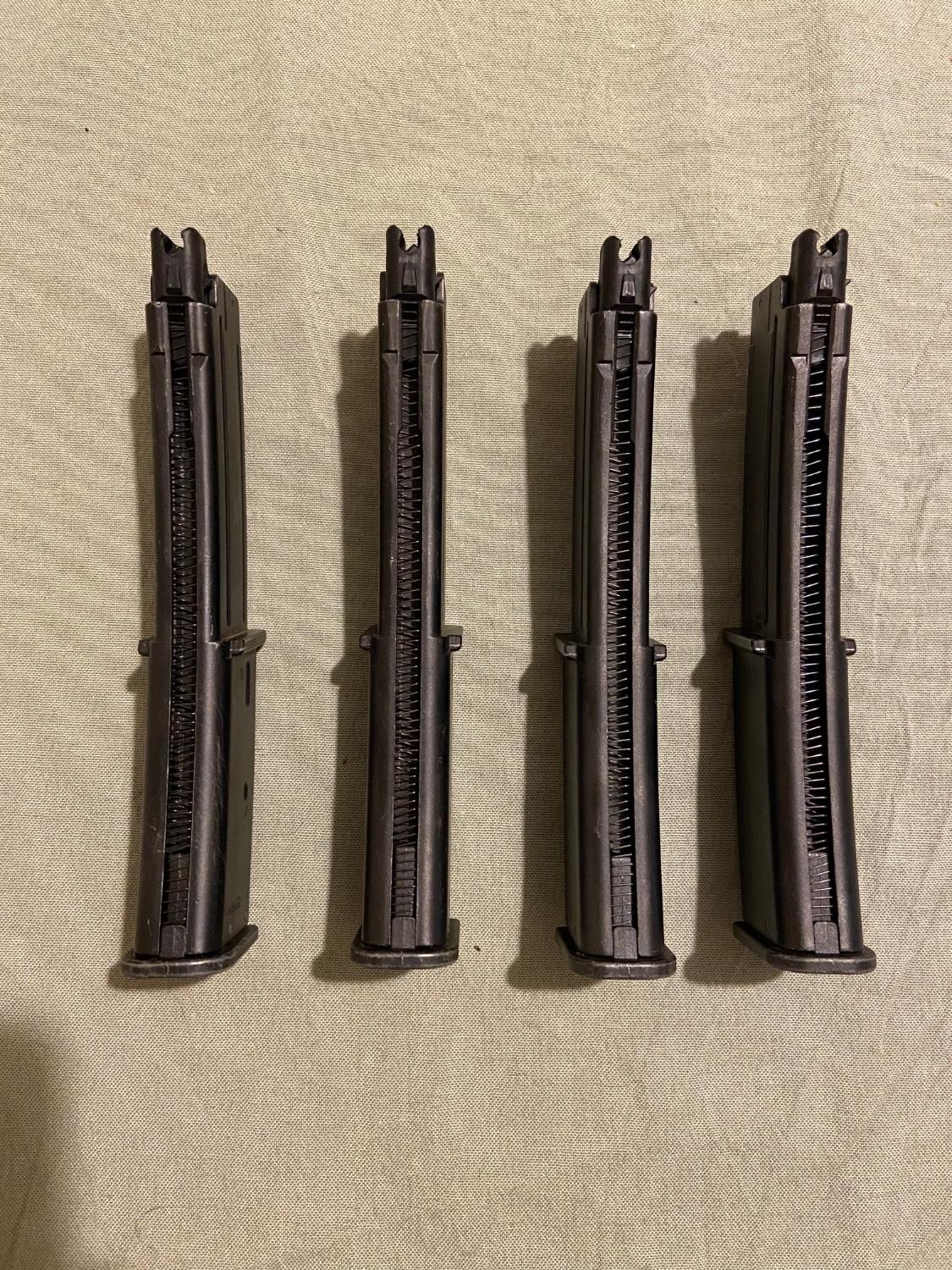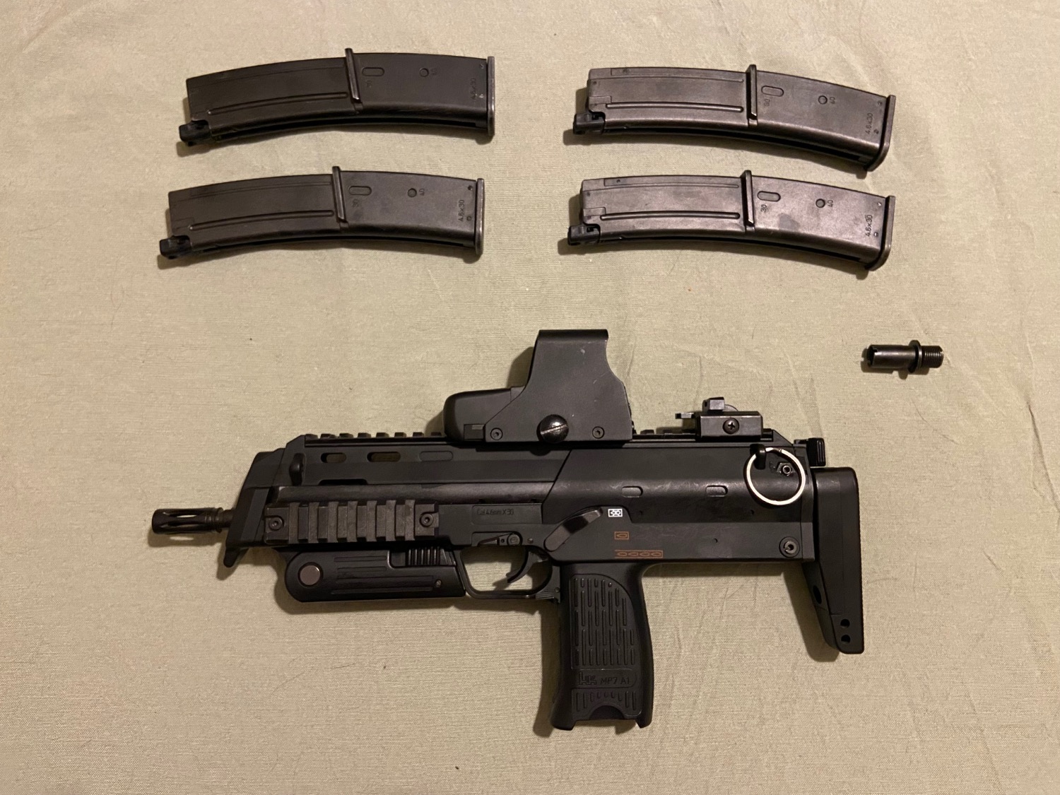 For sale I have this Tokyo Marui MP7 gas blow back. Included are 4 leak free TM magazines, the suppressor adapter, and a holographic sight.