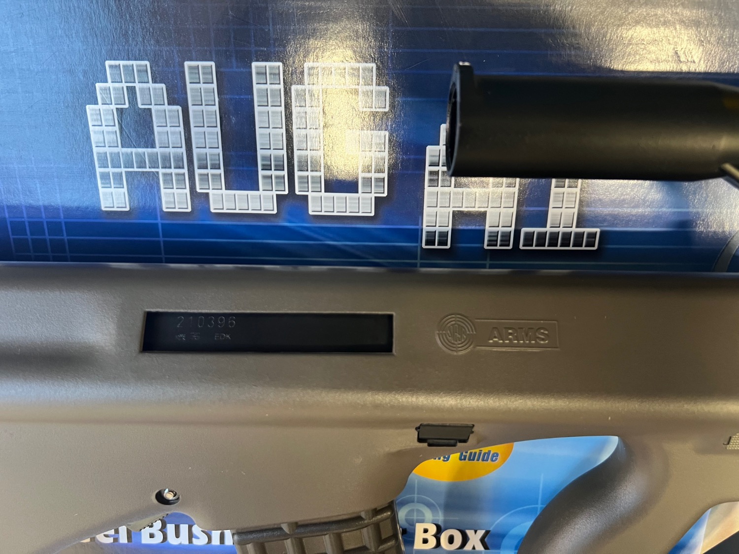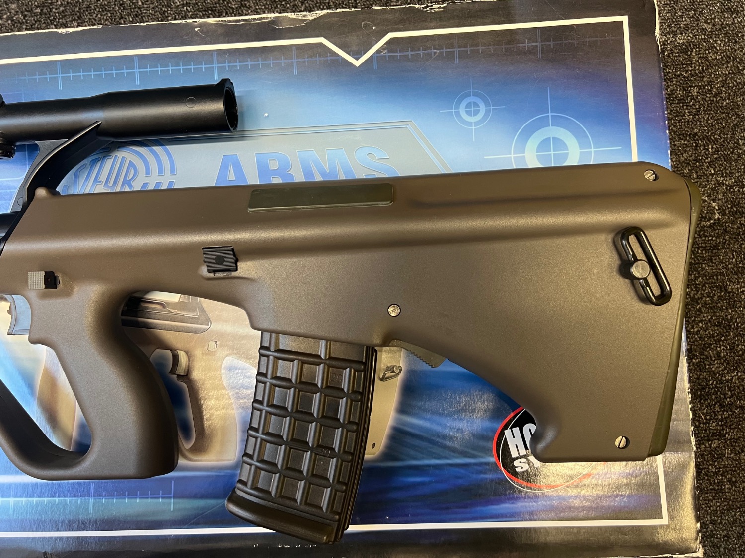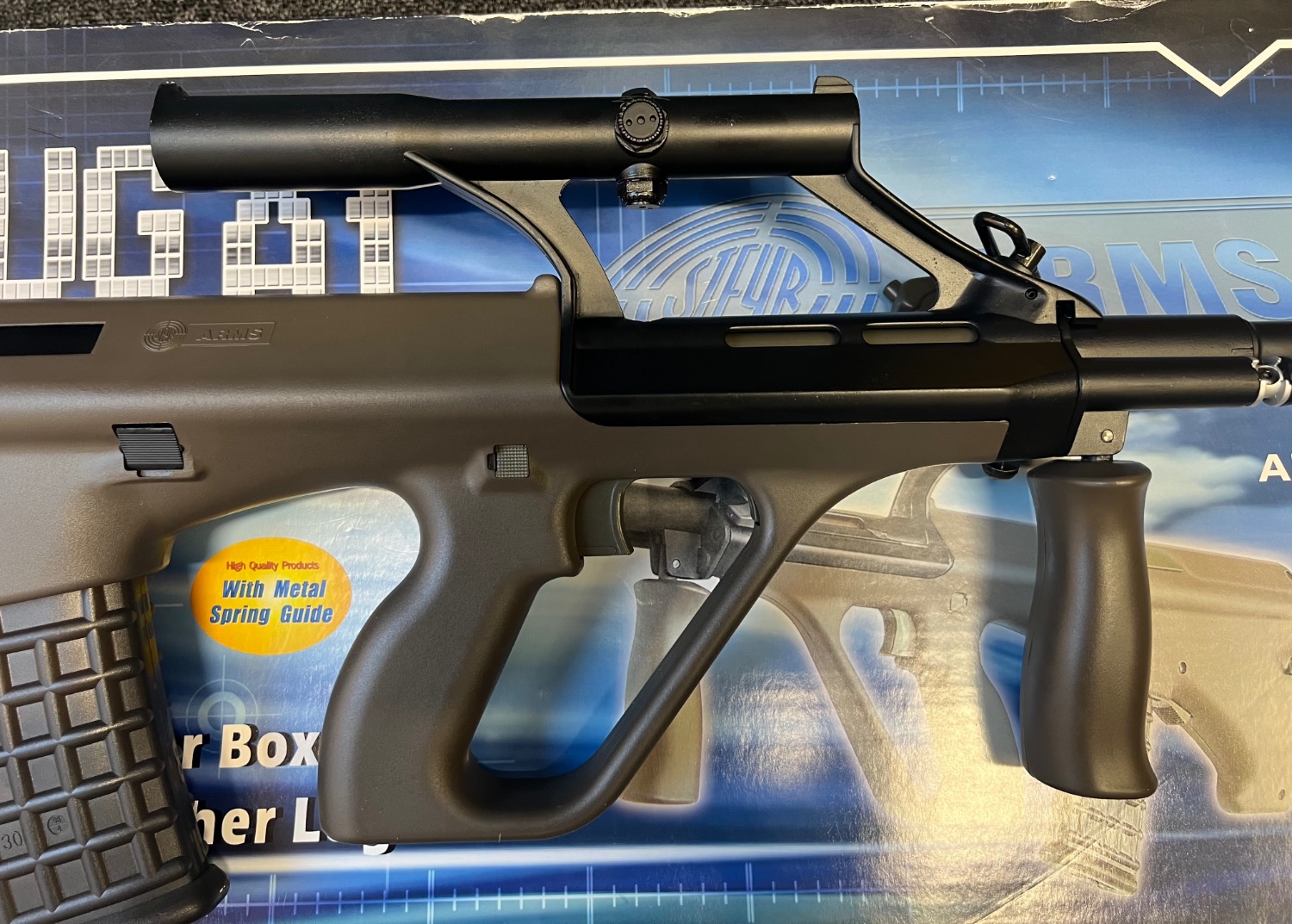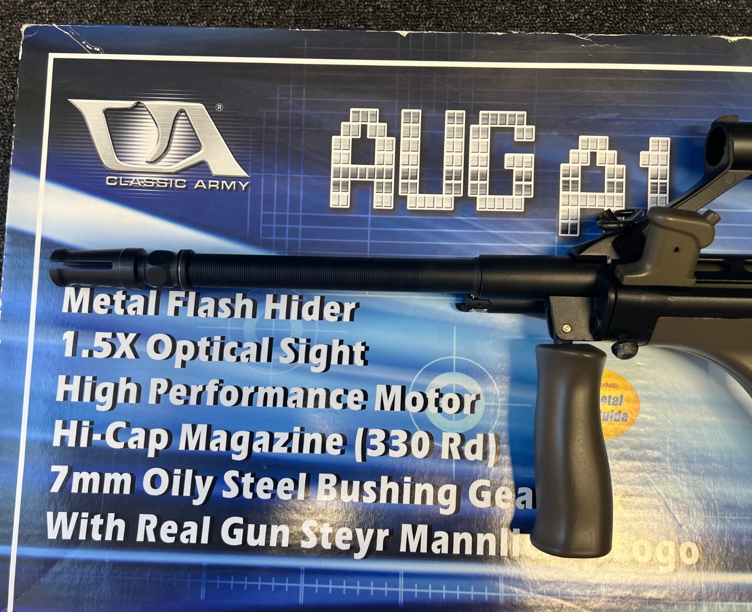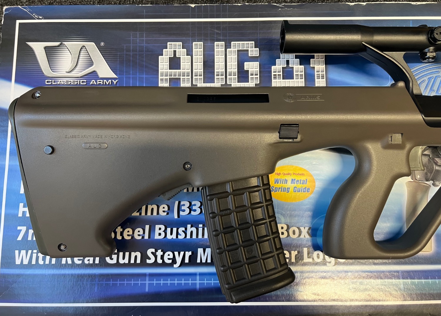 here is my new in box classic army Steyr aug a1. This was purchased some years ago then just put up in the loft so even though it’s a few years old it’s still an un skirmished rif. It’s in as new condition apart from a bolt head which is dis coloured shown in pics.