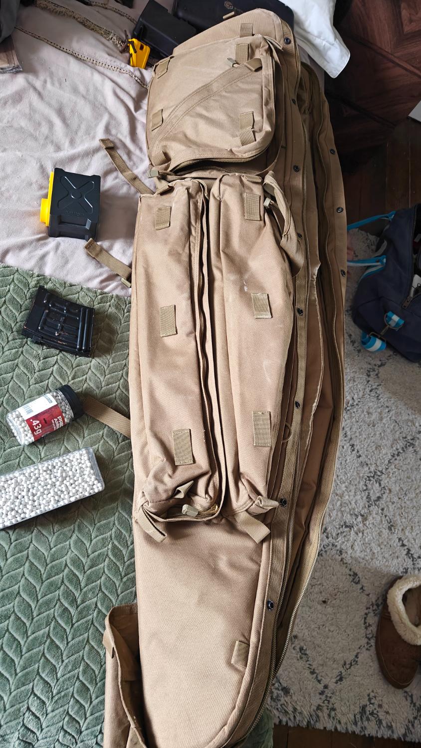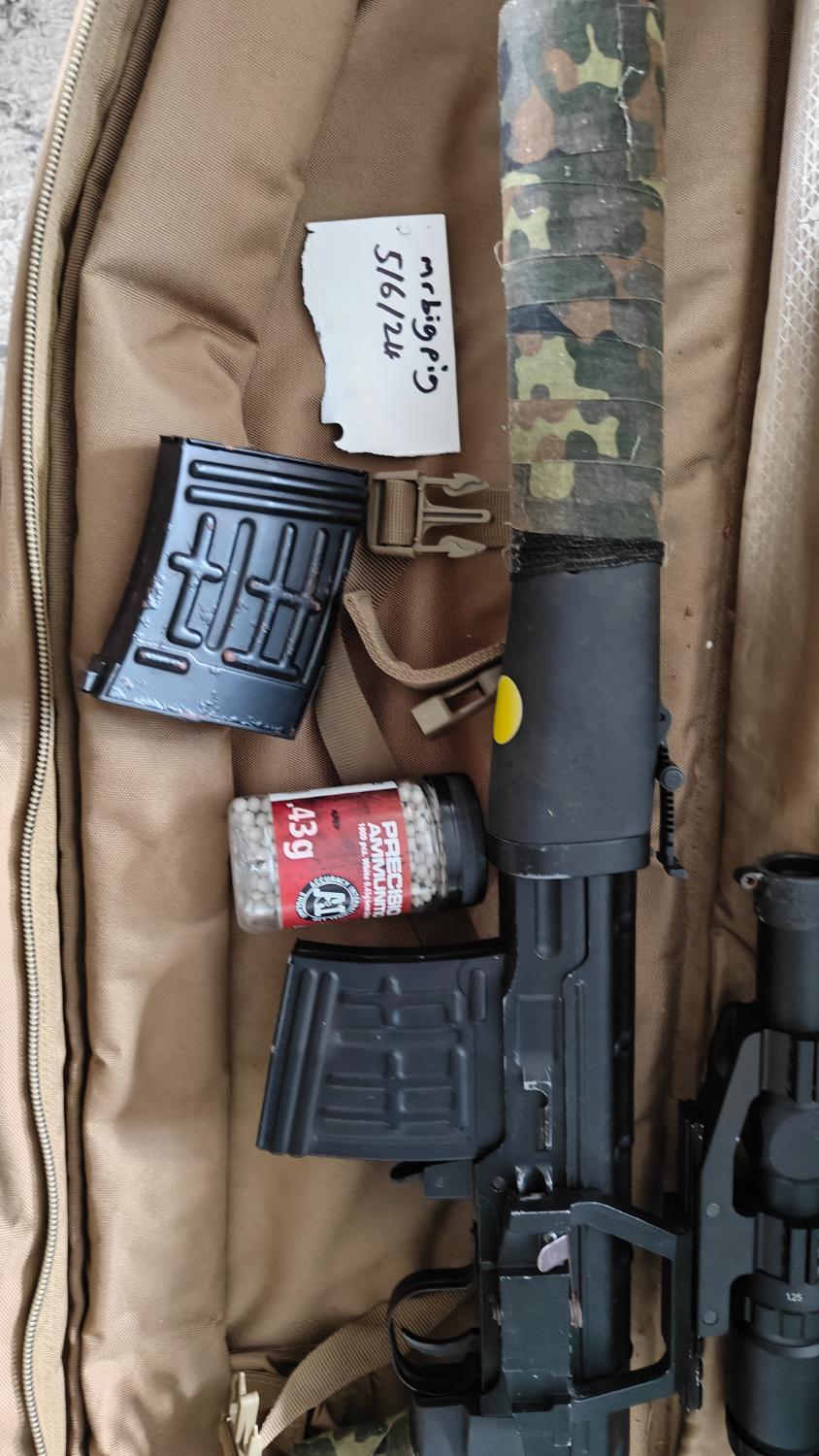 bought from car boot at a airsoft site. Used maybe 5 times and now just sat in the attic. insides were upgraded by previous owner...has two hi cap mags and some bbs