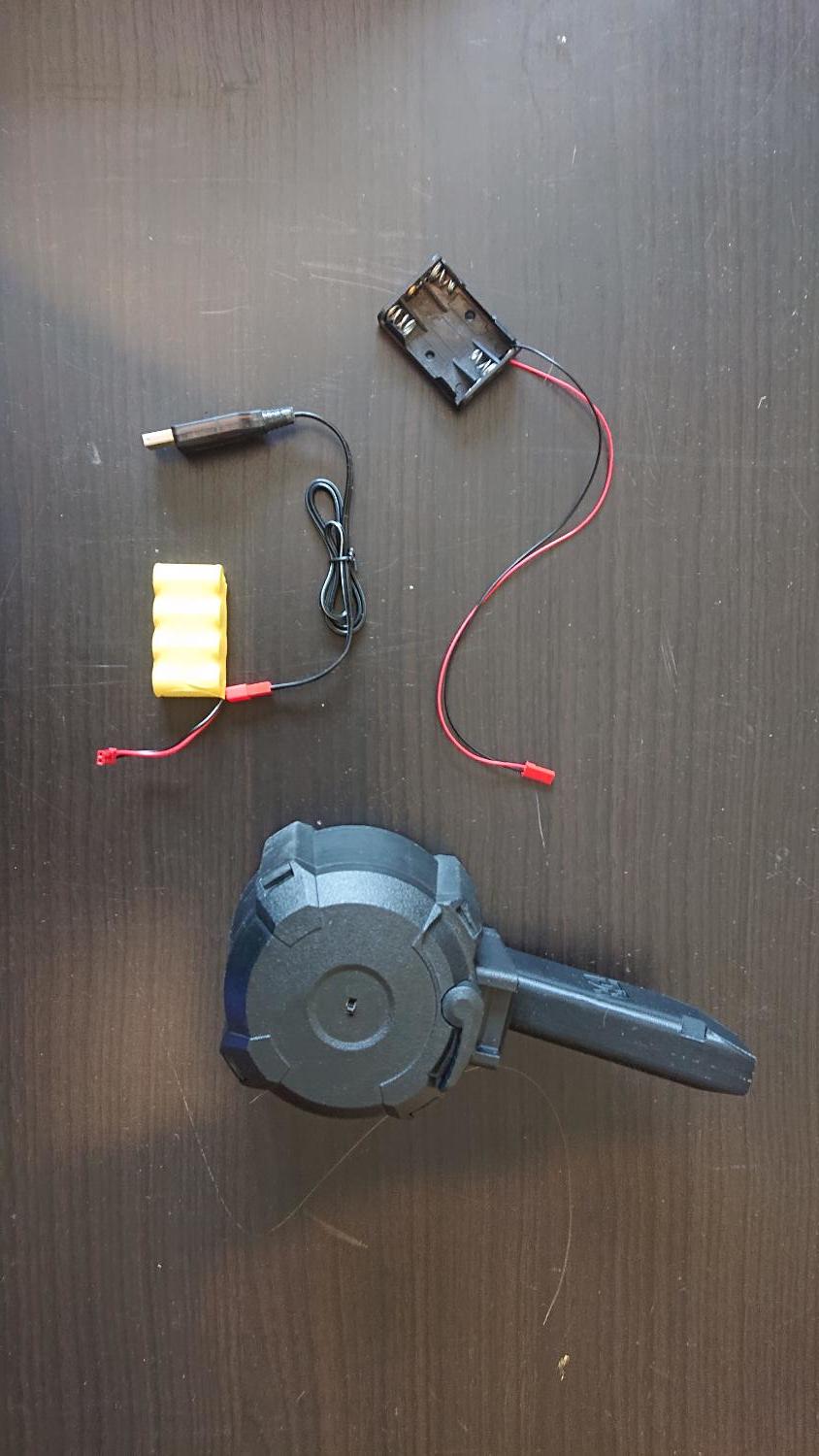 - Battery powered drum mag with over 1100 capacity, keeps up very well with full auto if necessary. Rechargeable battery, charger, and AA adapter included.