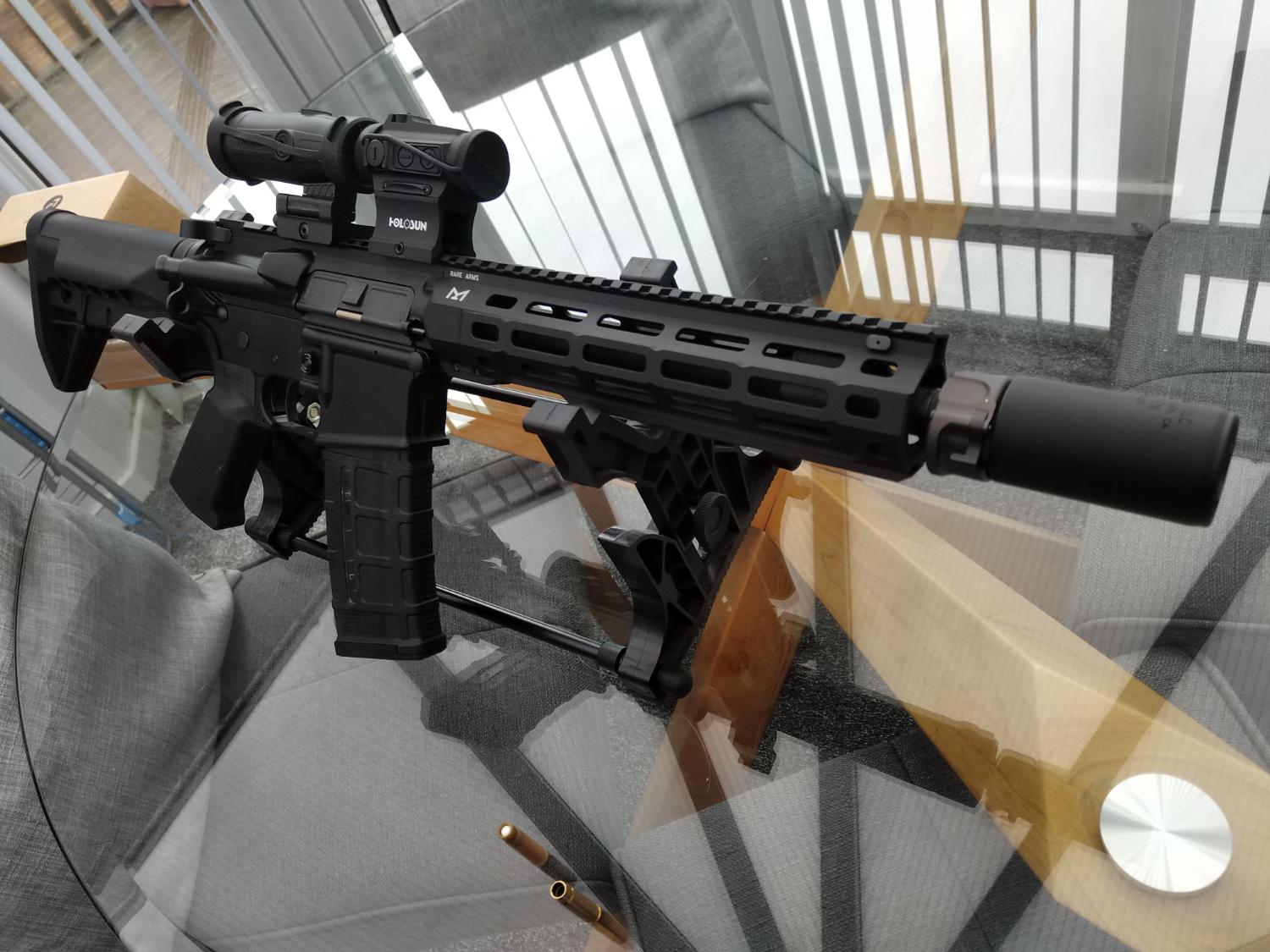 Aluminum build with steel reinforcement for the high ware areas and fitted with an Angry gun mini mock silencer, original furniture will be included too.