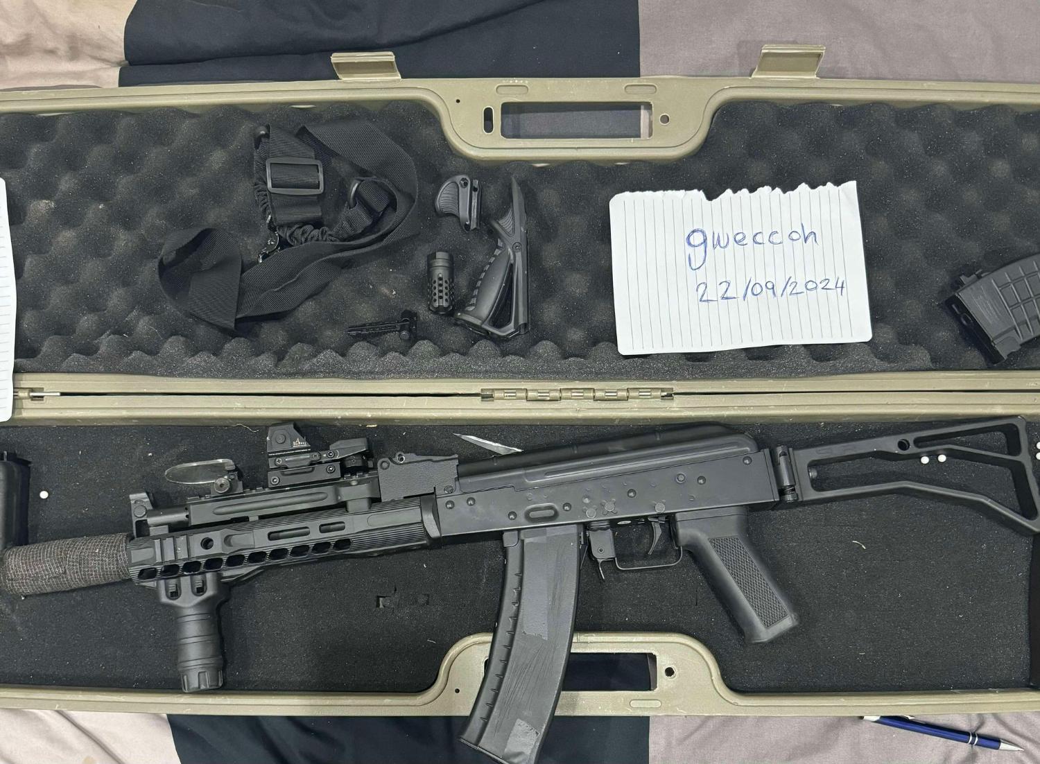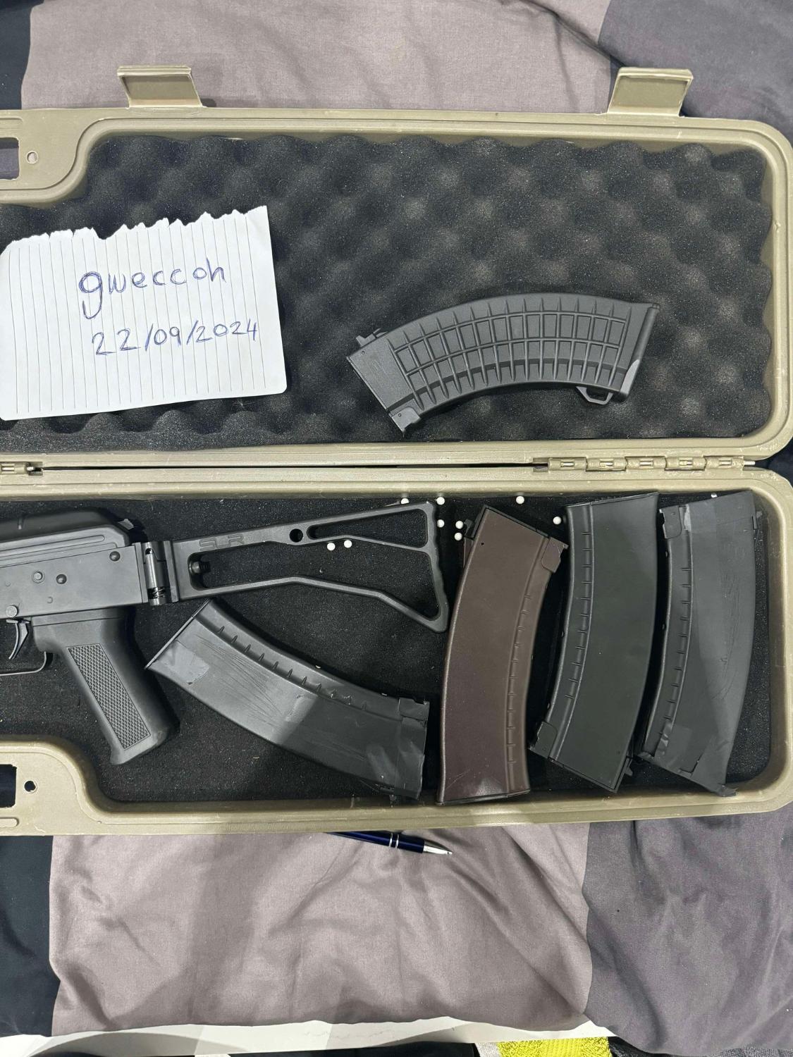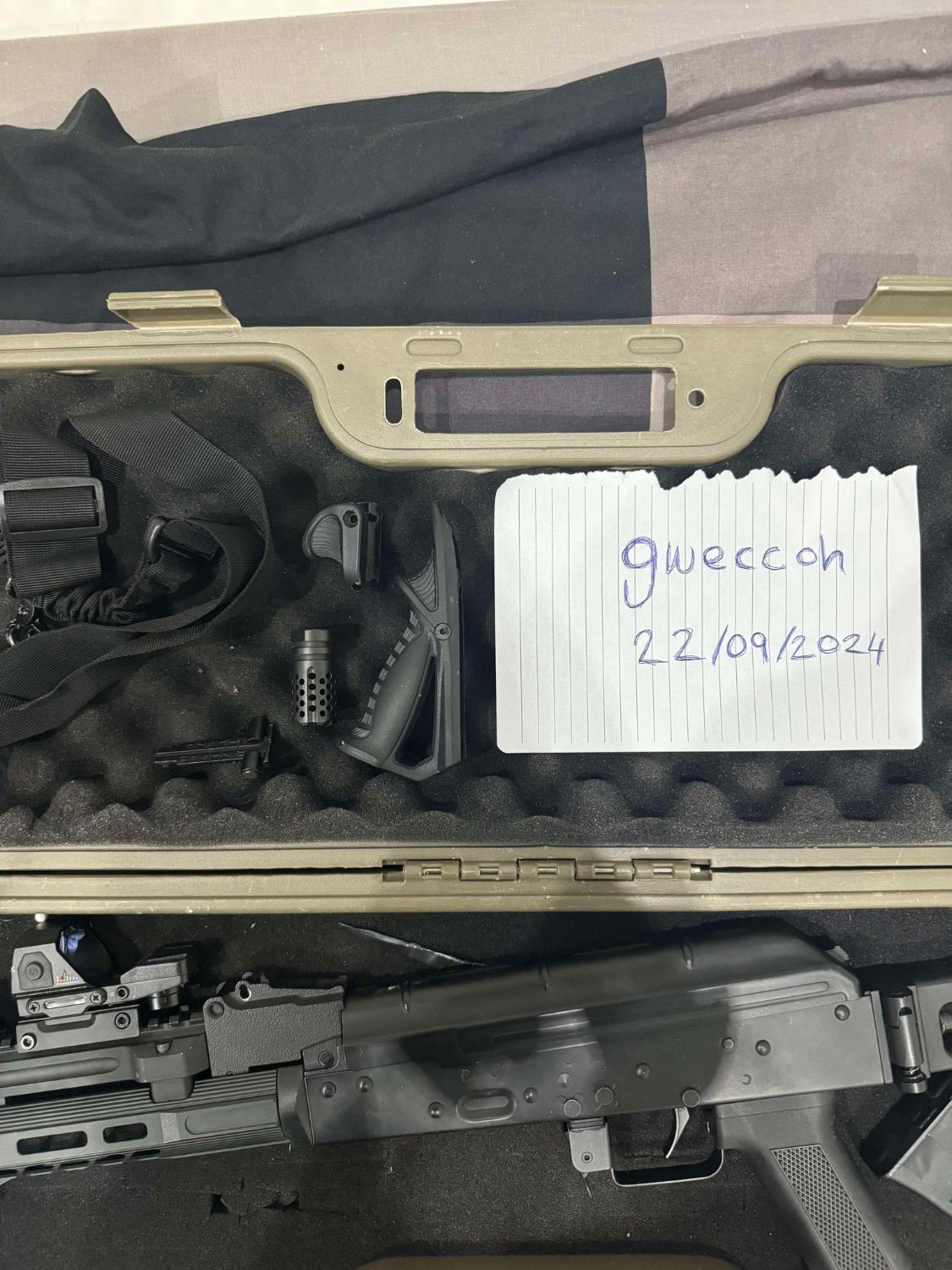 5 magazines - 3 under barrel grips - 2 different silencers - Red dot sight scope (cracked as someone shot it but can still see the red dot) - Scope protector - 1600 NiMh stick battery, 9.6v + charger - Case