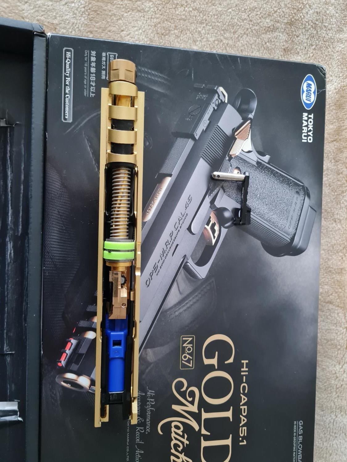La capa hyper slide, Dr Black gold inner barrel, Dr Black Dinging outer barrel black (sounds awesome), la capa guide rod/plug, aip 120% recoil spring, edge v2 bbu, edge blue nozzle, cowcow nozzle spring, la capa magwell, nexxspeed/hi-capa hub brass hop unit, maple leaf hop rubber.