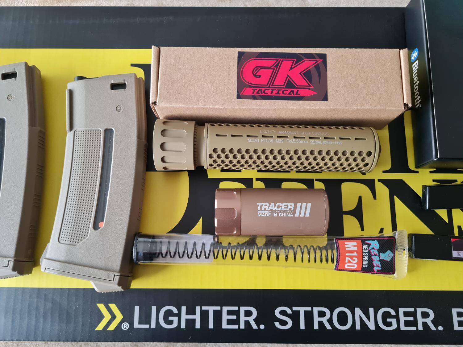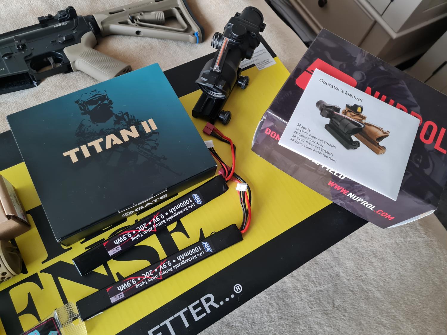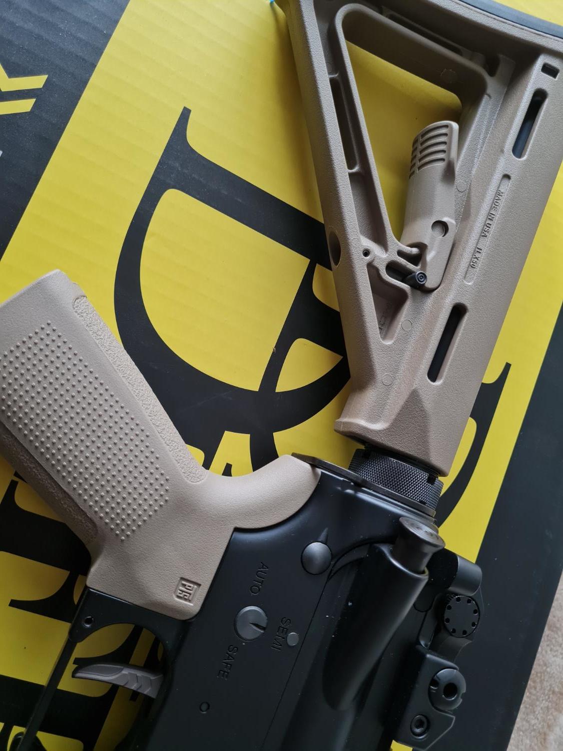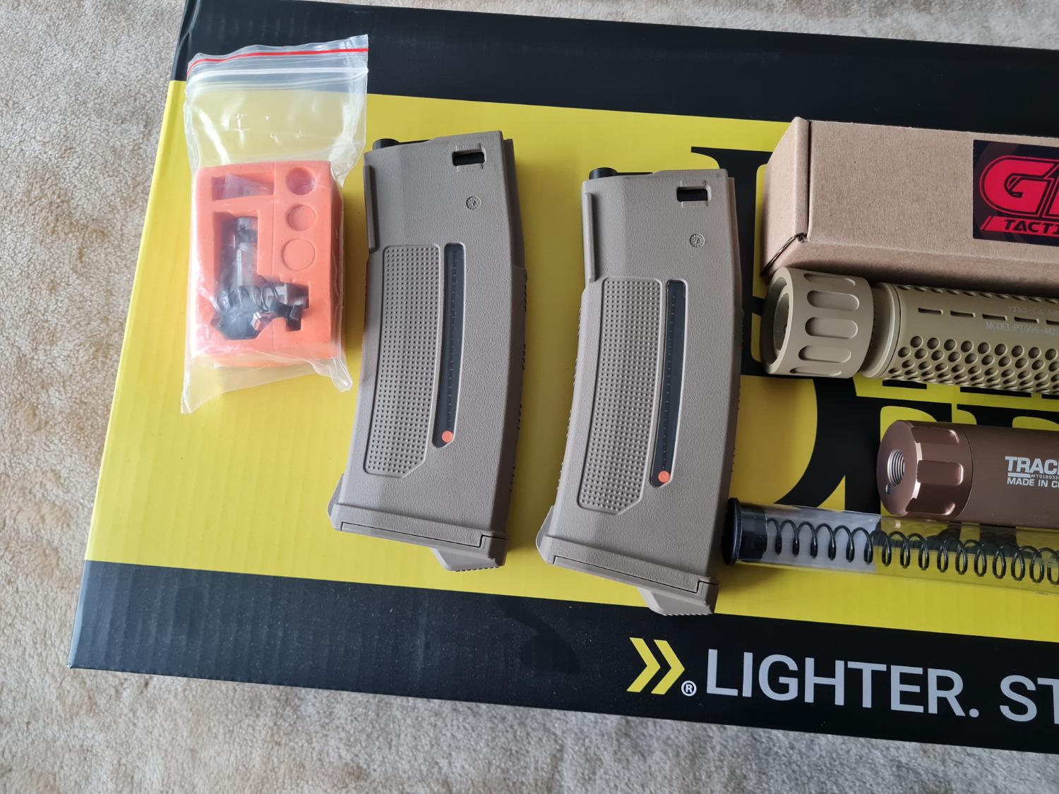 Warhead 35k base motor, Gate titan 2, gate nova adjustable trigger in tan, x2 epm1 250rd mags in tan, nuprol scope new, gk tan silencer new, tan tracer, x2 life batteries, genuine magpul furniture, pts tan grip, max Pro hop, maple leaf hop rubber.