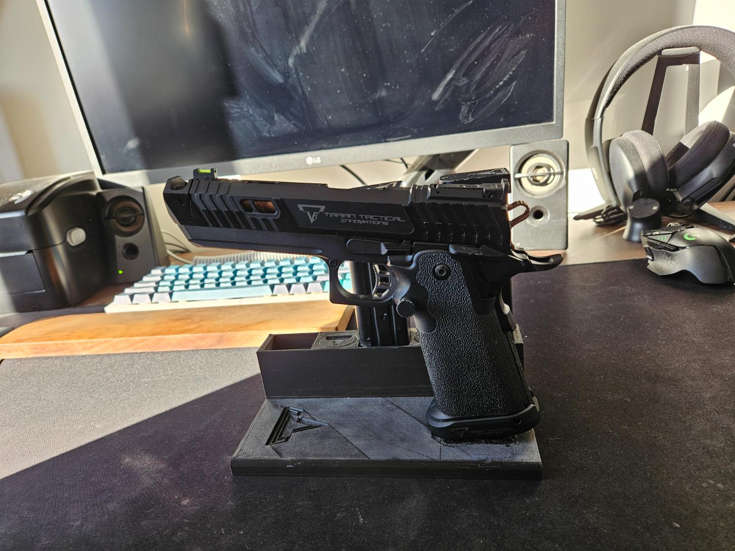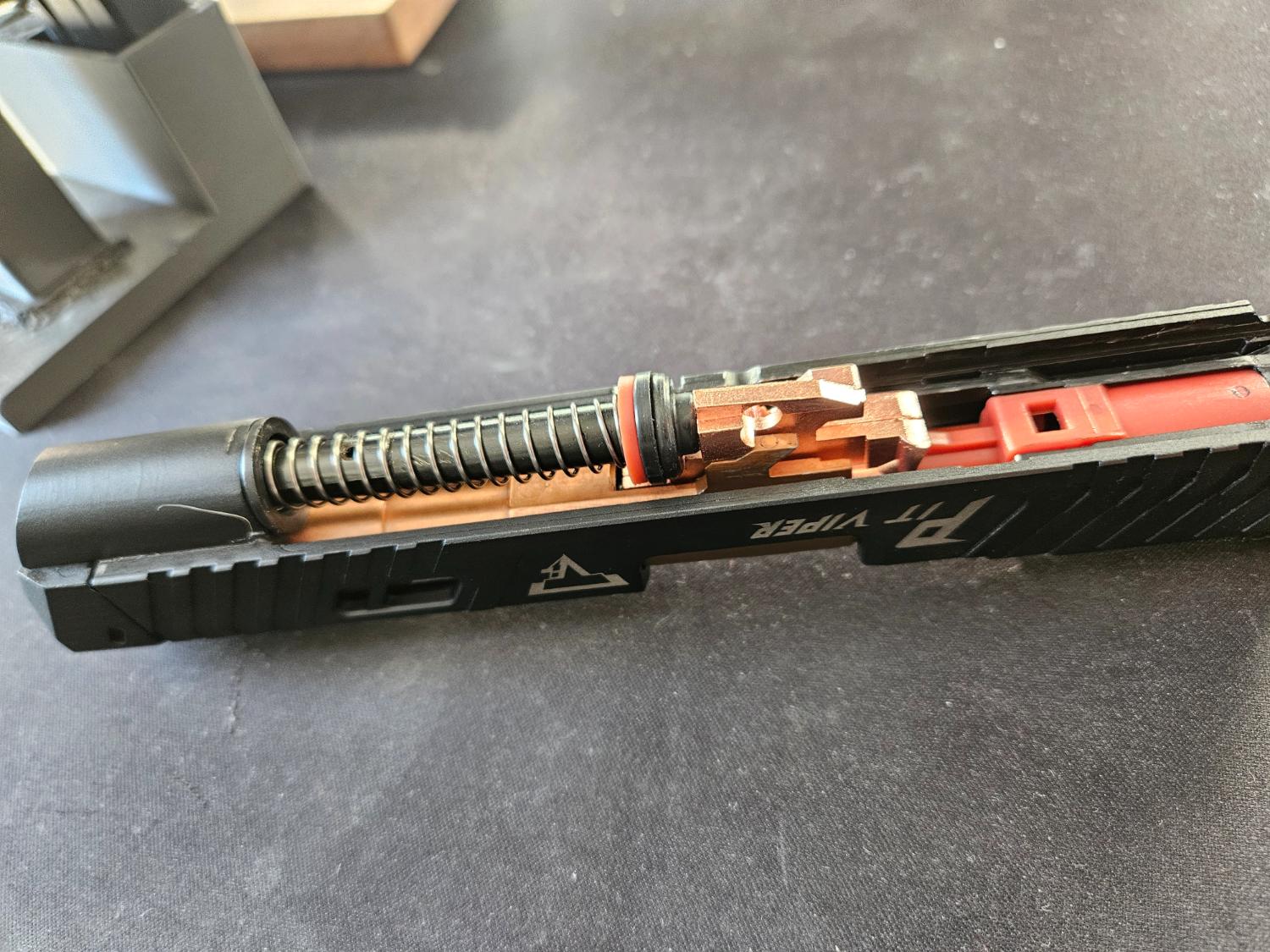 This pit viper has been upgraded with a maple leaf hop unit and rubber. It comes with a 3d printed stand, holster and metal carry case.