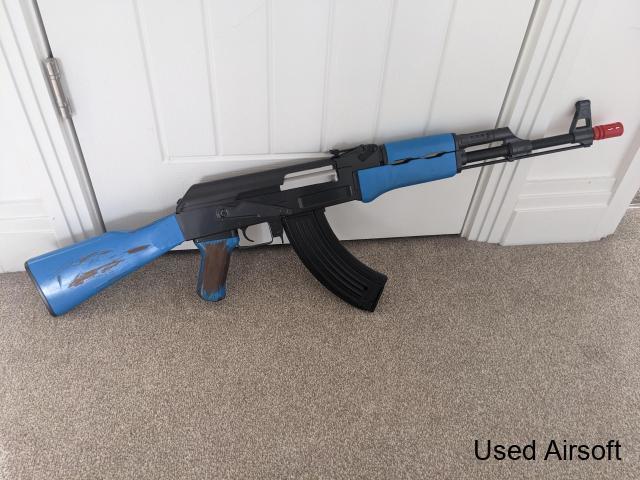 JG AK-47 shoots alright not very powerful not sure about fps but probably around 150-200 it think it needs a new spring. I took it out to play airsoft but I got a new gun and I haven't used it since it's £90 collection only comes with 600 round high cap mag as well as box battery and charger. Box is damaged as seen in photos. Extra battery for £5 Extra. Open to reasonable offers.
