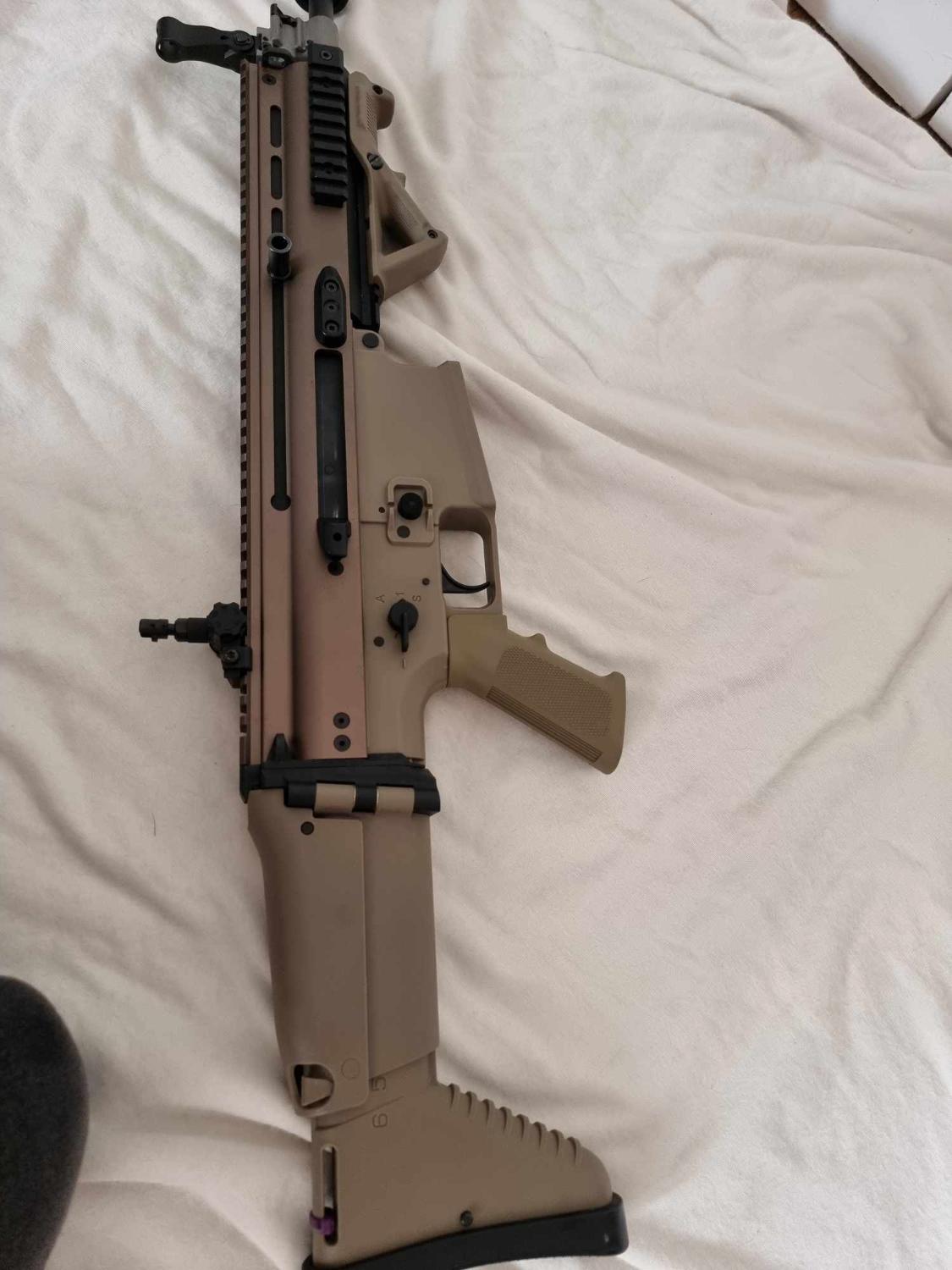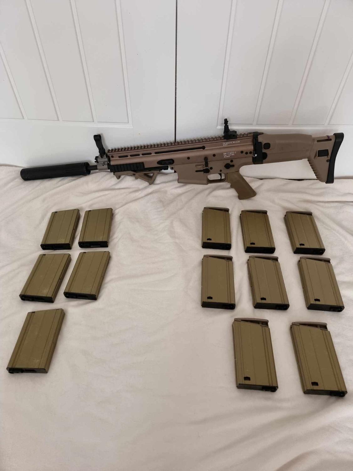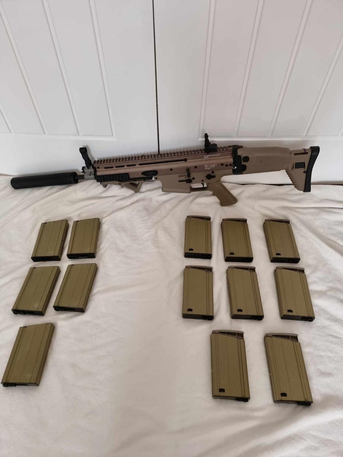 VFC Scar H DMR AEG. This has been fully upgraded. Gate aster mosfet M130 spring maple leaf hop bucking with an R-Hop. High torque motor, Piston and piston head have been changed but not sure what they are. Original steel 6.03 tight bore It has 8 mid caps and 5 high caps. The gun comes as seen. A silencer that goes straight on to the flash hider Comes with 1x 11.1v lipo battery and original hard case. Locked at Semi only.
