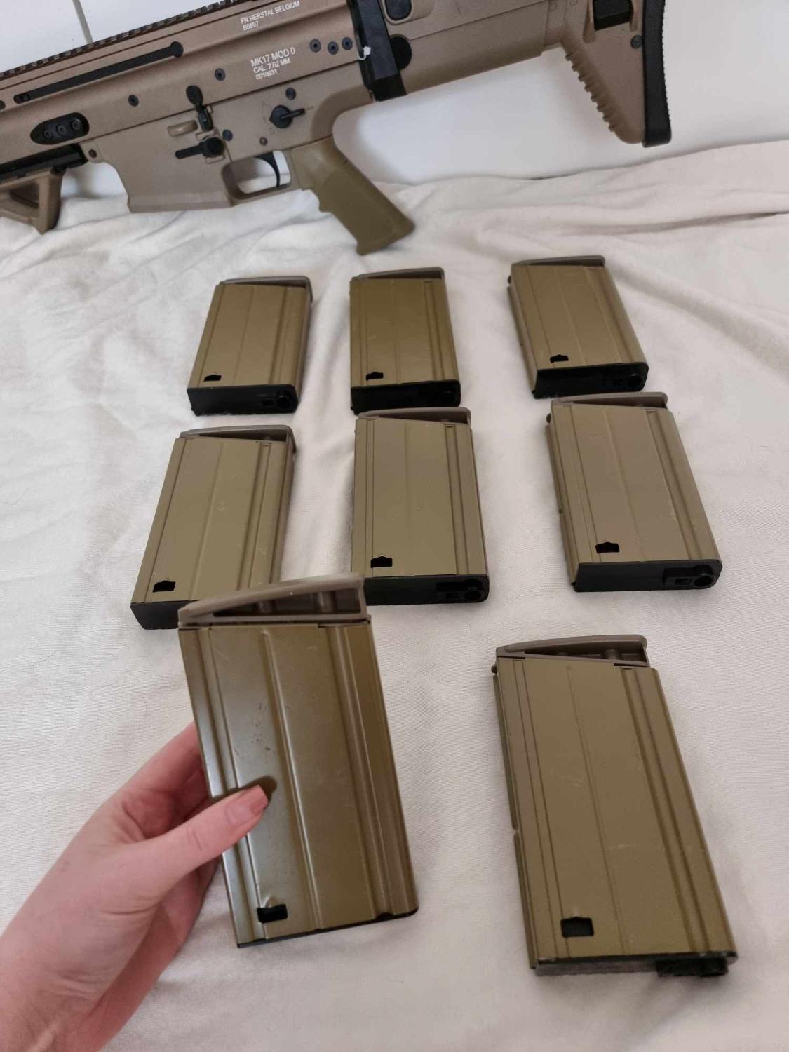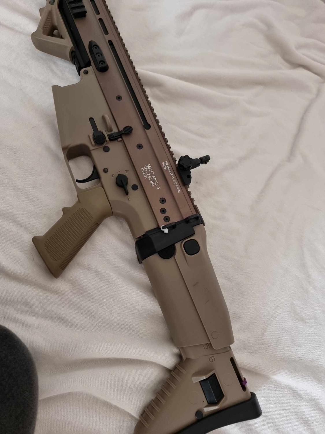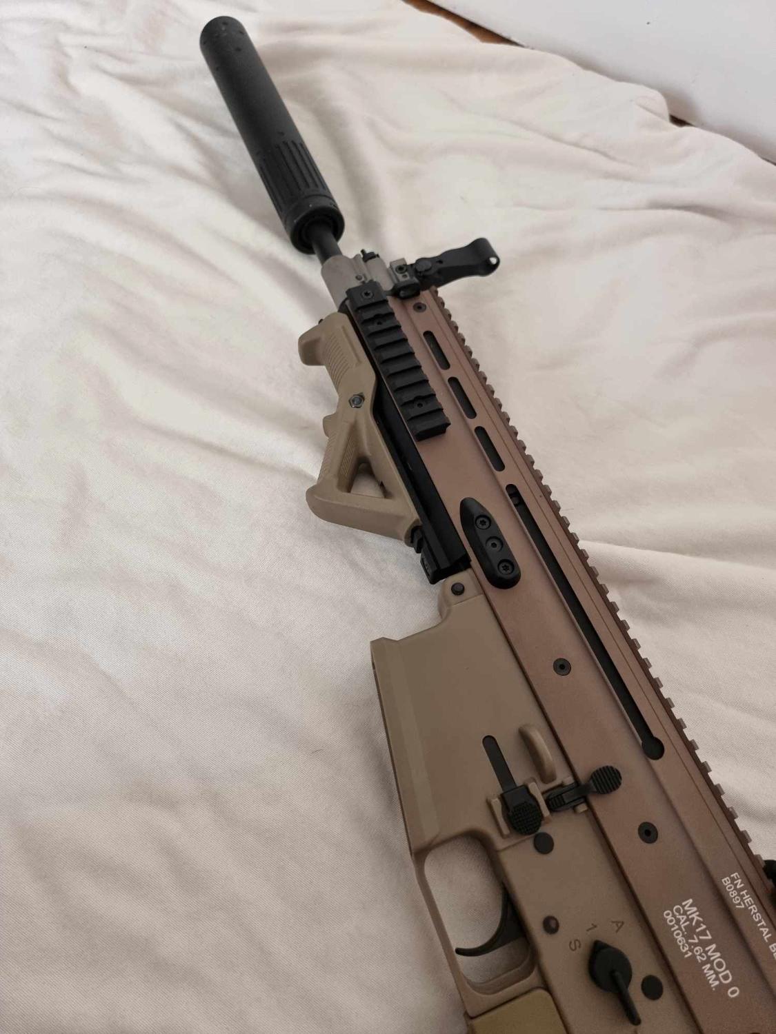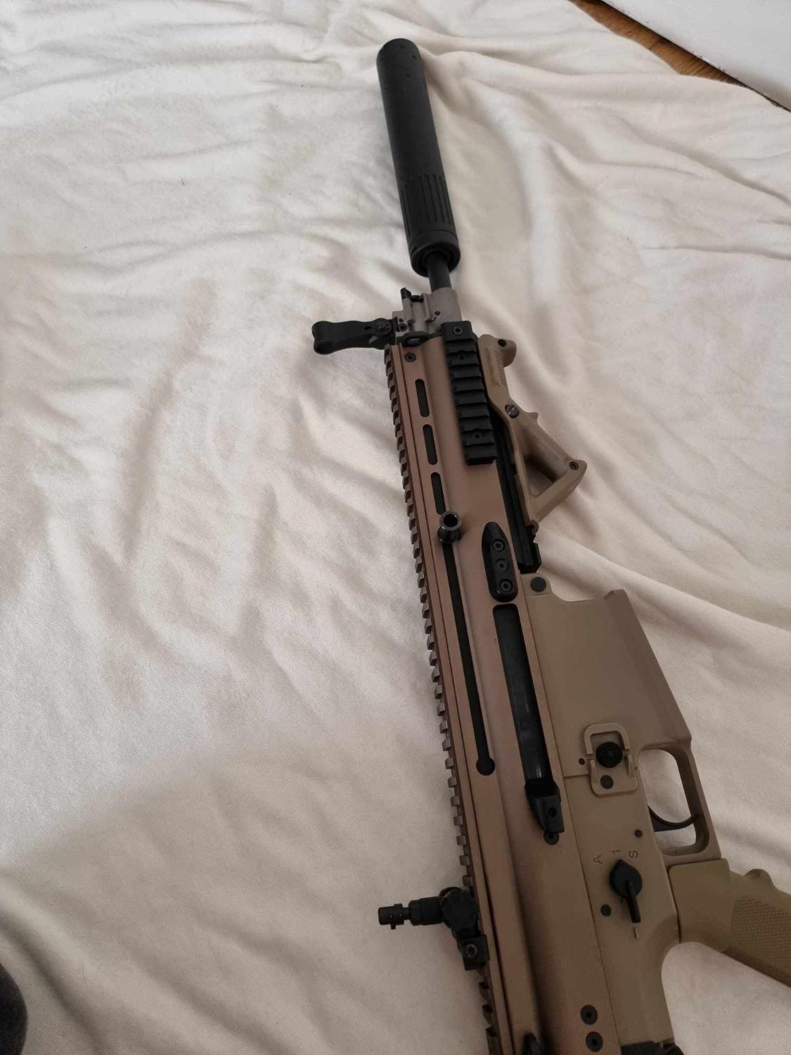 VFC Scar H DMR AEG. This has been fully upgraded. Gate aster mosfet M130 spring maple leaf hop bucking with an R-Hop. High torque motor, Piston and piston head have been changed but not sure what they are. Original steel 6.03 tight bore It has 8 mid caps and 5 high caps. The gun comes as seen. A silencer that goes straight on to the flash hider Comes with 1x 11.1v lipo battery and original hard case. Locked at Semi only.