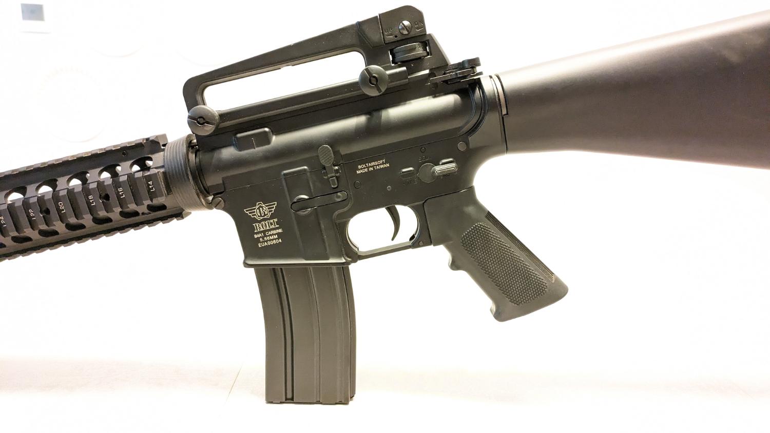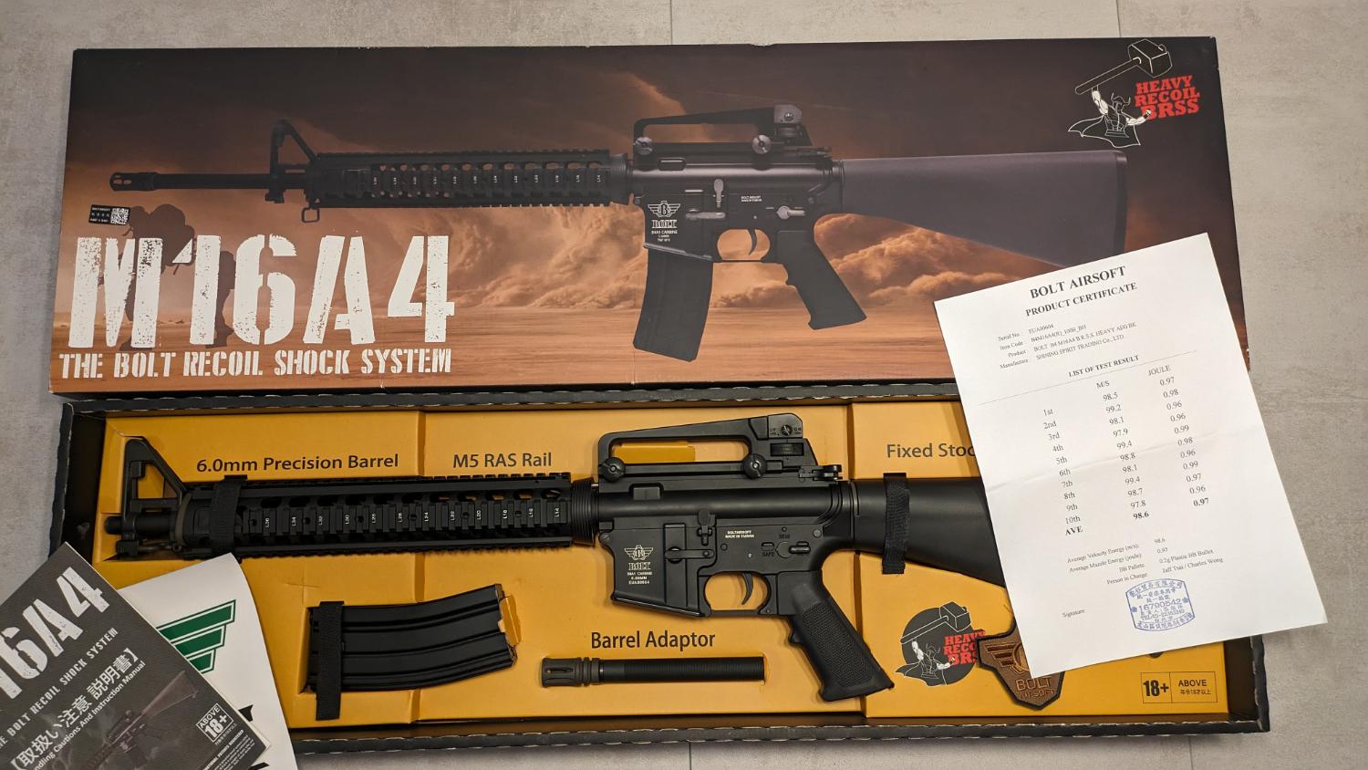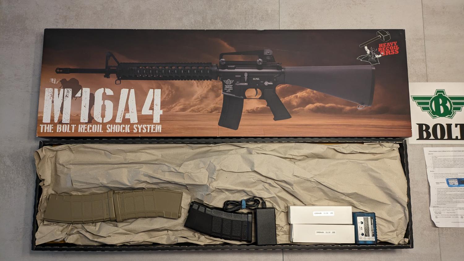 We have here a Bolt M16A4 EBB (Electric Blow Back) with 3 midcaps and 2 x 1000mah 11.1 15c liPo batteries complete with a charger.