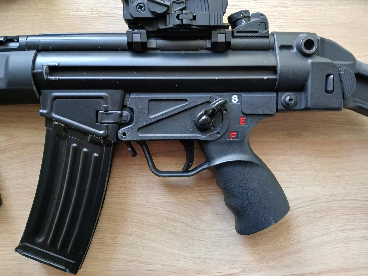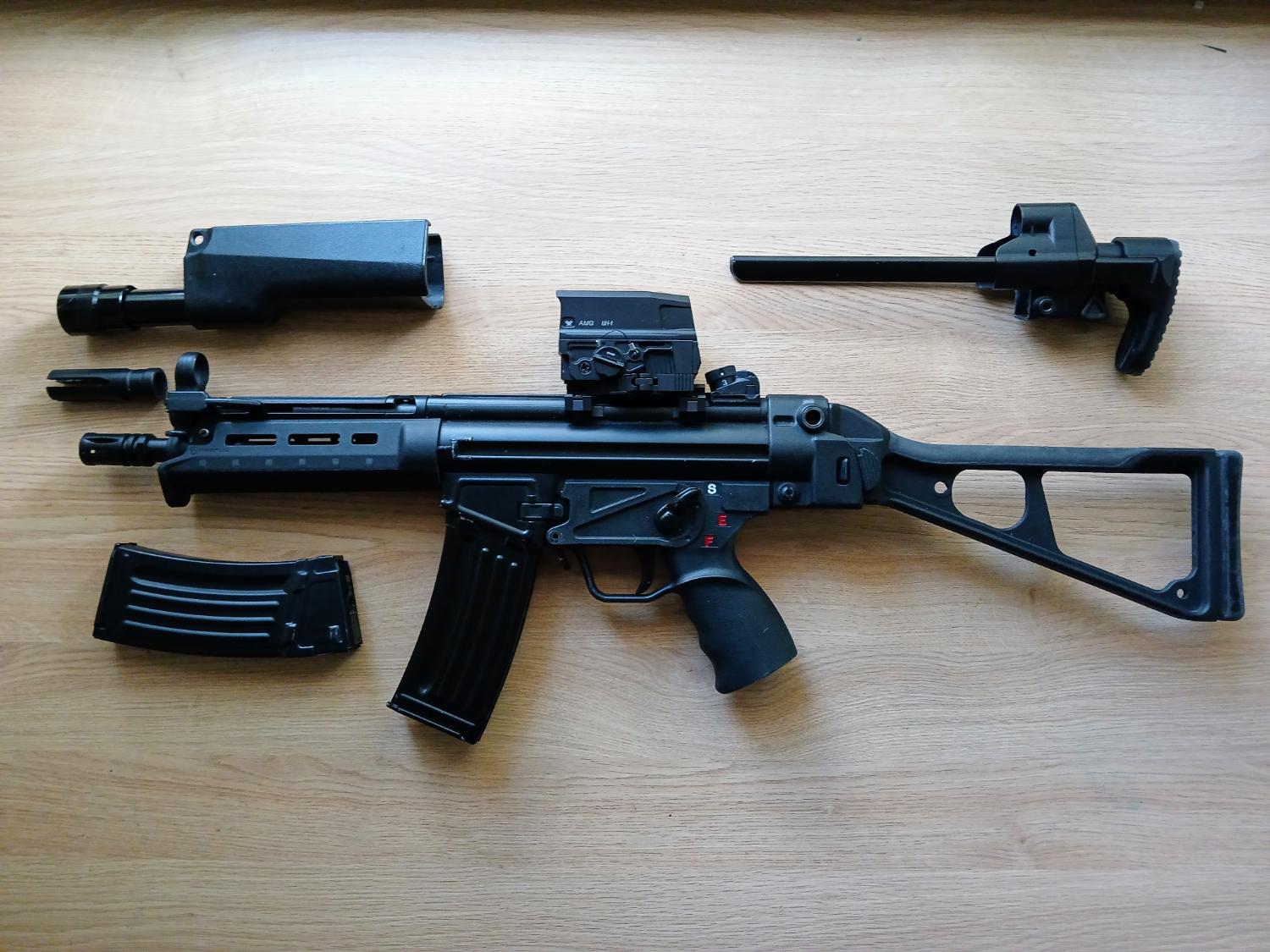 comes with real Magpul MP5 handguard, G&G folding stock with QD point and birdcage flash hider
