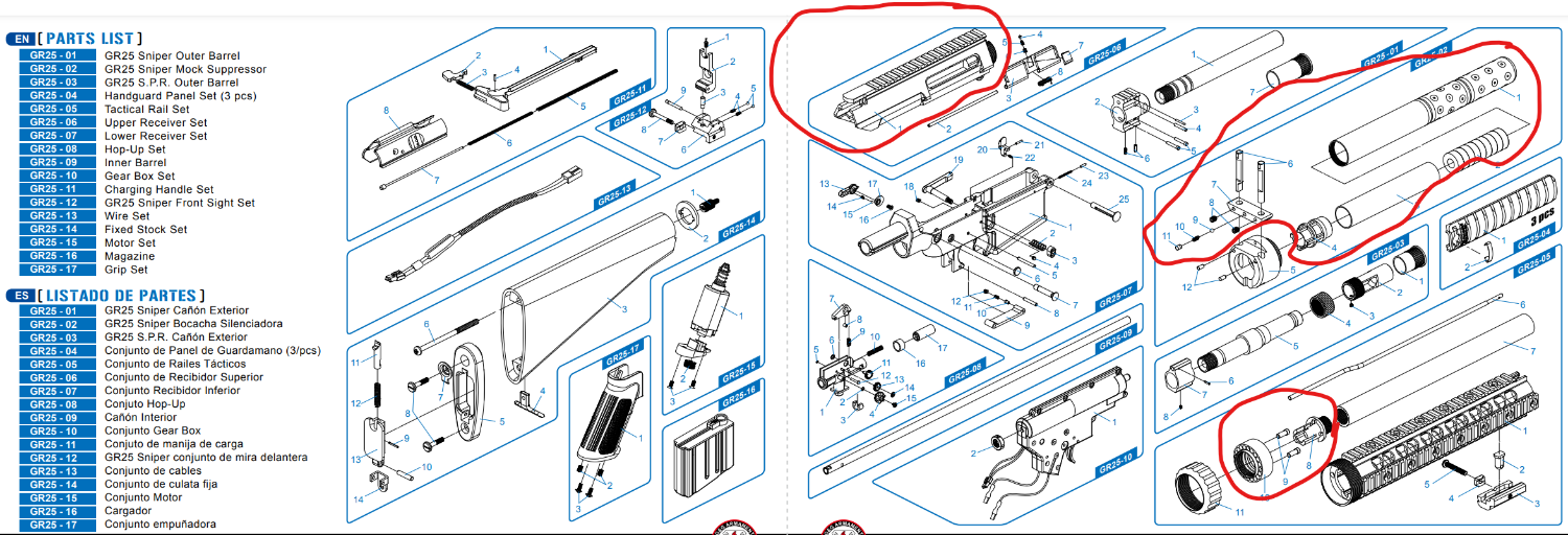 I need an upper receiver, part of the handguard lock ring and the barrel connector (all circled in the second image).