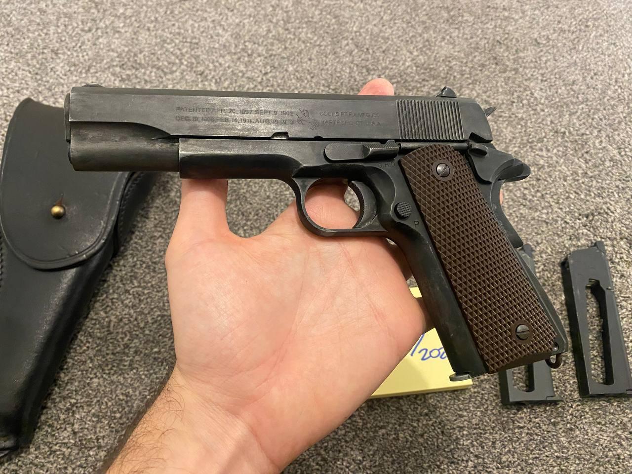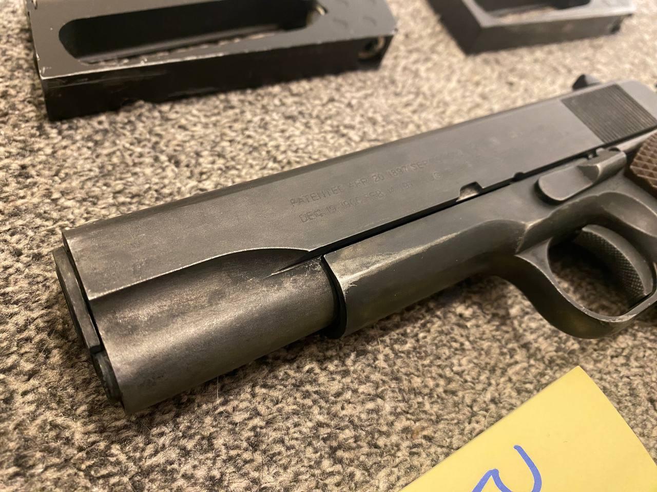 Selling off this old KWC M1911A1, initially the parkerized version, which had really nice markings. Has been refinished (blued), finish has wear and holster wear, mainly used it to reenact.