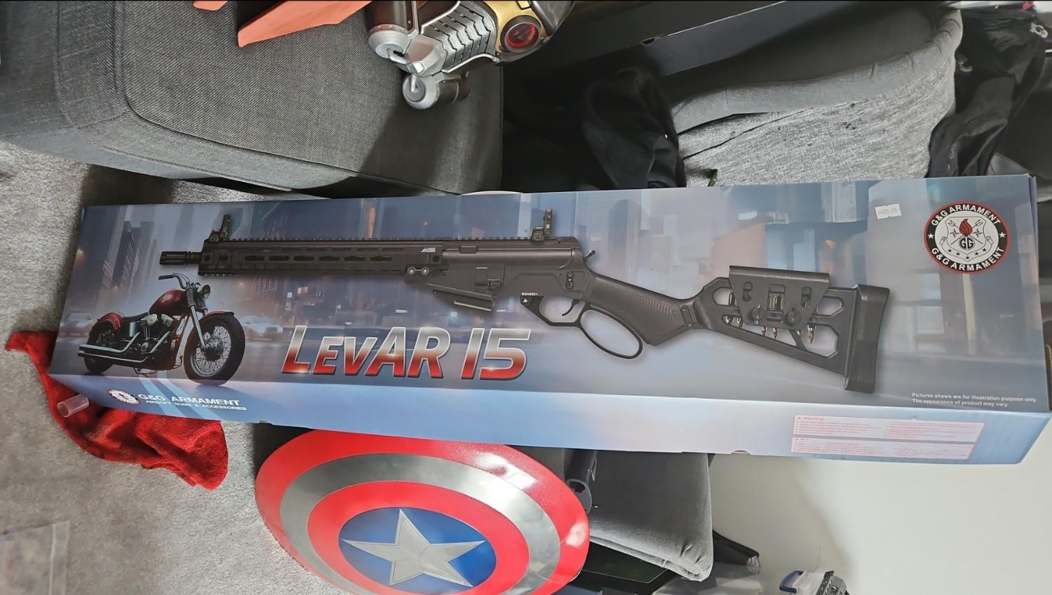 The infamous LevAR 15. Bought this on Pre order and has been skirmished once. Not my play style at all but might be yours. Can be run on green/red/black gas, or if you buy a HPA tap, can use a bottle with it. Takes regular M4 mags, and comes with a small 32 round mag as stock.