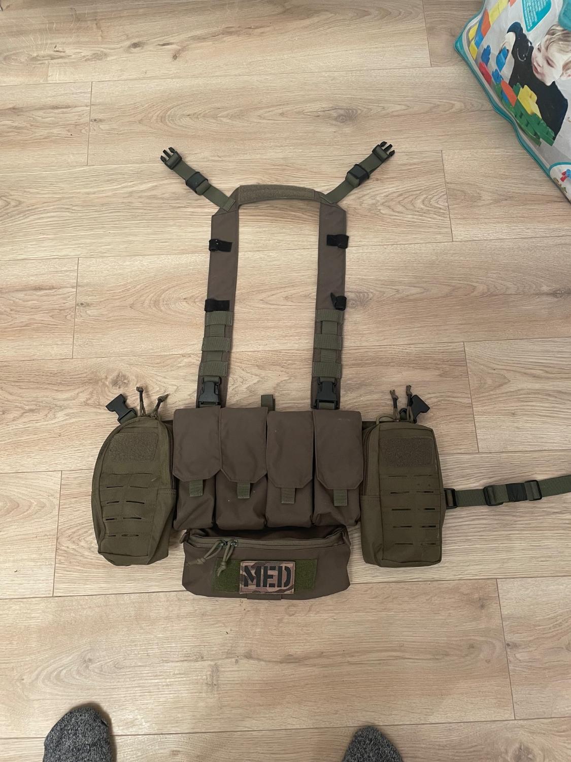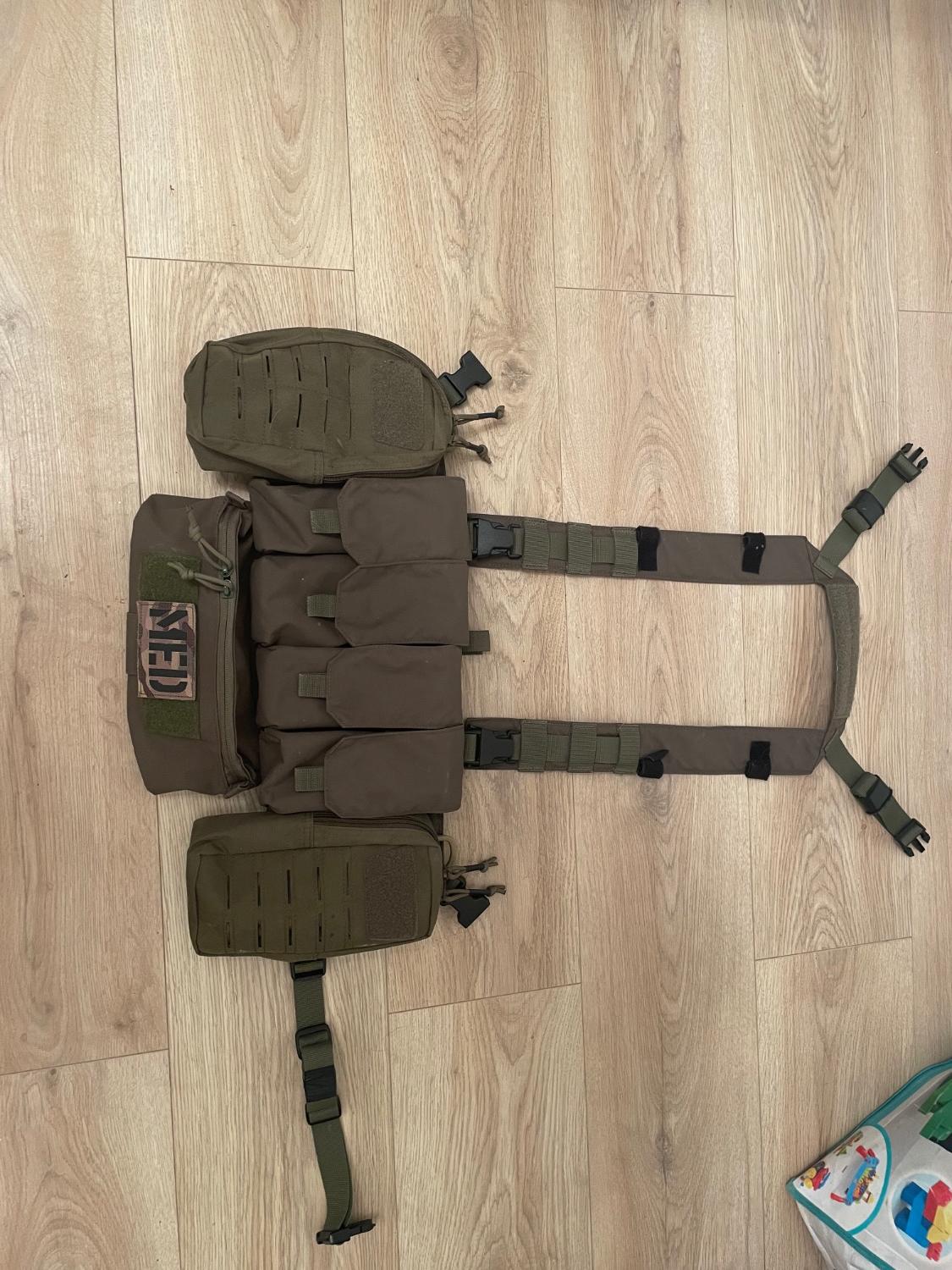 Comes with everything in the pictures, chest rig itself, two large gp pouches, dangler pouch, £45 posted plus’s pp fees