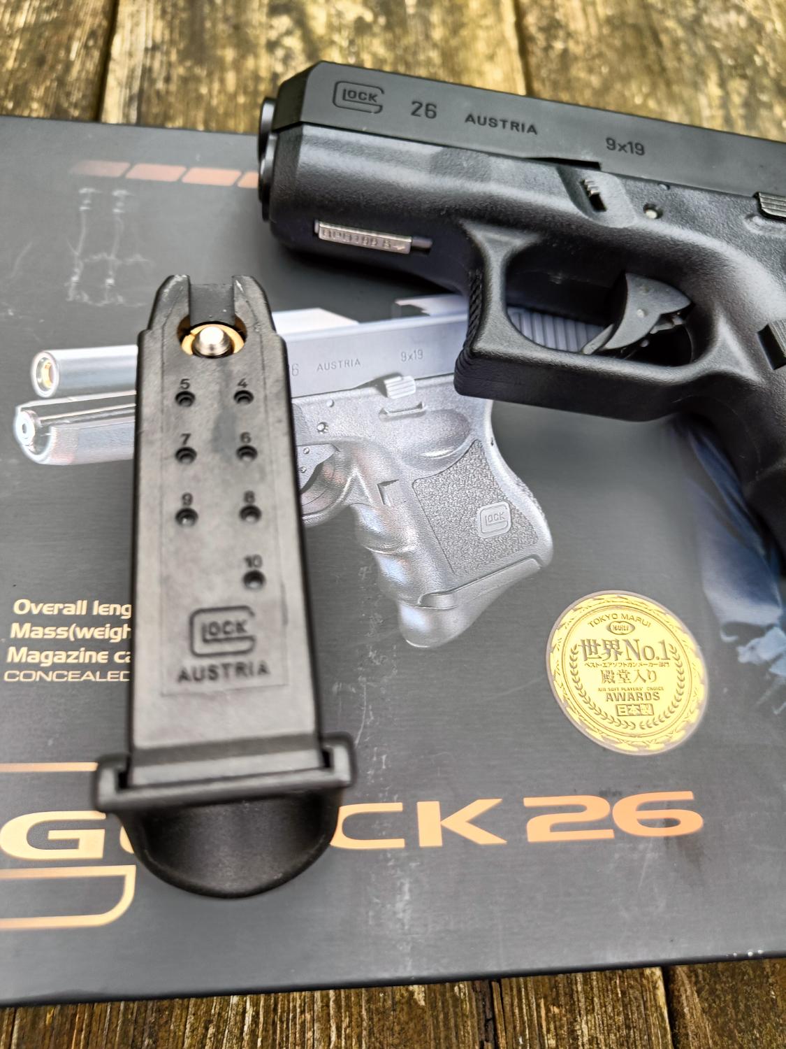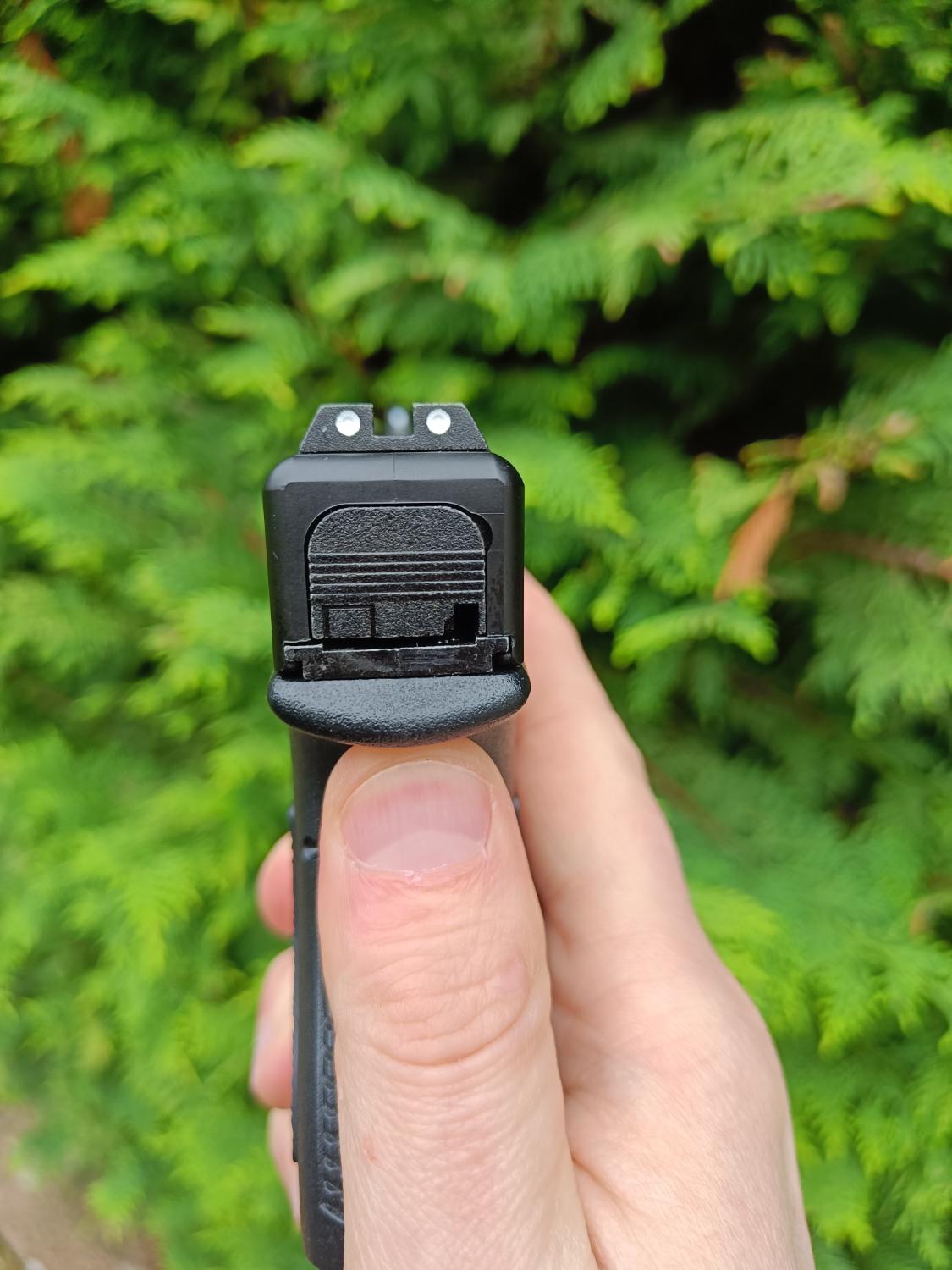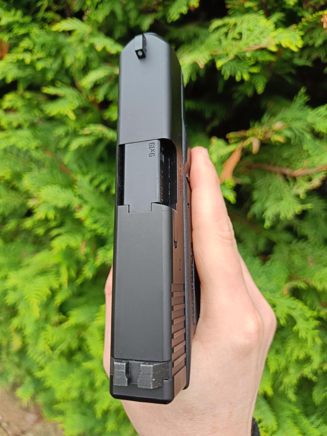 Fun fact, while many people assume this is a Gen.3 (like the original 17, 22 and 34), it is in fact a replica of the Gen.2.5 Glock 26. It has finger grooves but they're smooth and not checkered like the Gen.3.