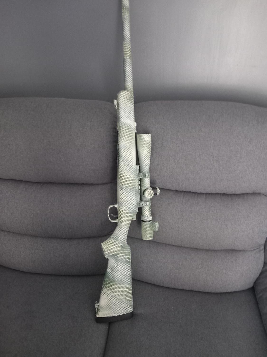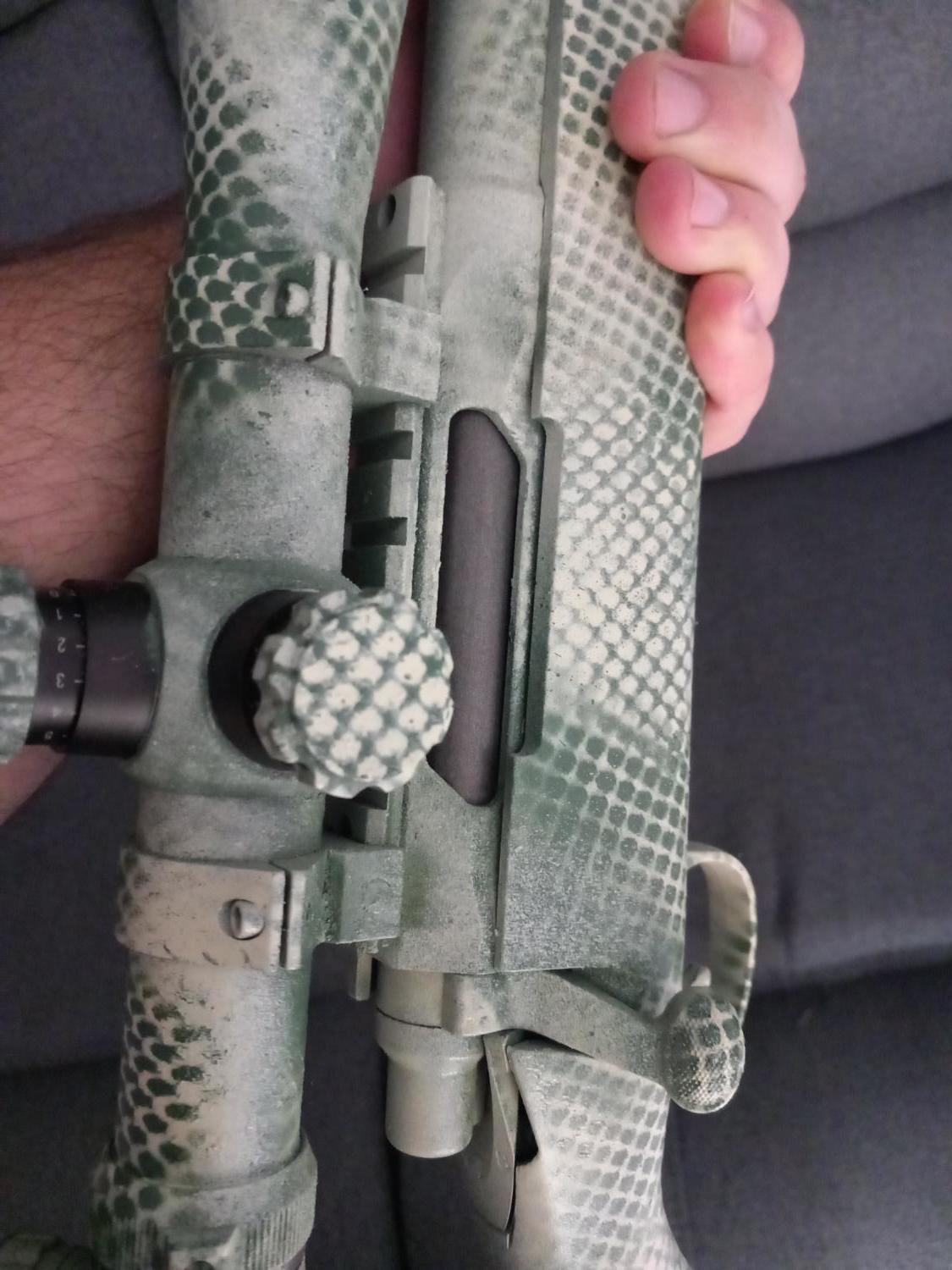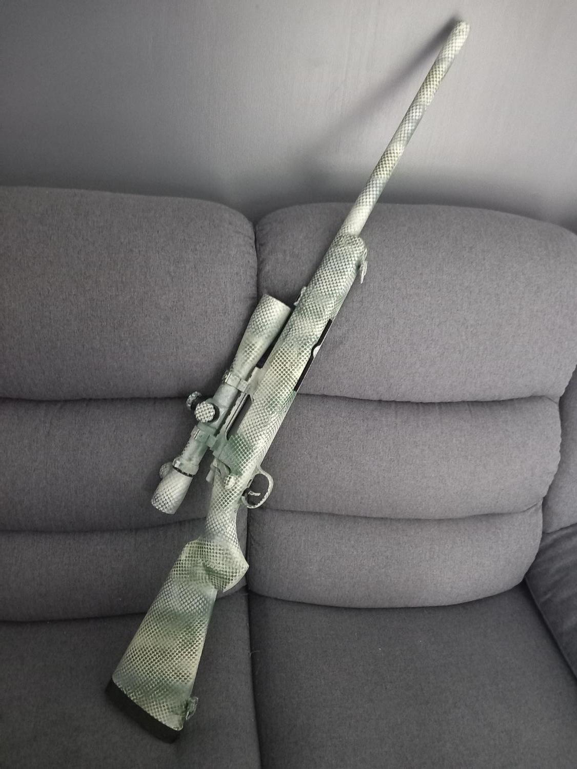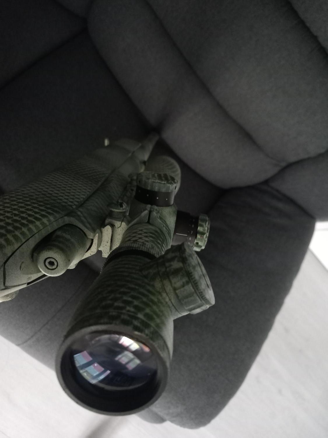 Started out as a jg bar 10 but the only jg part left is the outer barrel and stock. performs exceptionally well and is extremely lightweight with a very smooth bolt pull, can accurately fling a .43 out 90ish meters no problem at 2.1 joules just below the limit. I get the camo isn't to everyones taste, I used this mostly at humber airsoft situated in a quarry so the contrast of green and a pale sand works out perfectly, not the prettiest rifle in the world but its been built to go, not for show.