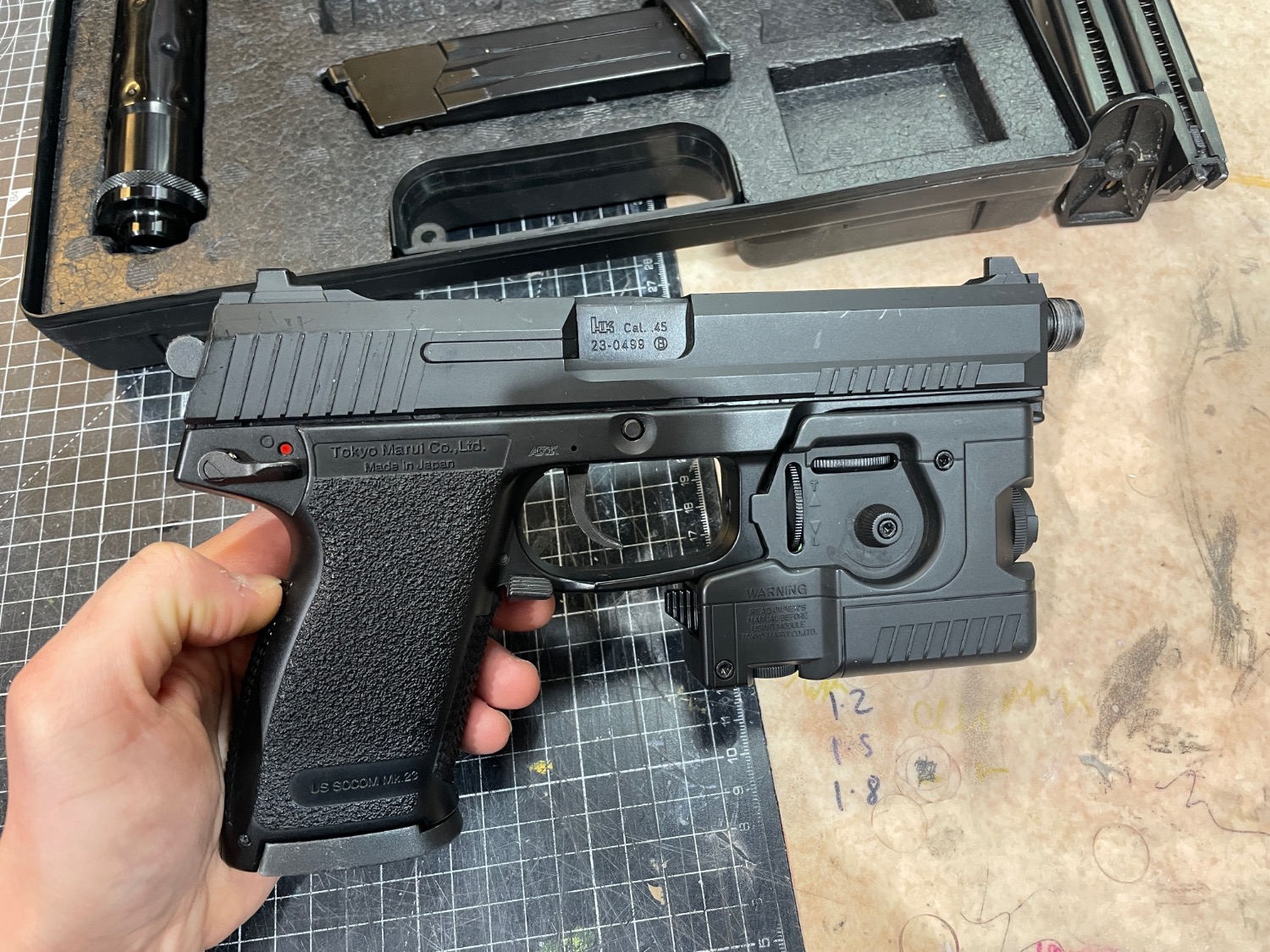 Classic Tokyo Marui brand MK23, comes with its suppressor and LAM unit, tested and works but will need 3XAAA batteries, and 4 mags 1 is the original and the other 3 are ASG and have been resealed to hold airtight.