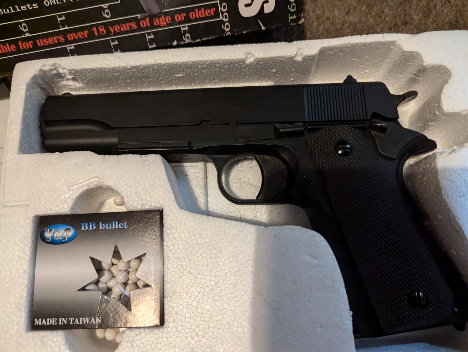 Having a bit of a clear out, good holster filler. This a Chinese NBB M1911, the magazine is removable and the hammer moves back, that is all. Plastic construction. Leaks at current but new o ring on the valve will sort it. It does perform well for a cheap NBB pistol. Decent range, fixed Hop.