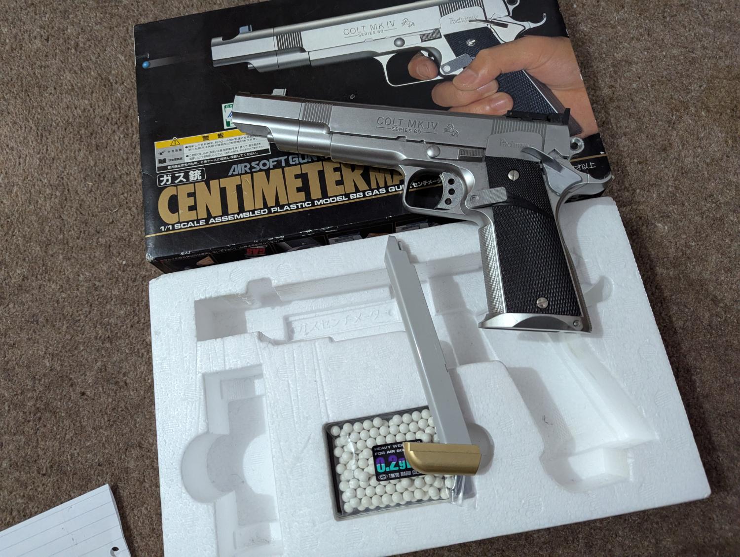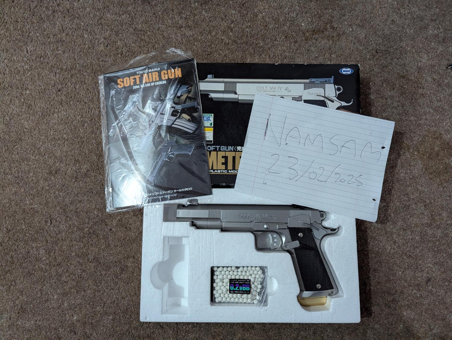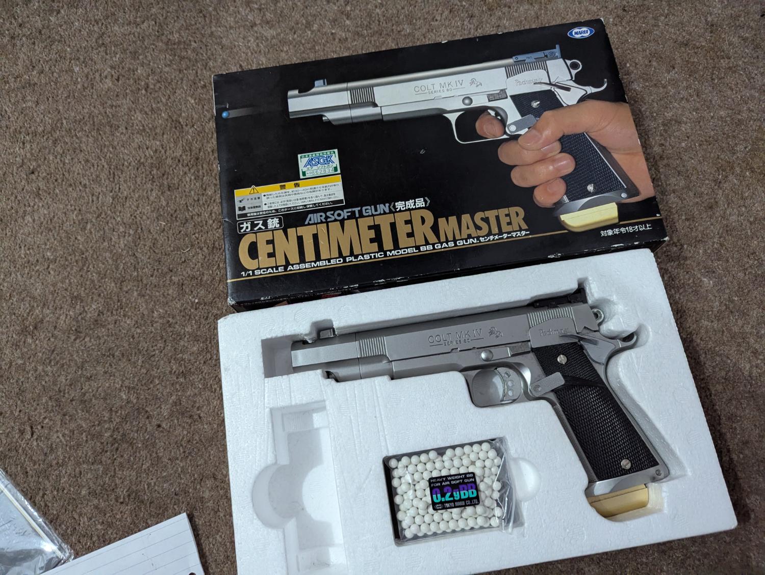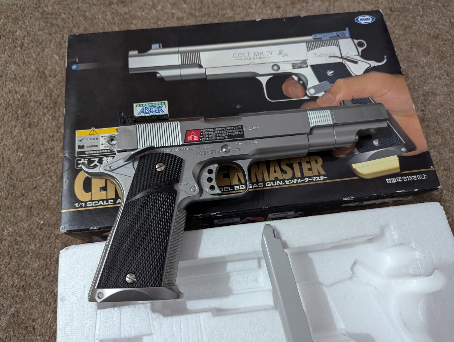 Those that know, know. This is Classic Tokyo Marui. This is the NBB version of the Centimeter Master pistol, it is of plastic construction and has never been skirmishes, hence the original stickers still on the slide. It comes complete with box, manual and 2004 Marui Catalogue!!