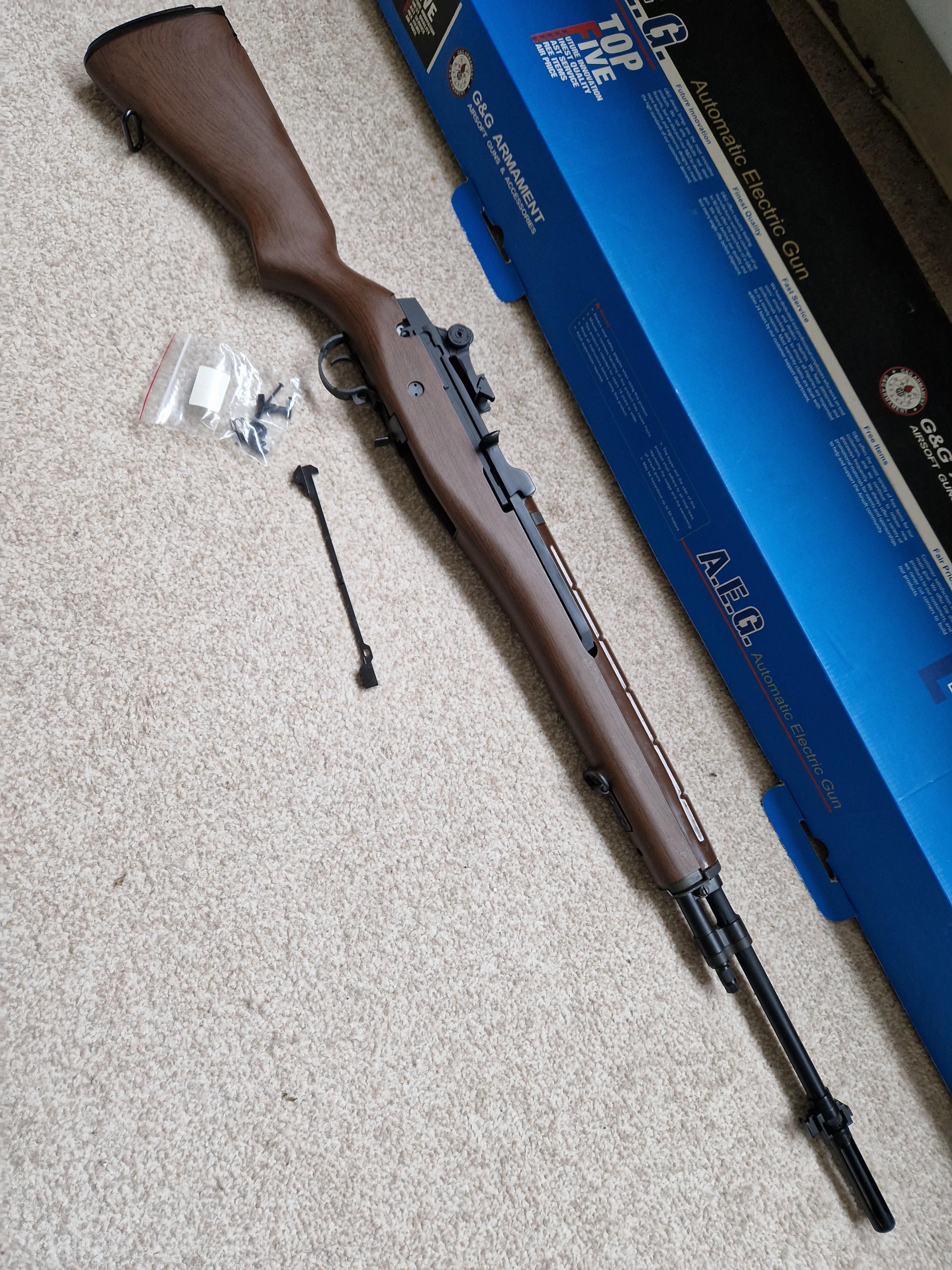 This is a boneyard g&g m14 that I originally got as a box of bits. I've attempted to reassemble it but the video I was using a a reference skipped the bit where you add the selector switch, so those bits are still loose but included. There are a couple of other bits I missed as you'll see from the last photo. It is missing it's front sight but everything else I think is there. (sixmm.com have a cyma front sight in stock that may fit). The externals are in very good condition.