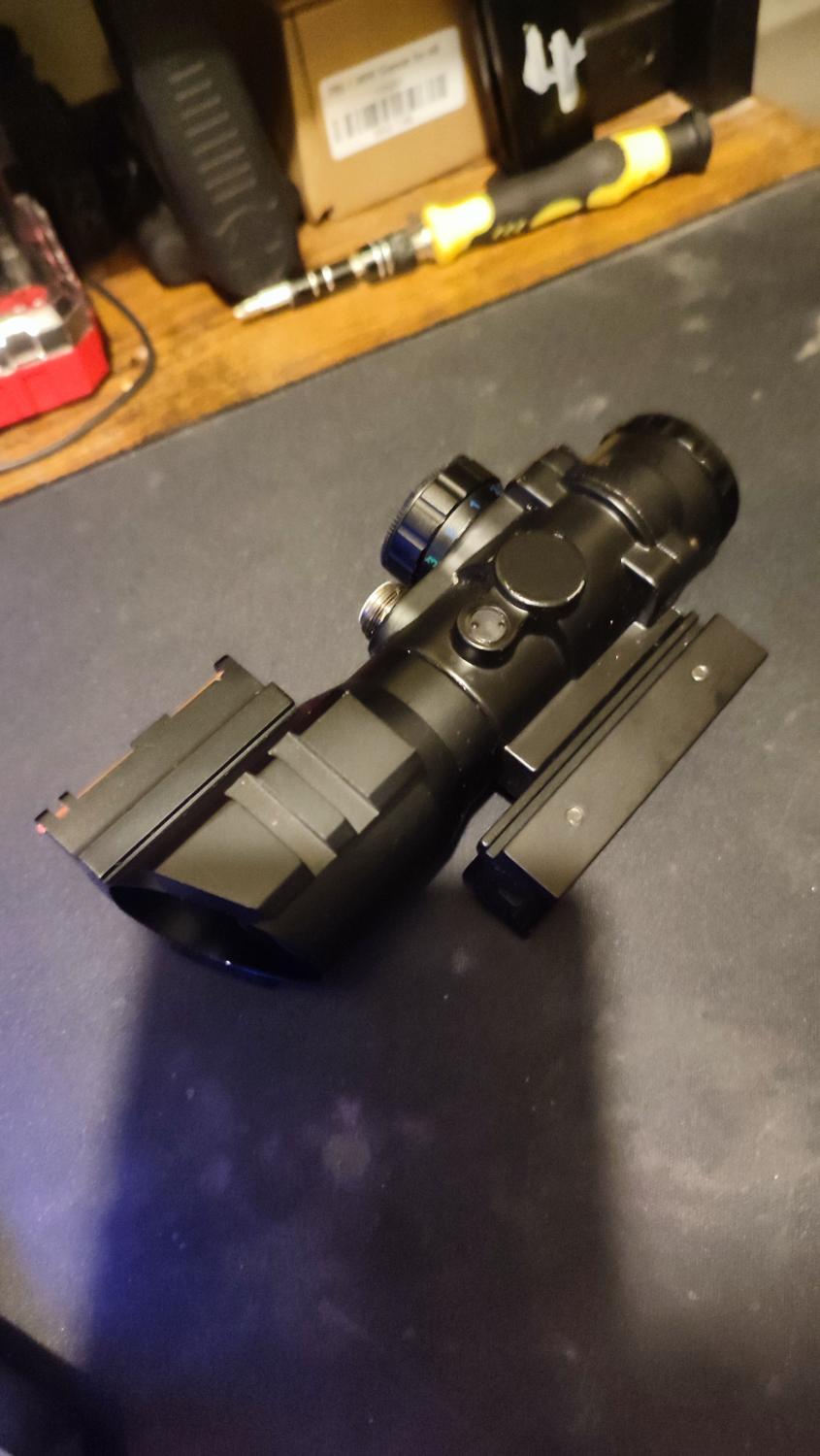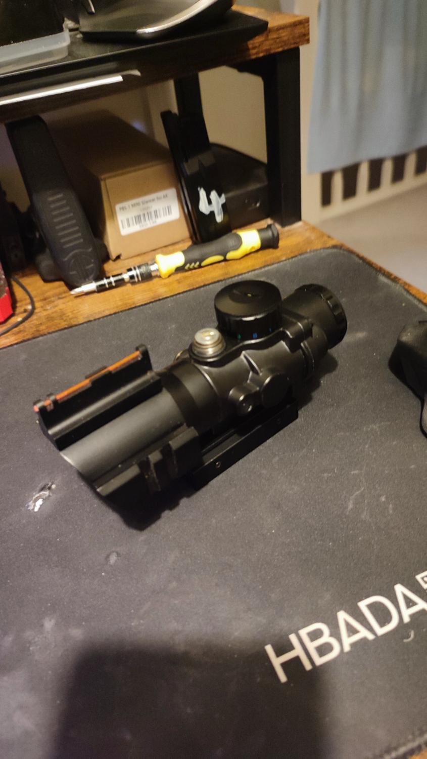 Comes with one high cap mag, front grip, scope and some rail cover.