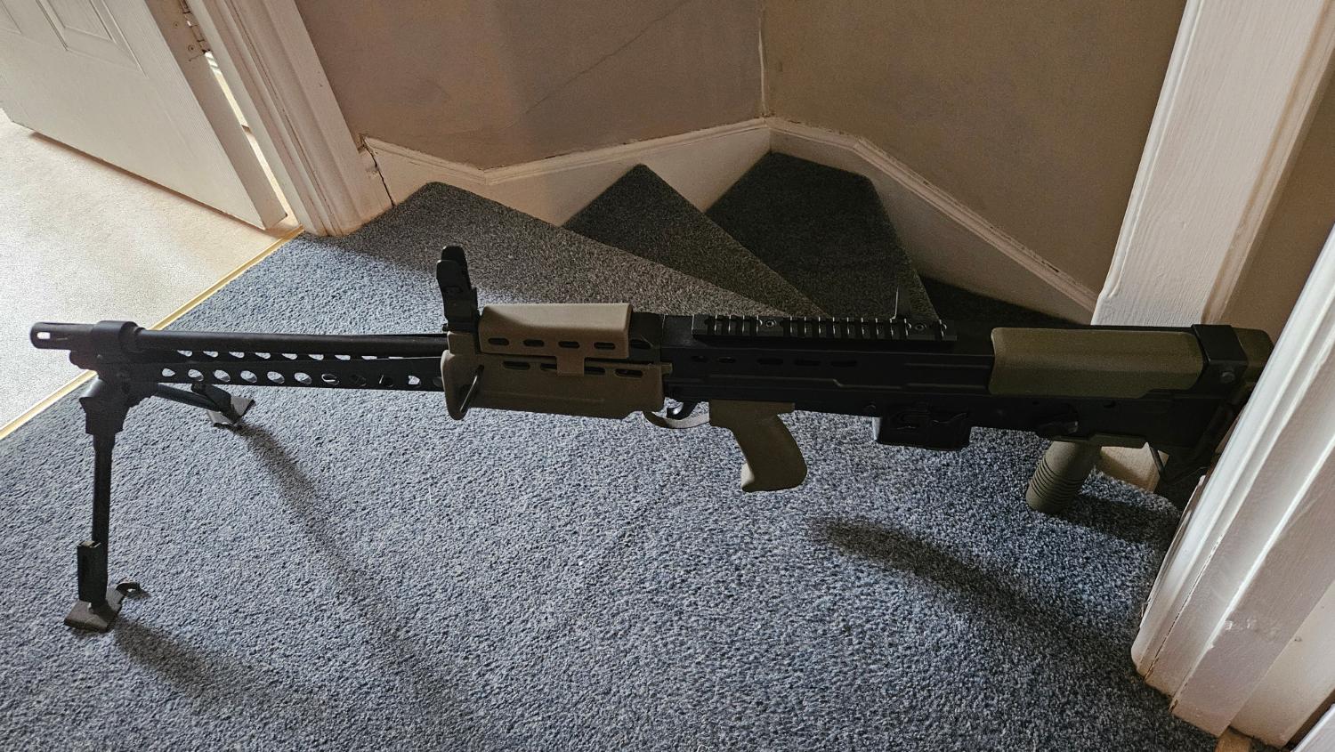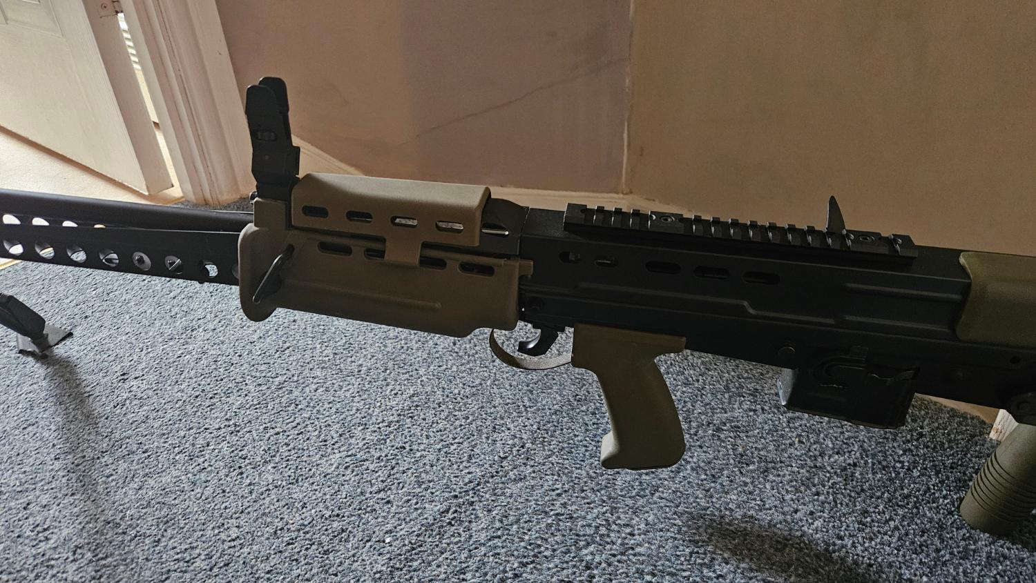 Skirmish It once, carry handle is removed and a picatinny rail installed, also wired for deans.