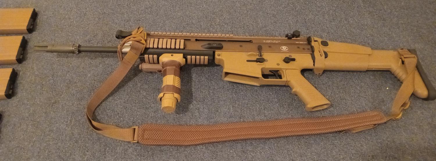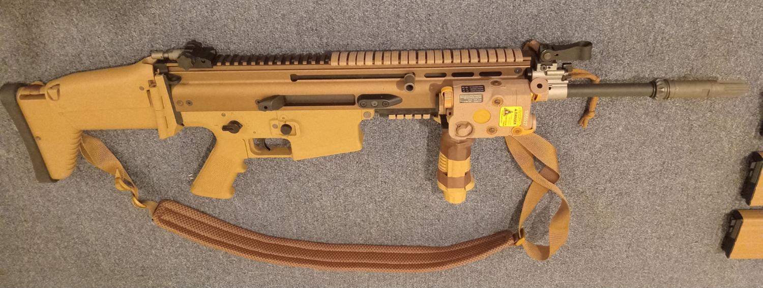 No upgrades to the SCAR itself. But it shoots around 360fps on green gas so it had been modified to make it single shot only to use as a DMR) The modification is internal and can be revoked by an engineer if desired, it is a simple reattachment near the trigger.