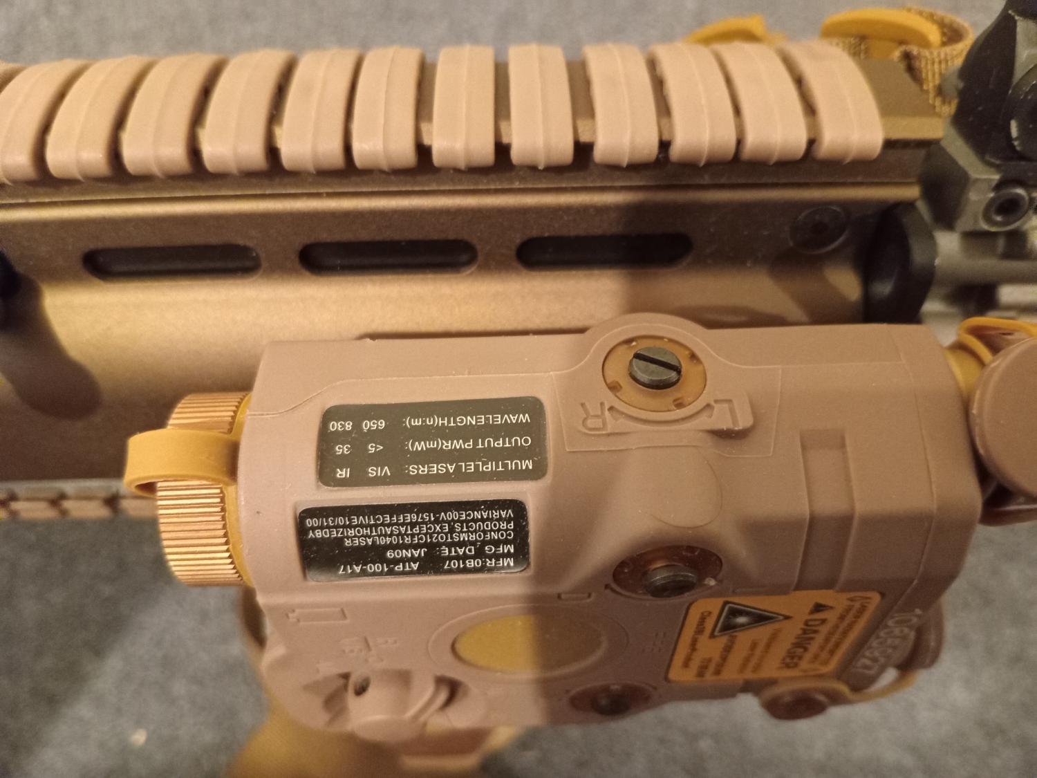Fully working PEQ box (never tested the IR laser but everything else works) needs new battery. Can be used on the grip switch or on all the time.
