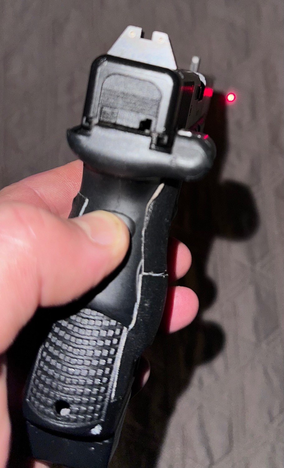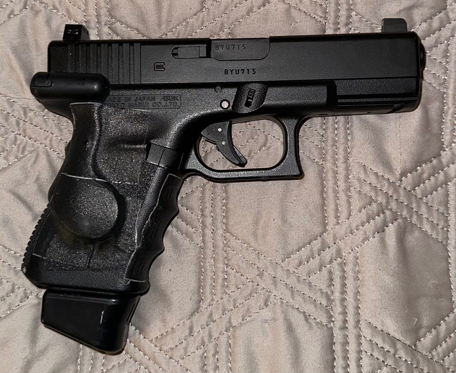 5 Tokyo Marui G19, tritium sights, crimson trace style laser grip, 2 mags with plus 2 style extended base plates. All gas tight