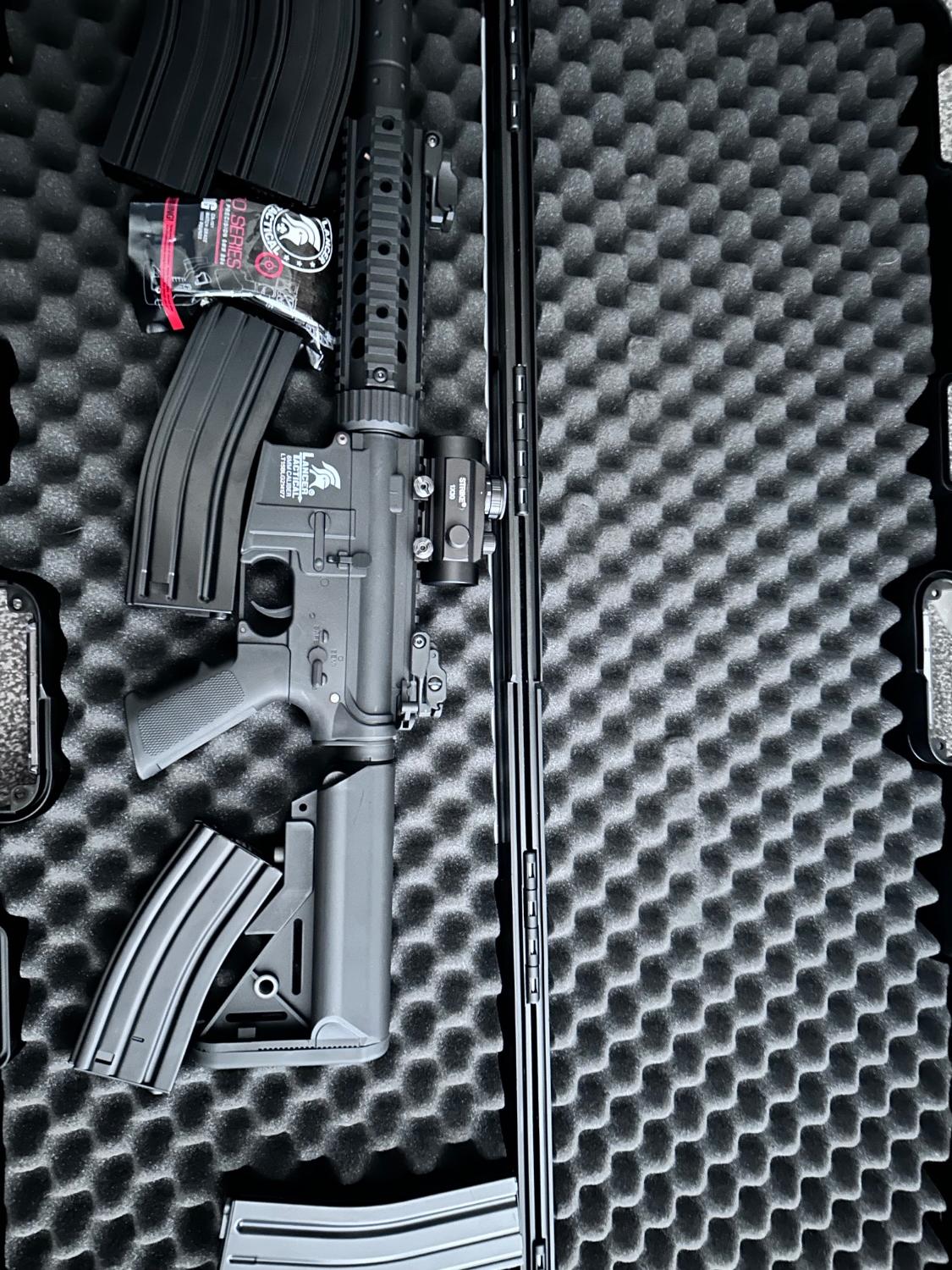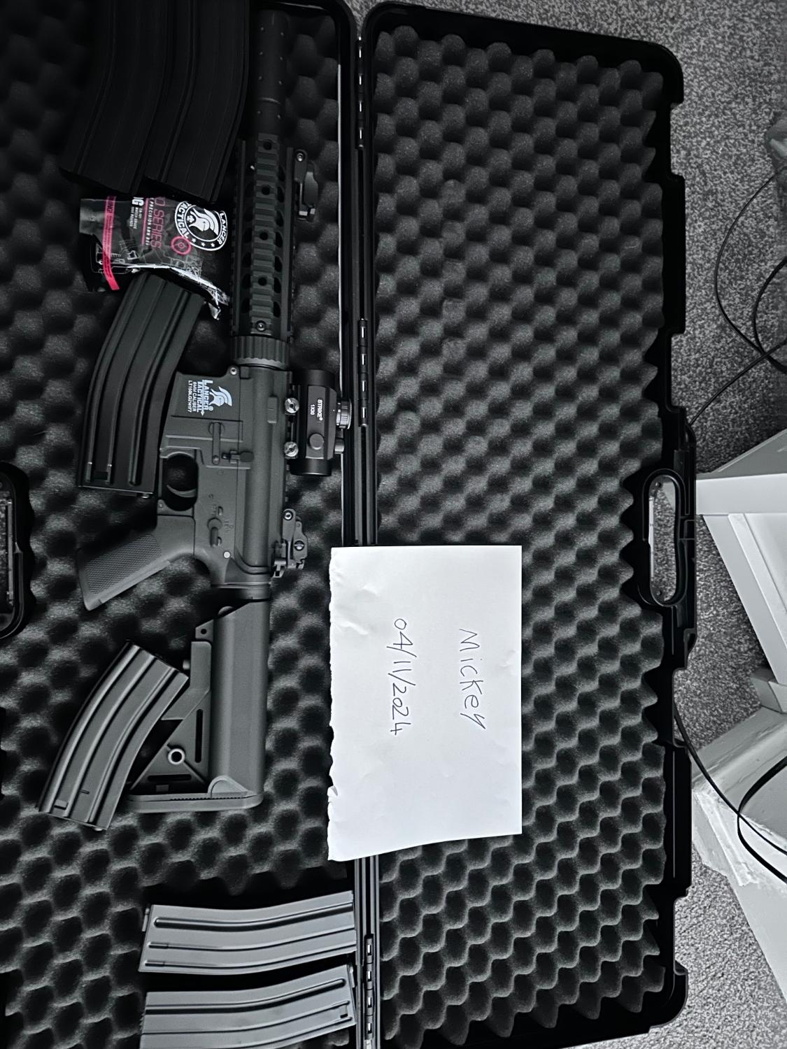 I bought it to play but never did. I only shot a mag full. I asked a friend to find the right one for me so I don’t really know what it is. It comes with 6 mags, a hard case, battery’s+charger, 2 sights, a mesh mask for nose and mouth and googles for prescription I think I’m not sure.