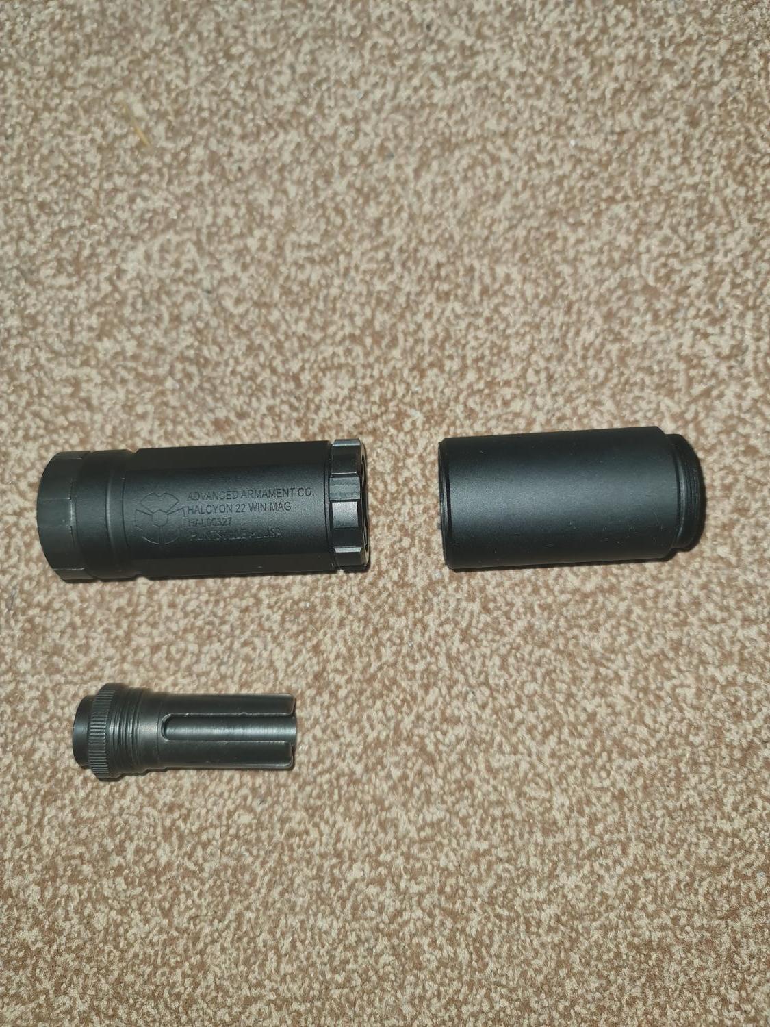 Selling as the gun I had for it I'm selling so no longer need it. I'm not sure on the brand however I bought it from a custom airsoft stand a vouole months back. It can be used as one full 150mm silencer or split it into a 75mm silencer in mint condition comes with a flash hider too