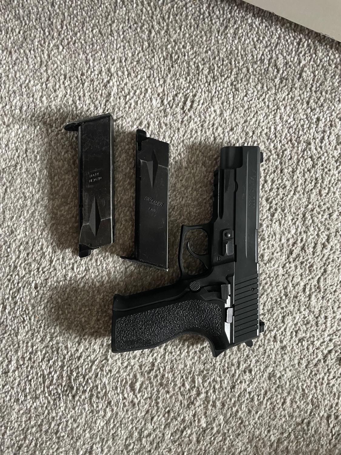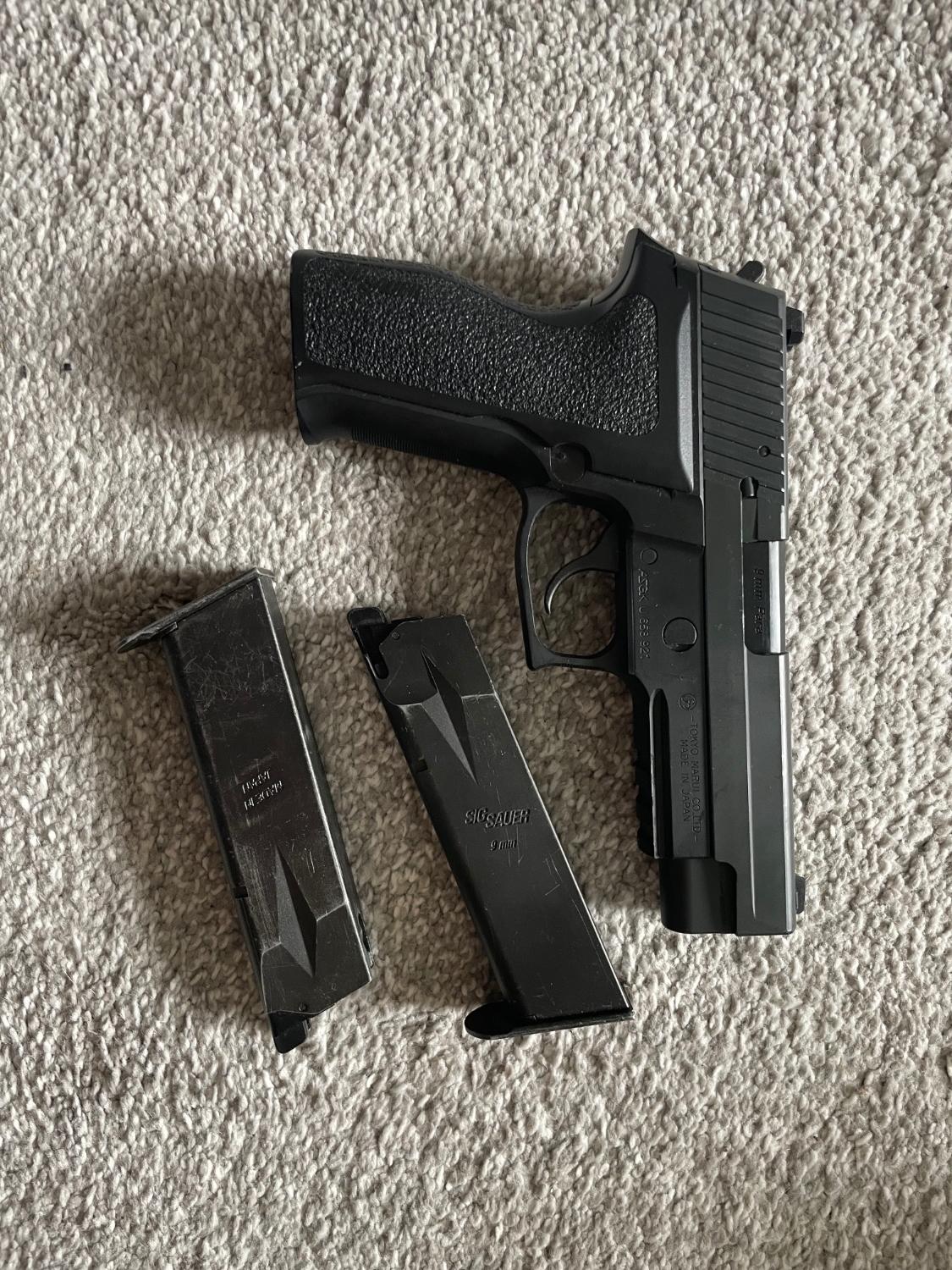 Tokyo Marui Sig P226 E2 comes with two leak free mags. Been skirmished with about 5 times, comes with a standard black belt holster