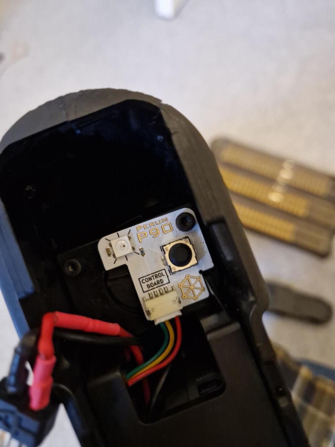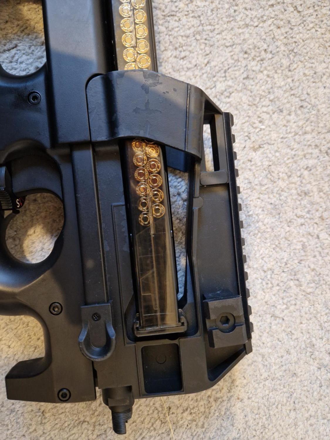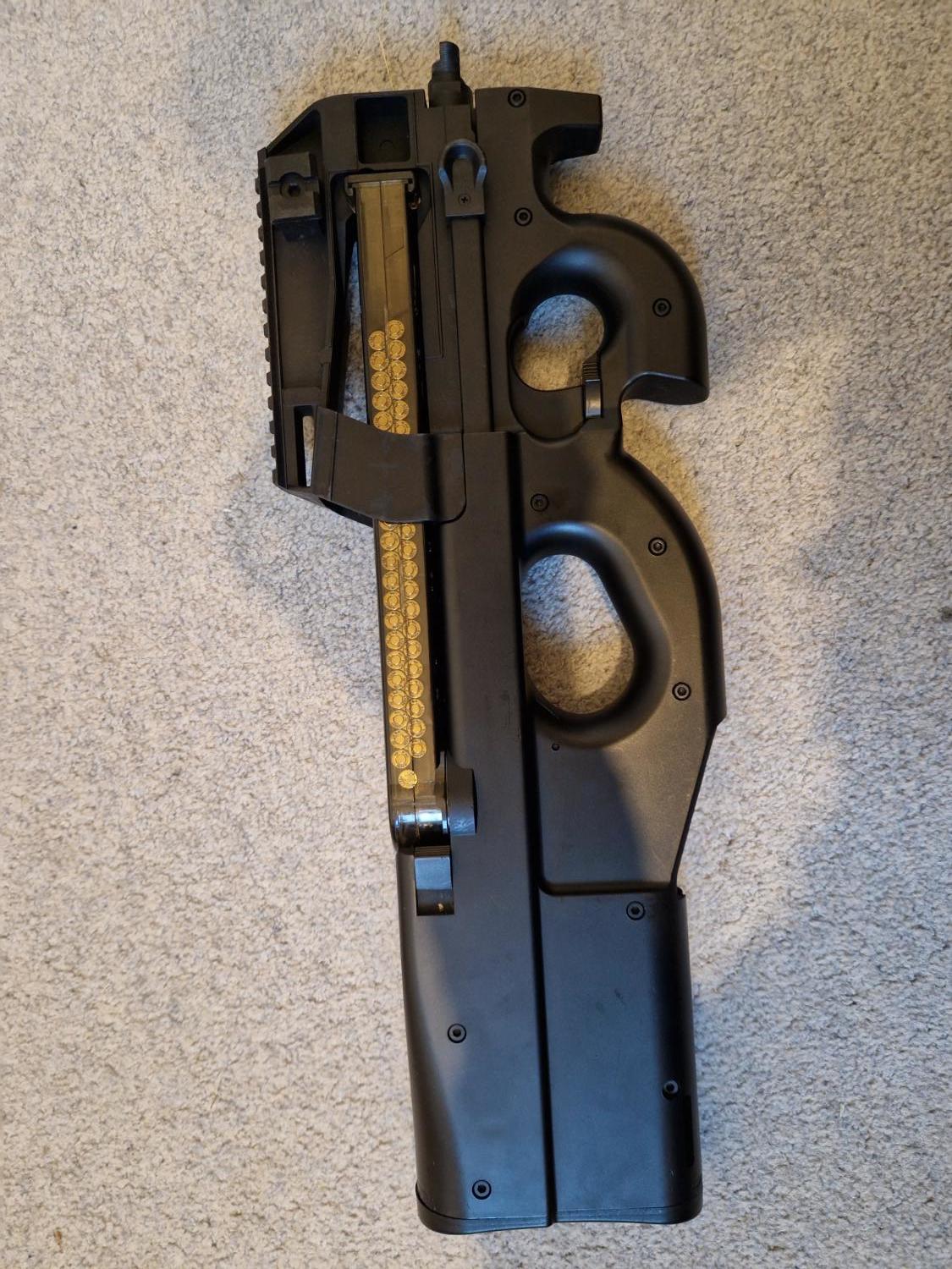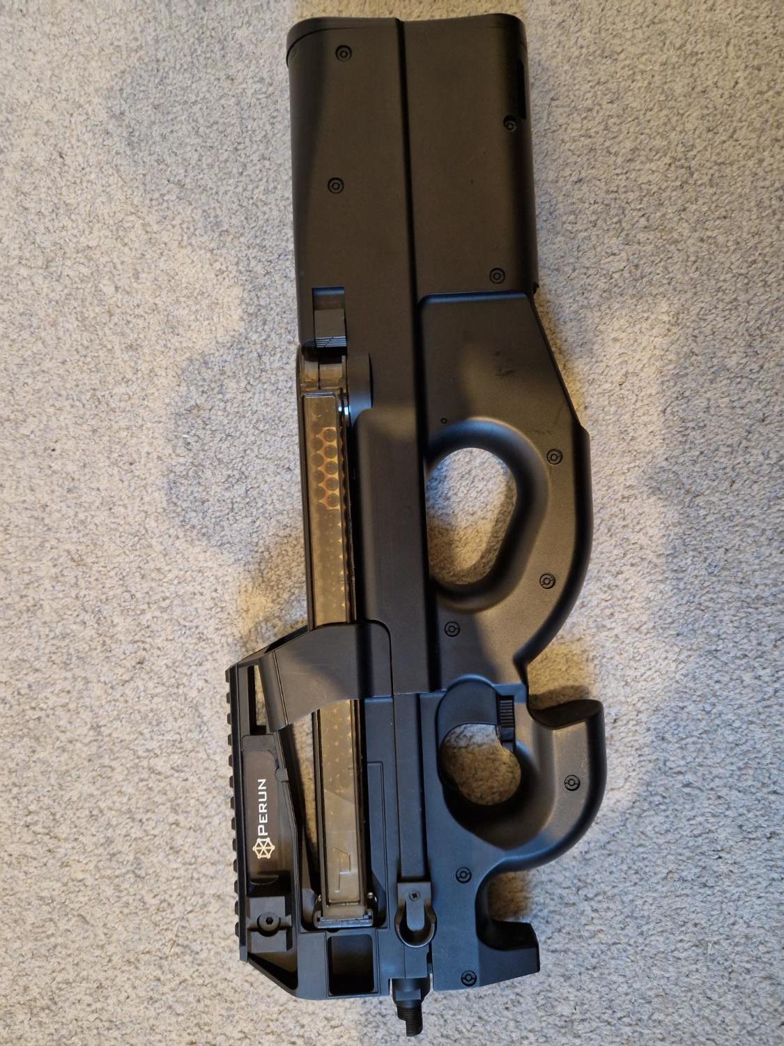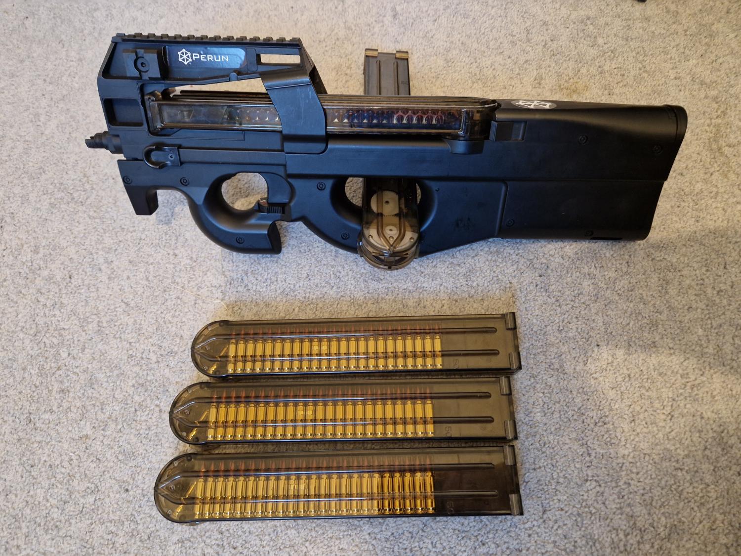 This is my double bell p90 with perun mosfet. It comes with 1 high cap and 4 68 round magazines. It cycles really smoothly and shoots around 280fps on 0.2g bbs.