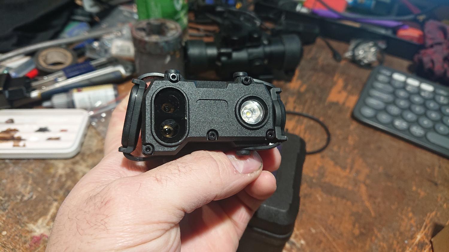 Bought, assembled, tried out in the garden and never used. This is an nvg10 1080P night vision monocular. Gets about 5 hour battery life. Works reasonably well on ambient light but also has a built in illuminator. Comes with its original box, charger and a metal adapter plate to make it fit the knockoff Wilcox mount it is shown attached to. This should fit the nvg mount on any fast style helmet. Also for sale is a wadsn Ogl laser module. This is a clone of the eotech laser module. The body is polymer but it contains both an ir and a visible laser as well as a visible torch. The dot is a little messy through the nvg10 but quite visible and useable.