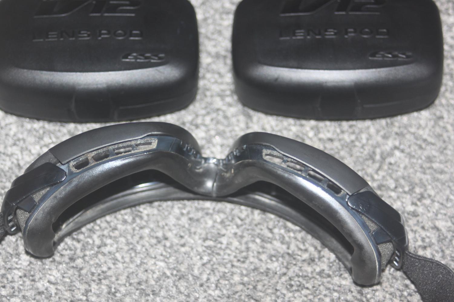 A pair of used ess V12 advancer Googles, the frame is now completely broken in half in the center so the only use is for someone needing the spare lenses and bag for another pair of googles.