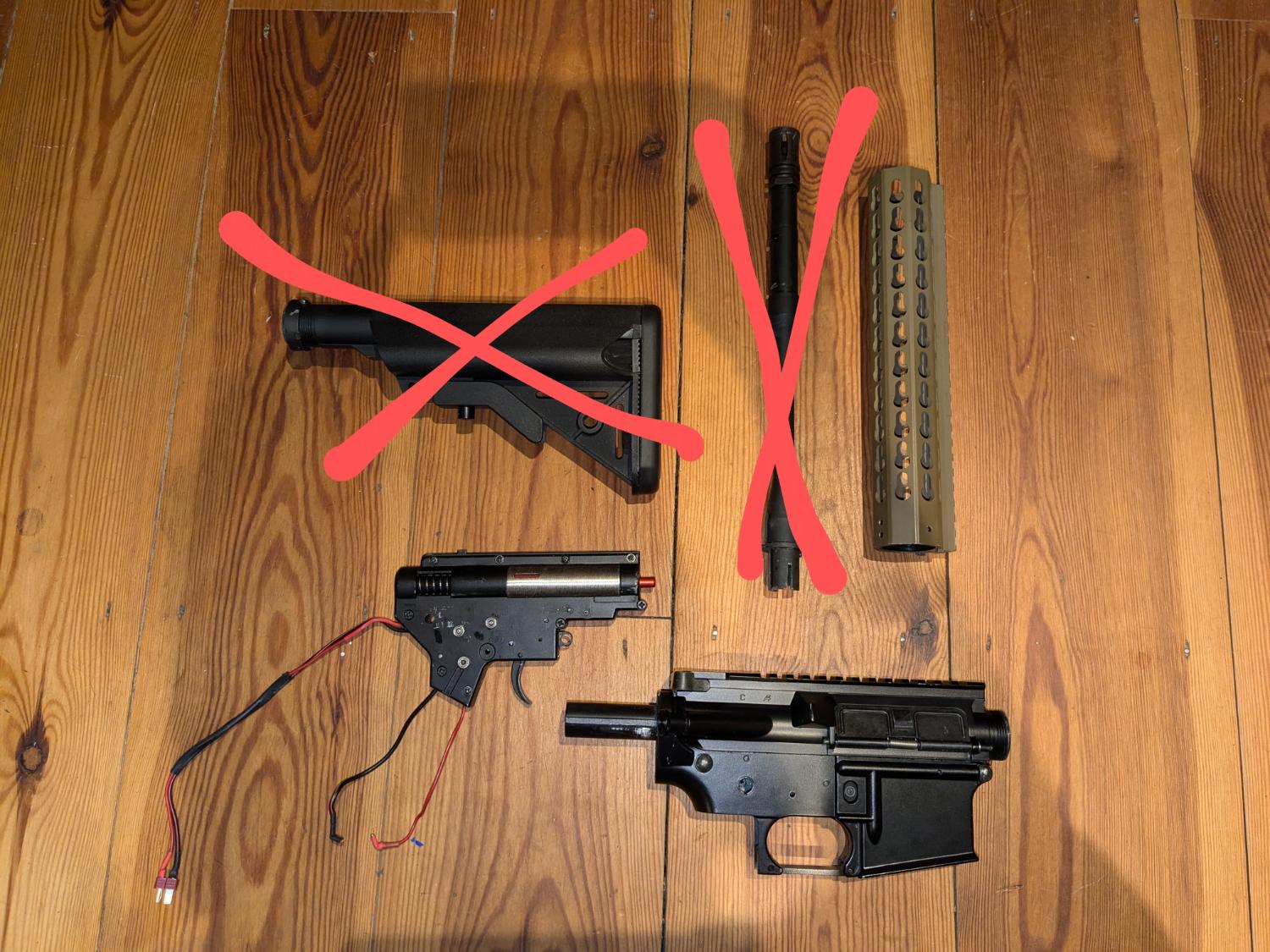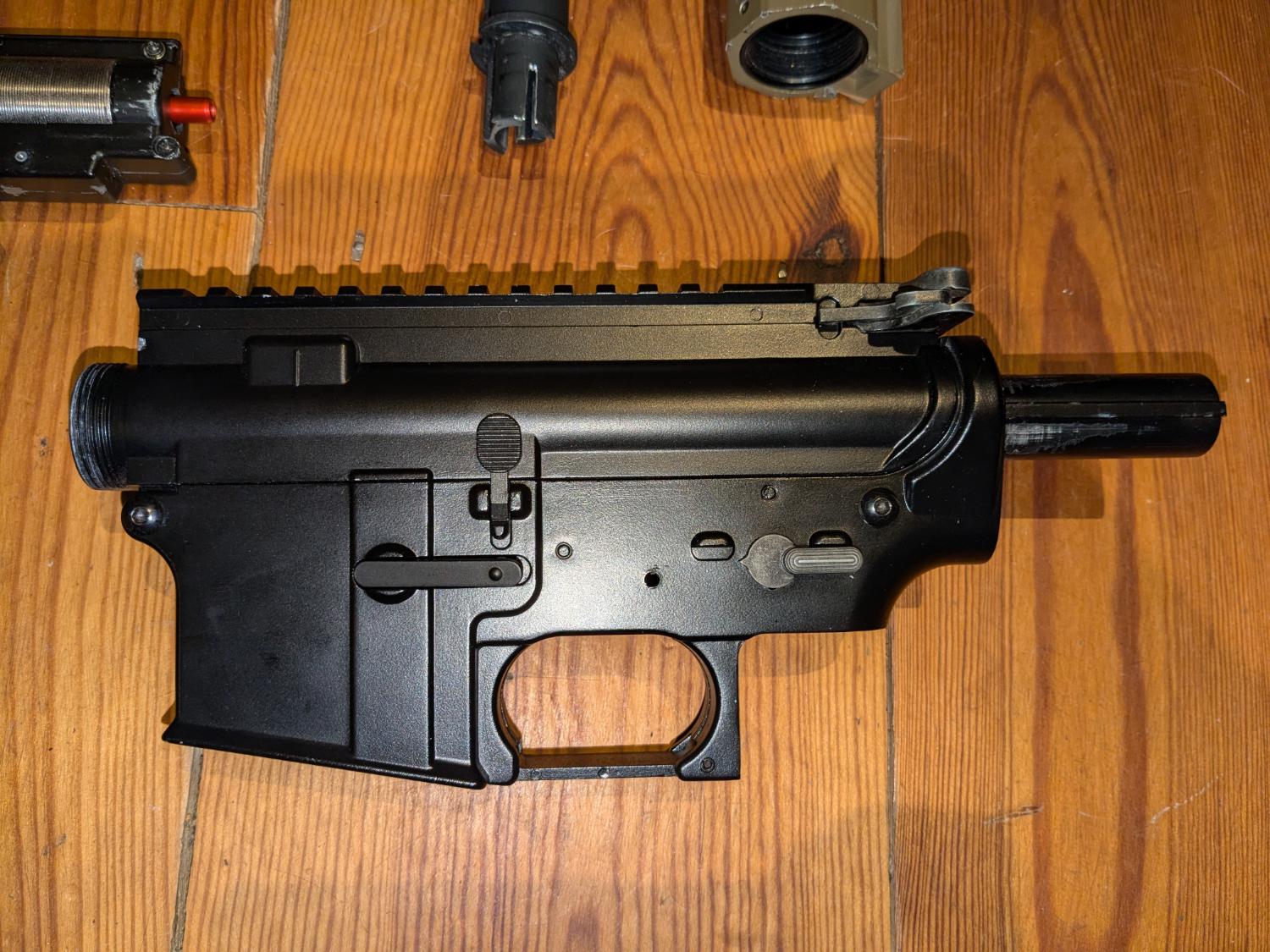 1) M4 Metal Body - comes with body pins and mag release. Unknown manufacturer but decent quality. Has had a respray in the past but only because it was tatty, never been two toned, paint starting to wear in places again. £25 posted
