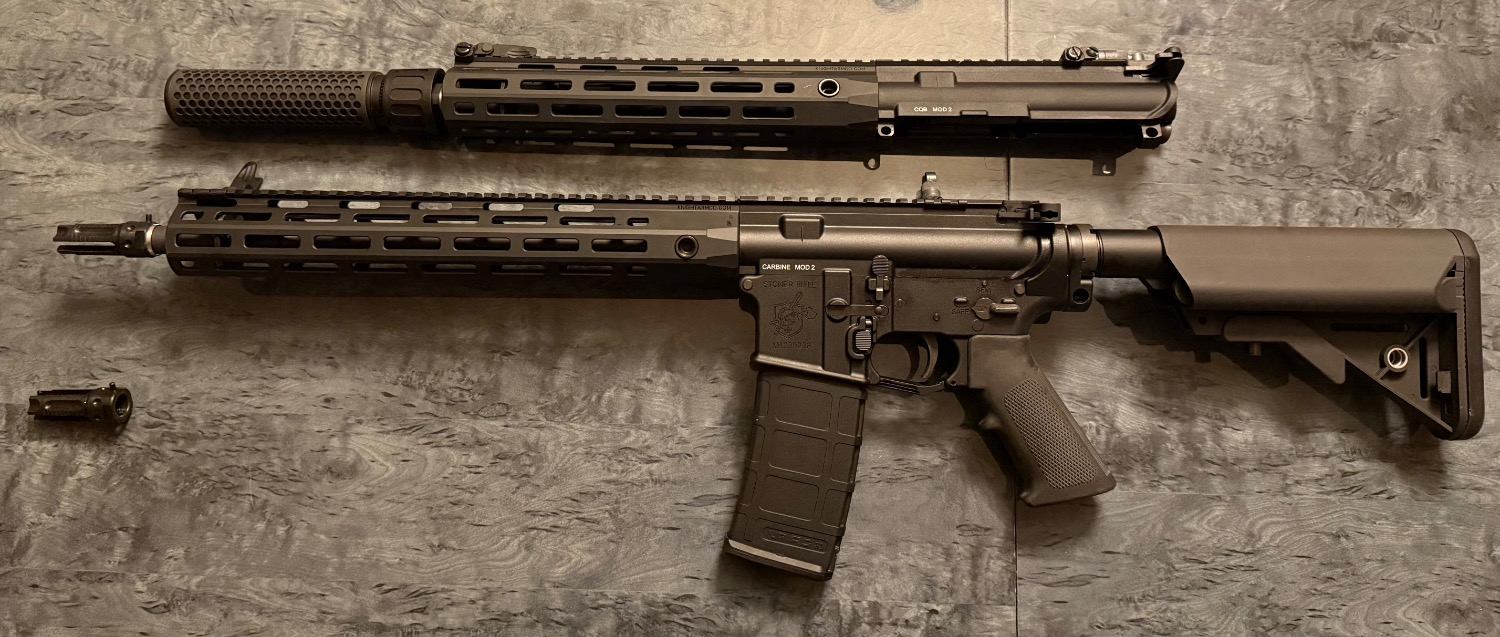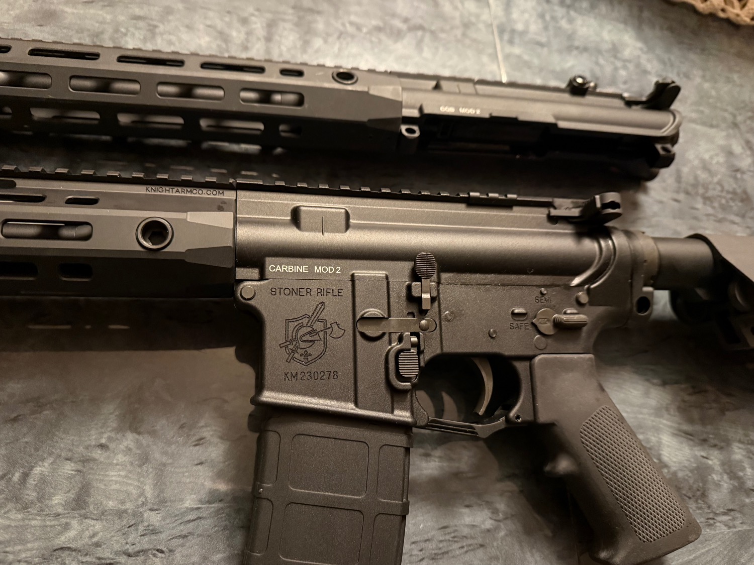 KAC SR-16 14.5” Carbine by VFC, also included is the complete 11.5” CQB upper. Both uppers can be hot swapped on the common lower, both work perfectly. The lower is a VFC V3 lower with all steel internals and comes with a GHK SOPMOD gen 2 stock and BCM pistol grip. Both uppers have steel bolts and the CQB upper comes with the Madbull KAC QDC Suppressor, matching flash hider and VFC BCM vertical grip Mod3 The carbine upper comes with the VFC KAC canted 45 degree iron sights and an Airsoft Artisan KAC Ambi charging handle. Also includes an 11.5” KAC dimpled one piece steel outer barrel by ZParts and a spare gas block for the 11.5” upper. The rifle has 3 QD points on each side for a total of 6. Set comes with 3 mags. These were both wall hangers and have never been used. Handful of rounds through both of them and only some faint superficial marks on the rails where accessories were mounted. Price includes fees and shipping.