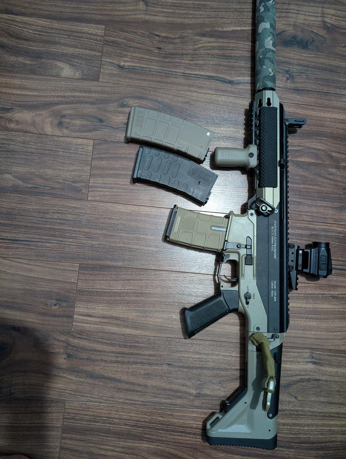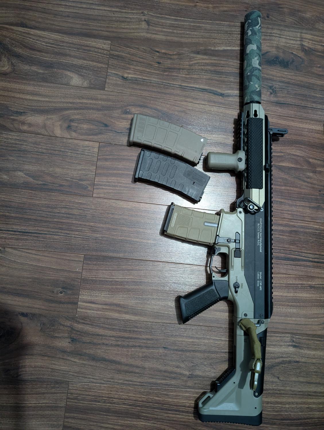 Item comes with 2 mid caps and one high cap as pictured. Will also include a battery not pictured and potentially a sling if I can find it. Pictured grip and suppressor also included.