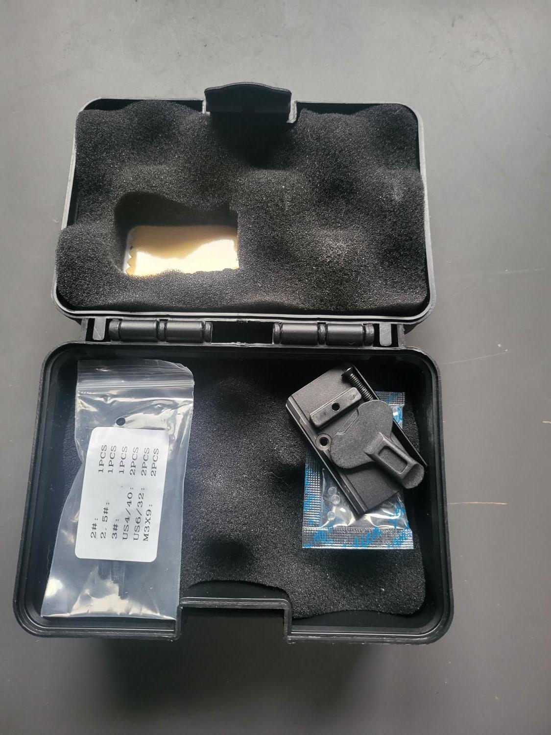 Comes with glock plate and screws along with a picatinny mount. All works as it should no scratches on it