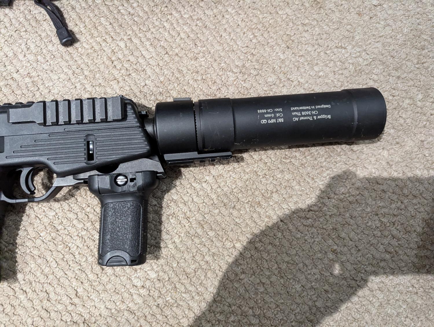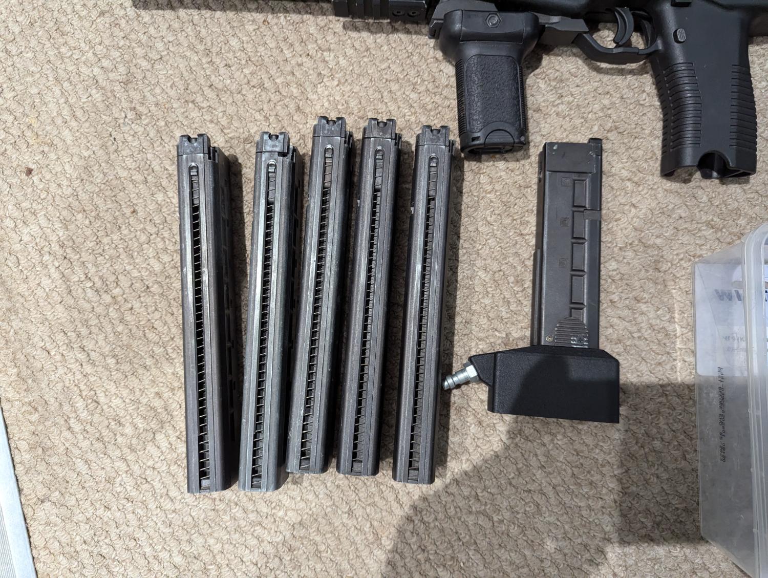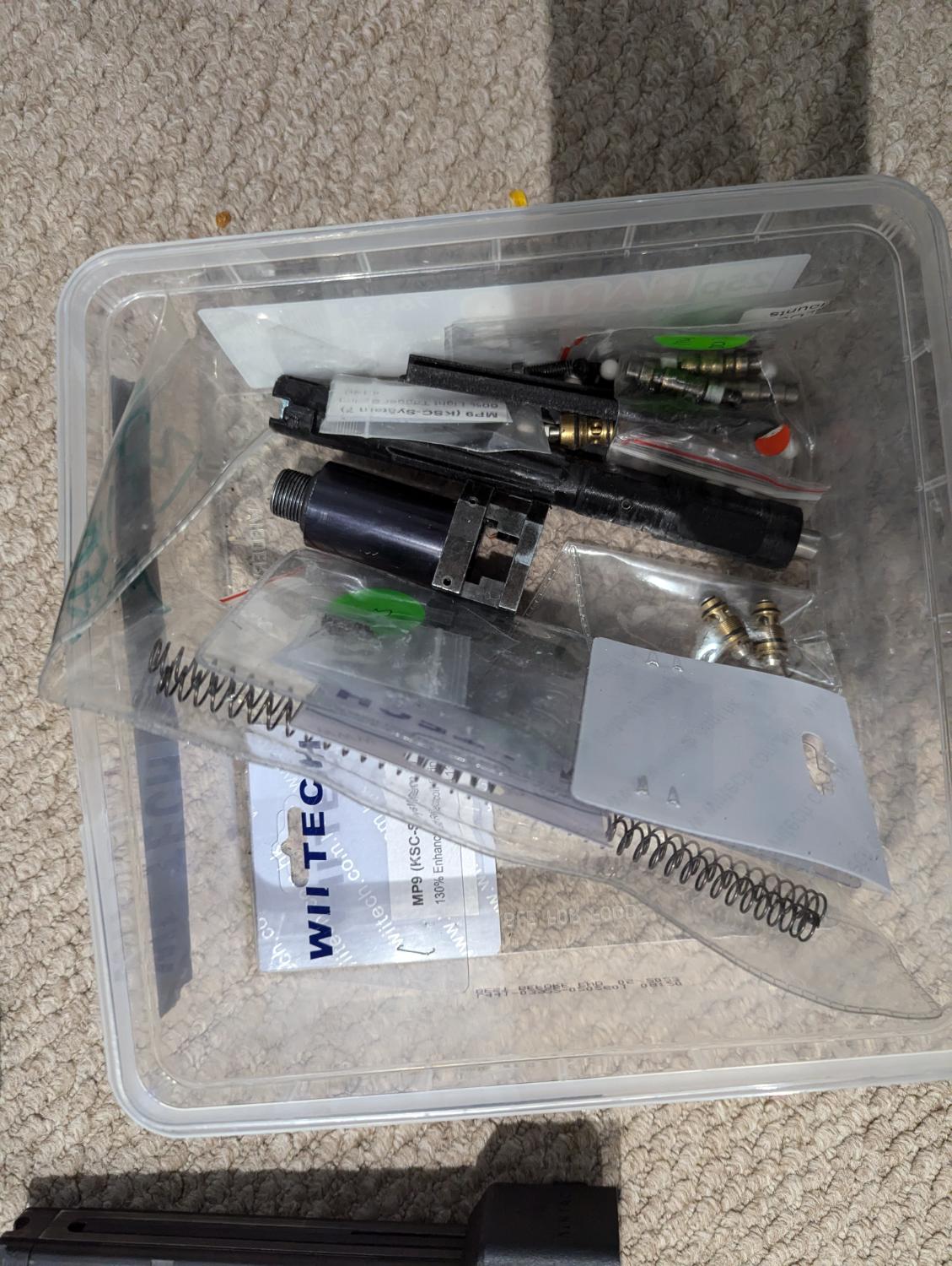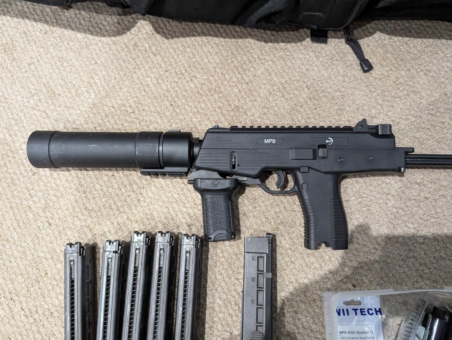 KWA MP9A3 with QD suppressor, 5 leak free mags, an HPA mag adaptor and a box of spares including valves, HPA taps, outer barrels and miscellaneous small parts.