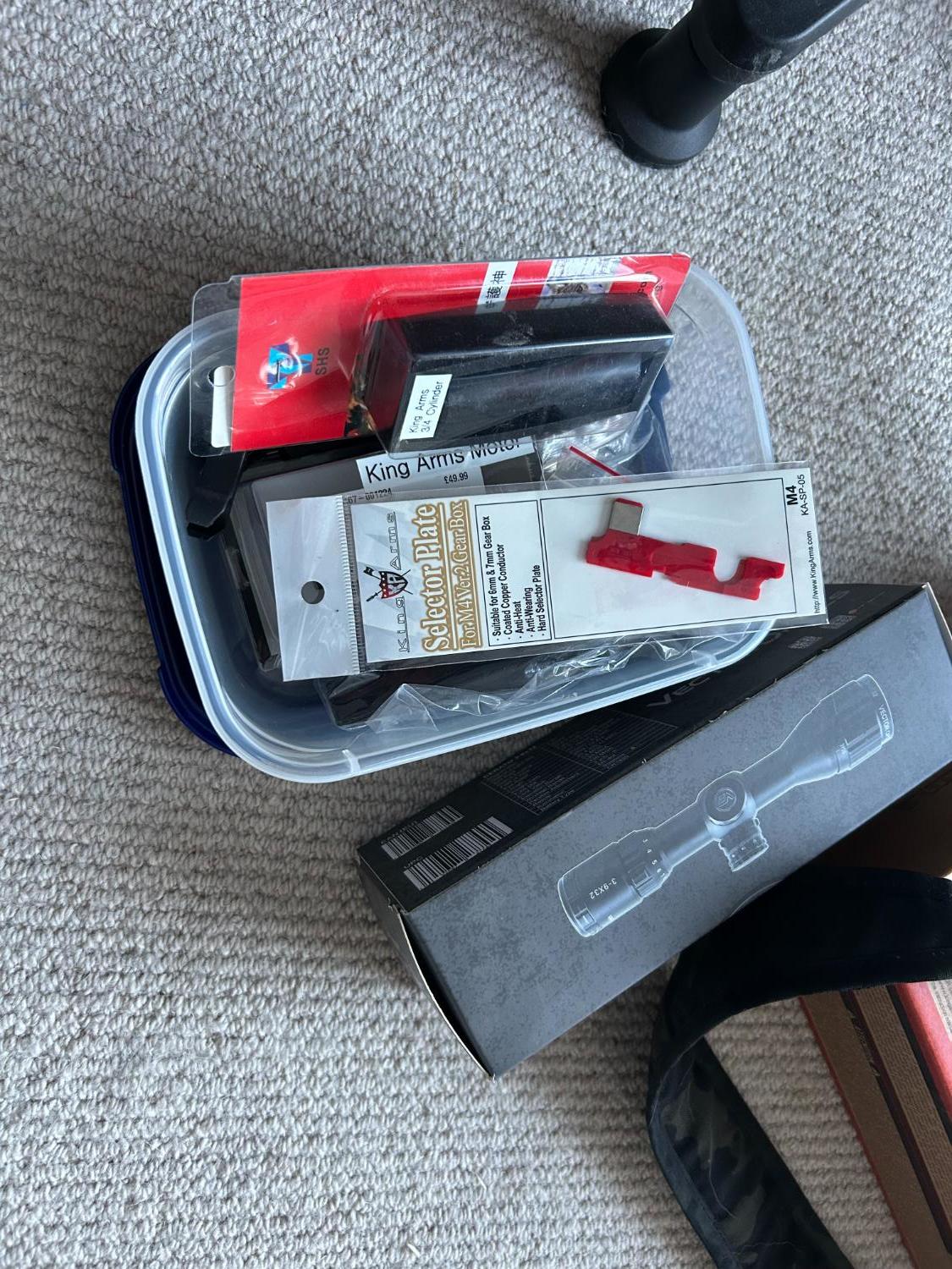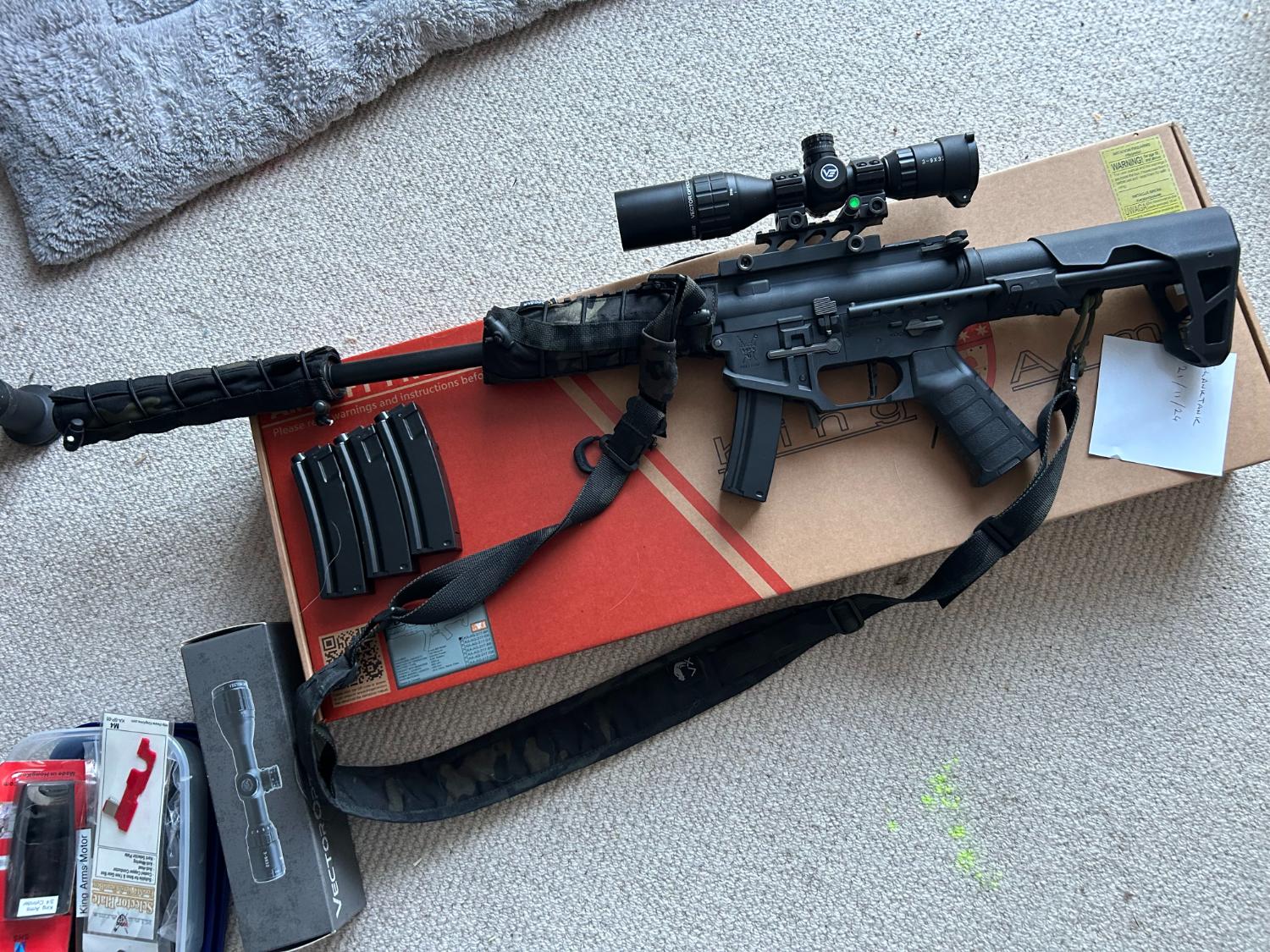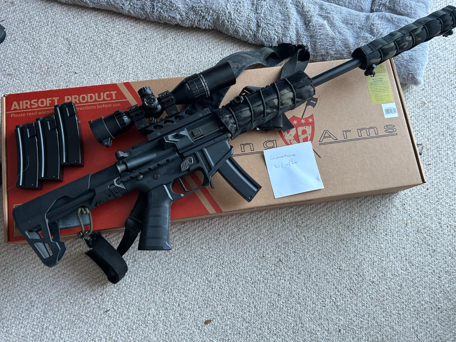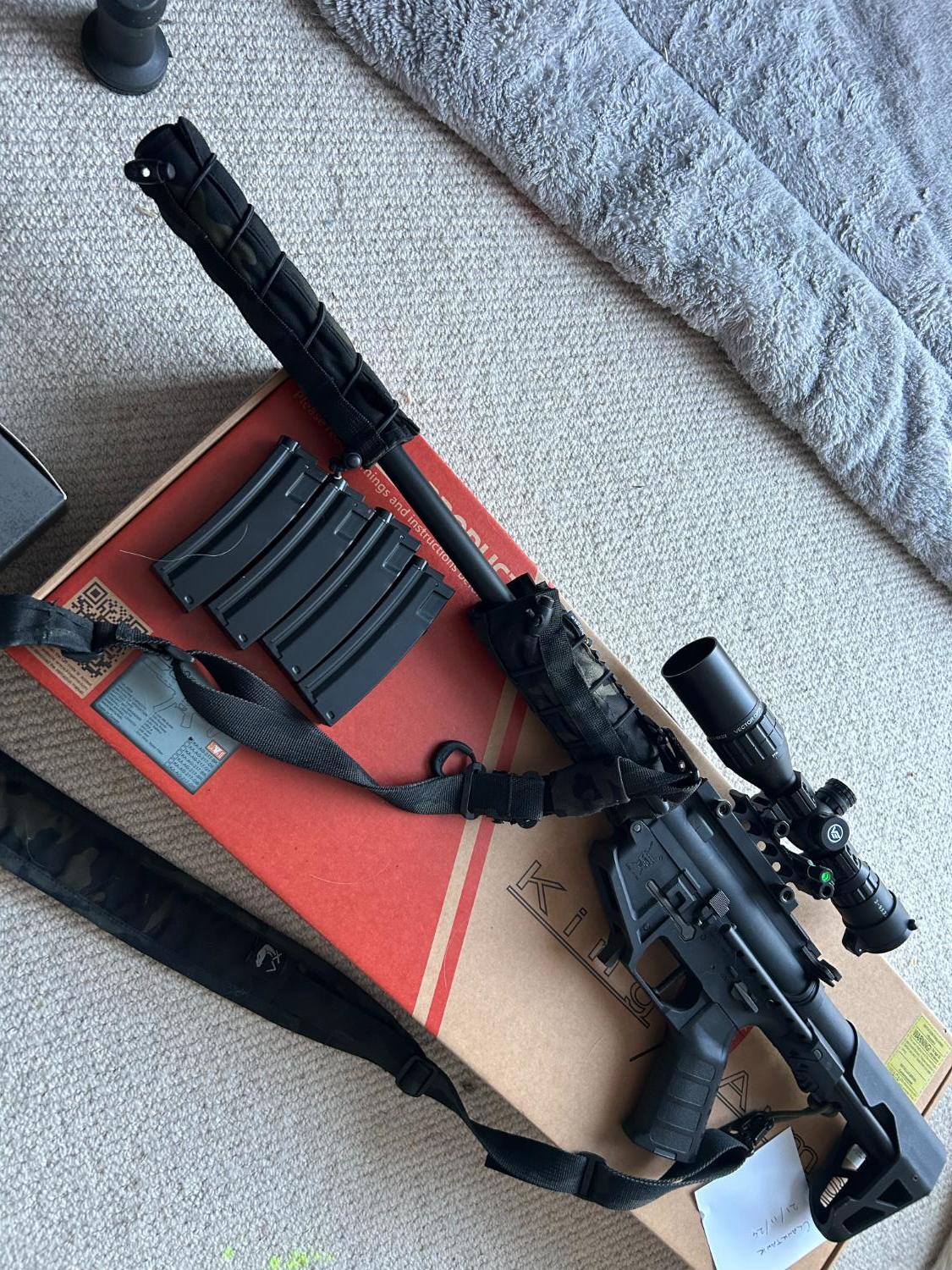 Comes with all original parts, original box, 4x lo-cap mags, two point QR sling, 2x barrel wraps on hand guard and suppressor